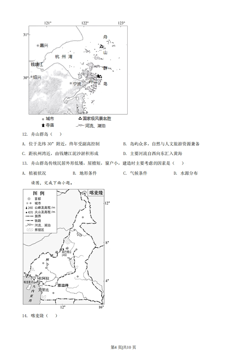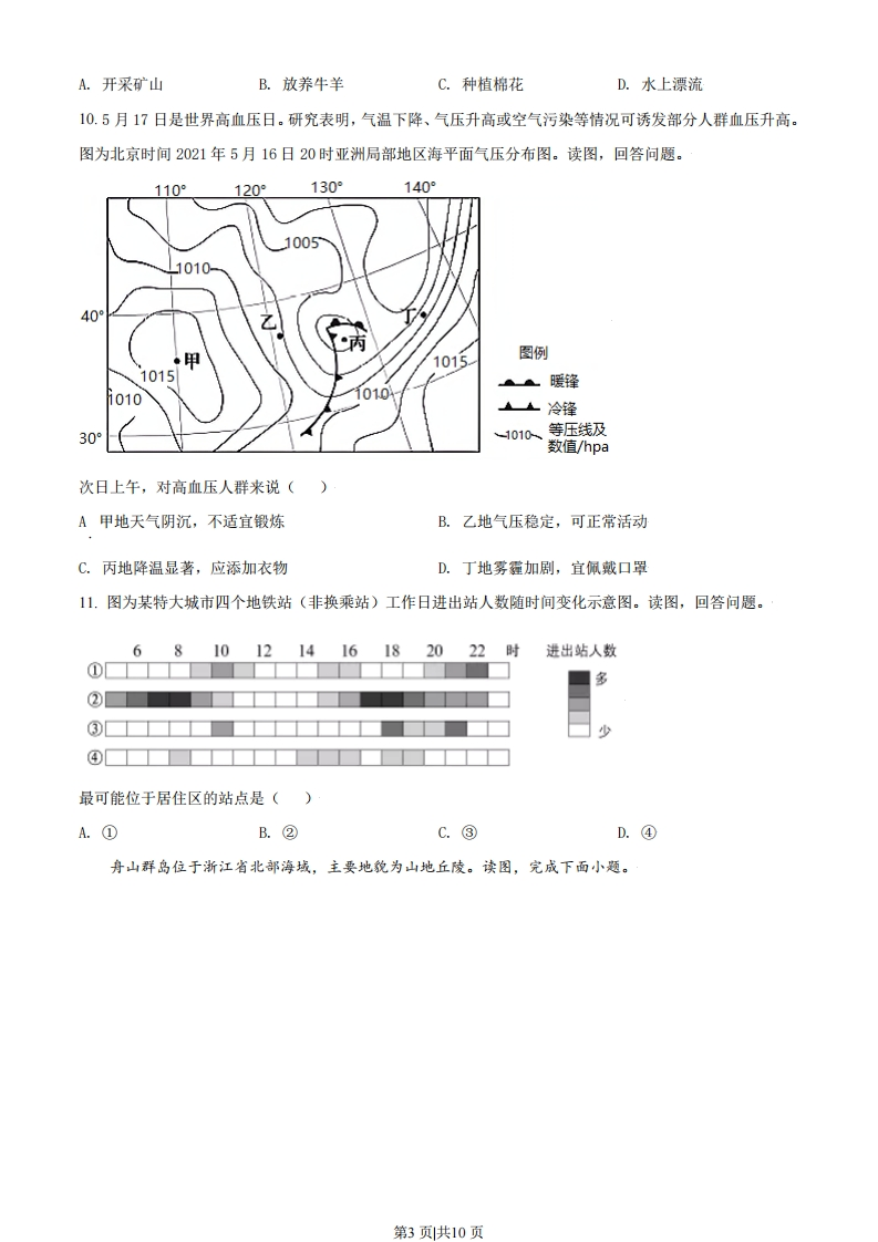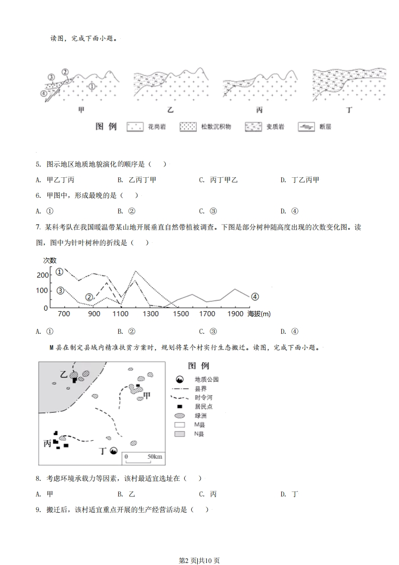 2021年普通高中学业水平等级性考试北京地理注意事项:本试卷共9页,100分。考试时长90分钟。考生务必将答案答在答题卡上,在试卷上作答无效。考试结束后,将本试卷和答题卡一并交回。一、本部分共15题,每题3分,共45分。在每题列出的四个选项中,选出最符合题目要求的一项。我国某镇利用当地主产的粮食制作粮画,打造粮画小镇。图是M学校设计的小镇地理位置指示牌,图b是该校设计的四条“行走的思政课”精华路线示意图。读图,完成下面小题。图例立八义士抗日狗国处436km★古城保卫战透址粮画小镇北京甲⊙粮画展览馆3632*50"N⊙0传统民居保护地1151313"EM学校(出发点)一高速公路一铁路精华路线。河流5km桥a61.该镇()A.位于北京东南方向B.地处华北平原C.粮画原料主要是稻米D.水路交通便捷2.图中最短的精华路线里程约为()A.5千米B.10千米C.15千米D.20千米下图示意北纬27°附近部分地,点某年的平均气温。读图,完成下面小题。气温(C)2321◆◆19◆◆1>1116117118119120121东经()3.影响图中气温高低的主要因素是()A.海拔高度B.大气环流C.海陆位置D.人类活动4.某地理小组连续多日在该纬线附近同一地点用木杆测量正午太阳高度角,记录的木杆影长数值先增大、后减小。该小组测量影长的时间段是()A.立春-惊蛰B.芒种-小暑C.白露-寒露D.大雪-小寒第1页共10页读图,完成下面小题。2④用丙图例。口花岗岩☒松散沉积物图变质岩断层5.图示地区地质地貌演化的顺序是()A.甲乙丁丙B.乙丙丁甲C.丙丁甲乙D.丁乙丙甲6.甲图中,形成最晚的是()A.①B.②C.③D.④7.某科考队在我国暖温带某山地开展垂直自然带植被调查。下图是部分树种随高度出现的次数变化图。读图,图中为针叶树种的折线是()次数200①100③④070090011001300150017001900海拔(m)A.①B.②C.③D.④M县在制定县城内精准扶贫方案时,规划将某个村实行生态搬迁。读图,完成下面小题。图例20O地质公园县界e时令河■居民点O绿洲口M层口N县丙50km8.考虑环境承载力等因素,该村最适宜选址在()A.甲B.乙C.丙D.丁9.搬迁后,该村适宜重点开展的生产经营活动是()第2页共10页