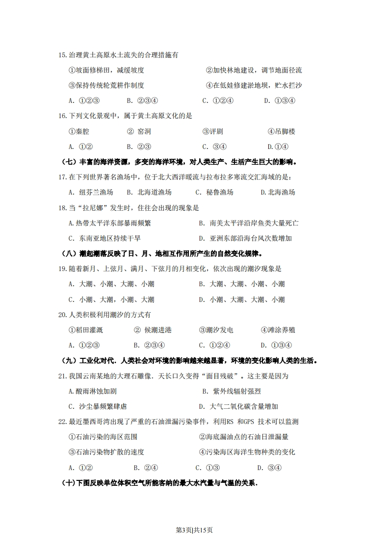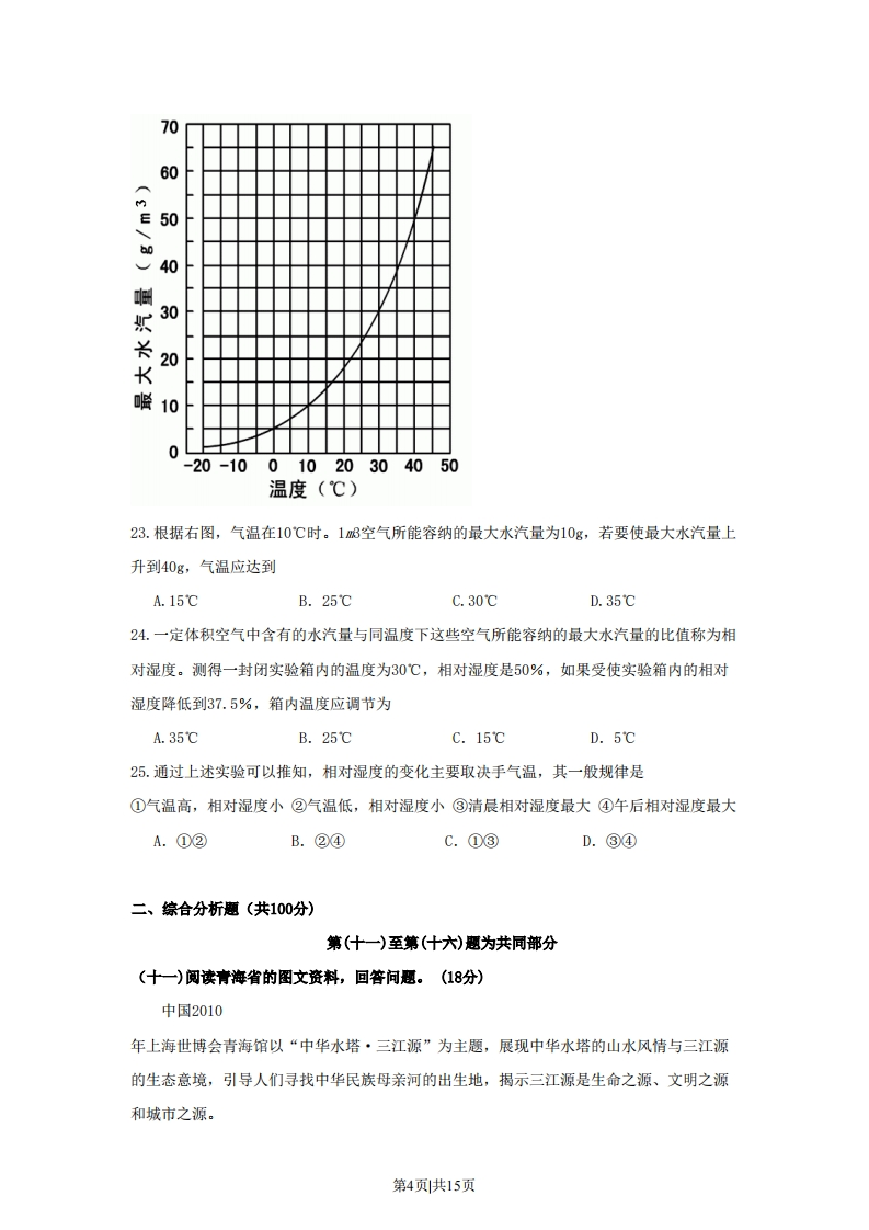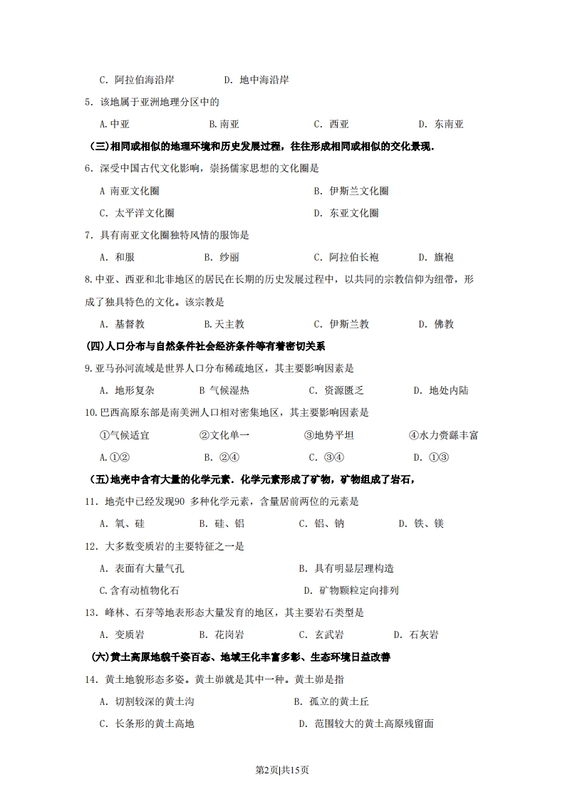 2010年普通高等学校招生全国统一考试(上海卷)地理试卷本试卷共10页,满分150分,考试时间120分钟。全套包括两大趣,第一大题为选择趣:第二大趣为综合分析趣,包括共同部分和选做部分。考生注意:1.答卷前,务必用钢笔或签字笔在答题纸正面清楚地填写姓名、准考证号,并将核对后的条形码贴在指定位置上,在答趣纸反面清楚地填写姓名。2.答案必须全部涂或写在答趣纸上。所有考生应完成第一大趣和第二大趣的共同部分。第二大趣选做部分分为A、B两组,两组试趣分值相同,A组对应于考试手册中“任选模块一”,B组对应于“任选模块二”,考生须任选一组答趣。3.应答选做部分前,应将答趣纸上选做组别的识别框用2B铅笔涂黑:填涂的组别识别框必须与实际应答组别一致,如果不一致,以填涂的组别识别框为准,两组识别框全涂或不涂者得零分。一、选择题(共50分,每小题2分。每小题只有一个正确答案)(一)“城市,让生活更美好”,城市空间结构与城市职能、自然环境密切相关。1.不同的城市职能具有不同的城市空间结构特征。下列叙述正确的是①巴西利亚有多个钢铁工业区②纽约金融区规模大③三亚旅游风景区占地比重大④上海有众多商业区A.①②③B.②③④C.①②④D.①③④2.大连是我国北方的重要沿海城市,哈大铁路线的终点。其城市空间形态表现为A.从中心城区向外均匀扩展B.沿铁路线狭长分布C.以港口为中心向腹地扩展D.沿海岸线绵延分布(二)亚洲某地(约27°N,86°E),蓝天与自云交织,雪山与湖泊辉映…3.该地所属的气候类型是A.热带稀树草原气候B.高原山地气候C.温带大陆性气候D.地中海气候4.该地的相对地理位置位于A.喜马拉雅山脉南侧B.德干高原北部601201亚洲简图第1页共15页C.阿拉伯海沿岸D.地中海沿岸5.该地属于亚洲地理分区中的A.中亚B.南亚C.西亚D.东南亚(三)相同或相似的地理环境和历史发展过程,往往形成相同或相似的交化景现。6.深受中国古代文化影响,崇扬儒家思想的文化圈是A南亚文化圈B.伊斯兰文化圈C.太平洋文化圈D.东亚文化圈7.具有南亚文化圈独特风情的服饰是A.和服B.纱丽C.阿拉伯长袍D.旗袍8.中亚、西亚和北非地区的居民在长期的历史发展过程中,以共同的宗教信仰为纽带,形成了独具特色的文化。该宗教是A.基督教B.天主教C.伊斯兰教D.佛教(四)人口分布与自然条件社会经济条件等有着密切关系9.亚马孙河流域是世界人口分布稀疏地区,其主要影响因素是A.地形复杂B气候湿热C.资源匮乏D.地处内陆10.巴西高原东部是南美洲人口相对密集地区,其主要影响因素是①气候适宜②文化单一③地势平坦④水力赍繇丰富A.①②B.②④C.③④D.①③(五)地壳中含有大量的化学元素.化学元素形成了旷物,矿物组成了岩石,11.地壳中己经发现90多种化学元素,含量居前两位的元素是A.氧、硅B.硅、铝C.铝、钠D.铁、镁12.大多数变质岩的主要特征之一是A.表面有大量气孔B.具有明显层理构造C.含有动植物化石D.矿物颗粒定向排列13.峰林、石芽等地表形态大量发育的地区,其主要岩石类型是A.变质岩B.花岗岩C.玄武岩D.石灰岩(六)黄士高原地貌千姿百态、地域王化丰富多彰、生态环境日益改普14.黄土地貌形态多姿。黄土峁就是其中一种。黄土峁是指A.切割较深的黄土沟B.孤立的黄土丘C.长条形的黄土高地D.范围较大的黄土高原残留面第2页共15页