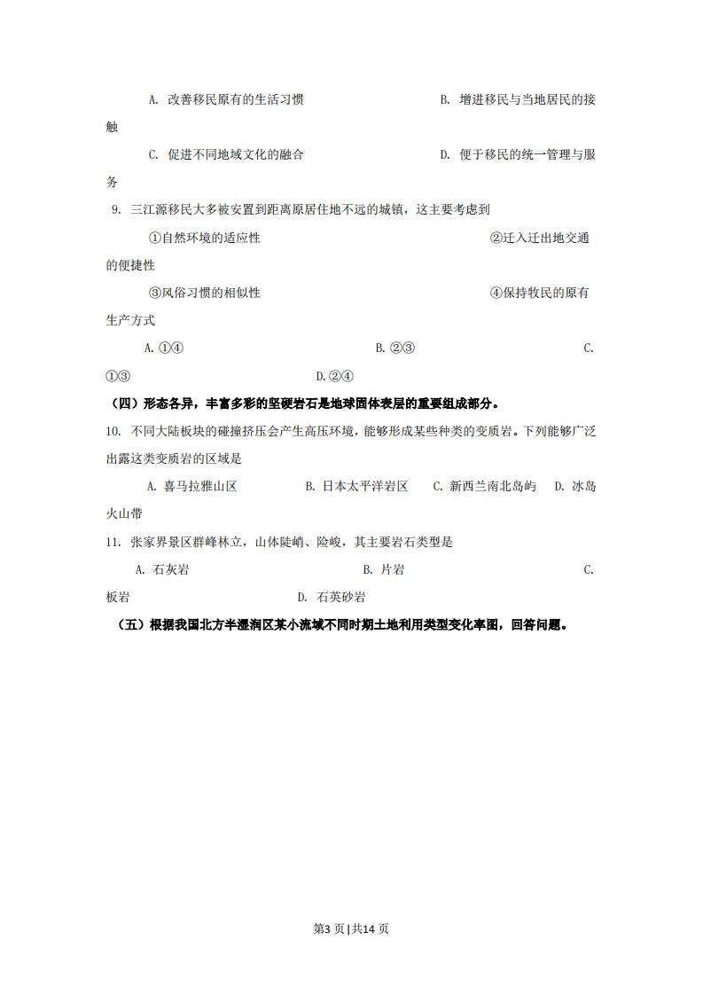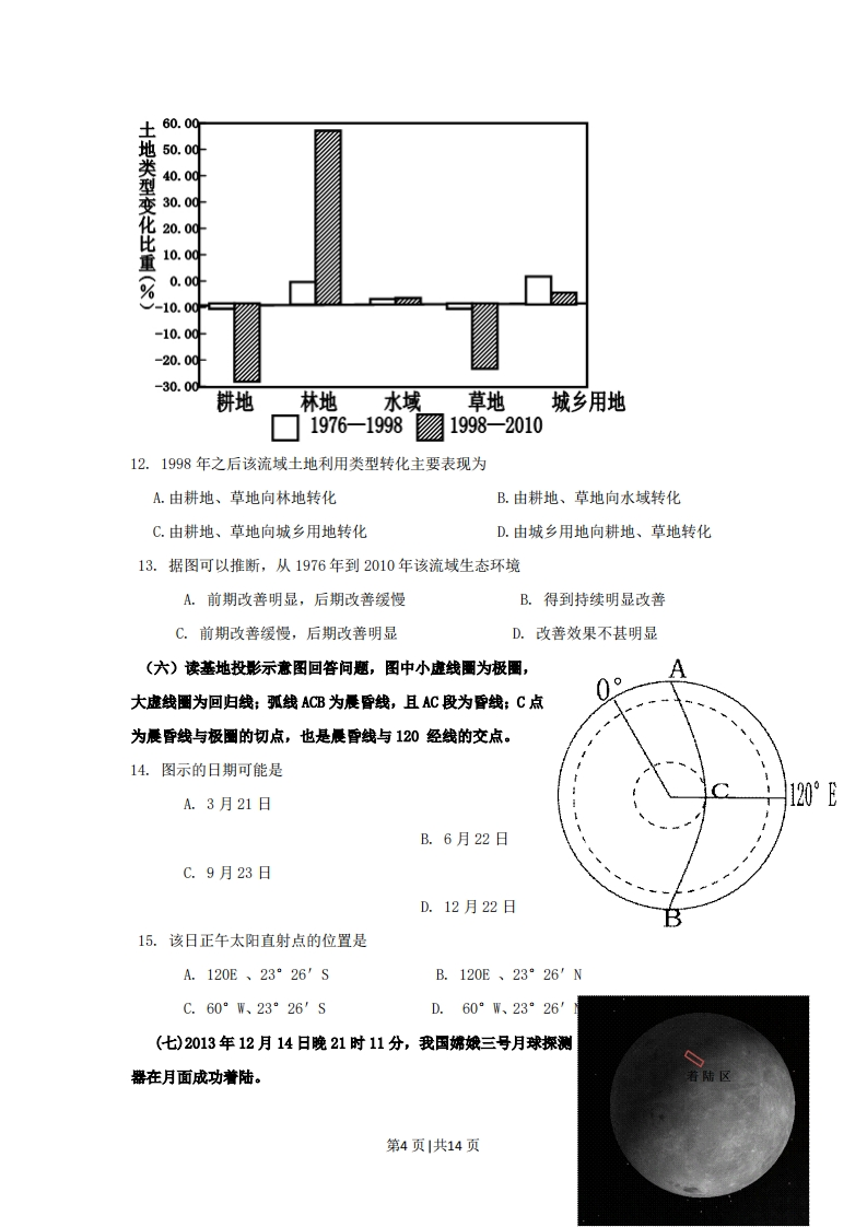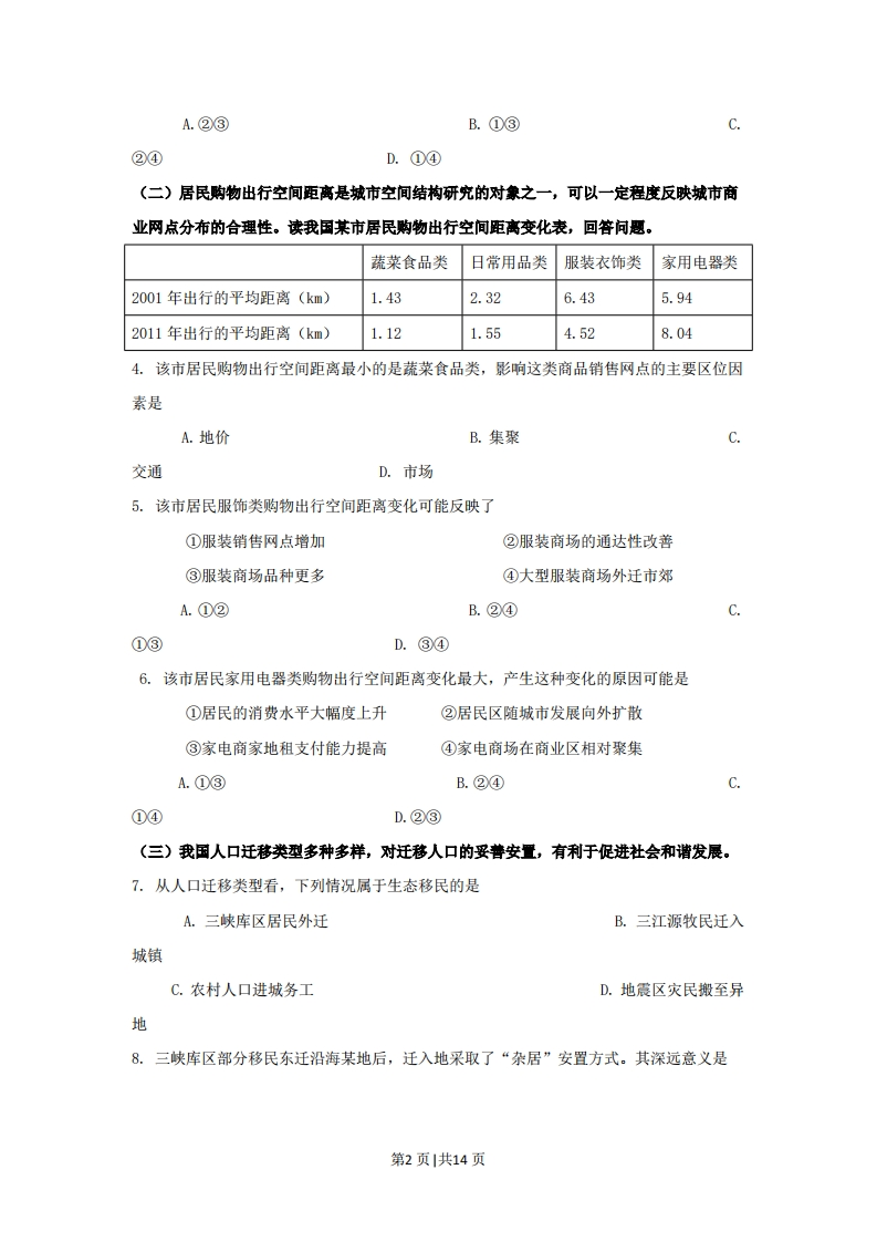 2014年普通高等学校招生全国统一考试(上海卷)地理试卷本试卷共10页,满分150分,考试时间120分钟。全套包括两大趣,第一大趣为选择趣:第二大题为综合分析趣,包括共同部分和选做部分。考生注意:1.答卷前,务必用钢笔或签字笔在答趣纸正面清楚地填写姓名、准考证号,并将核对后的条形码贴在指定位置上,在答趣纸反面清楚地填写姓名。2.答案必须全部涂或写在答题纸上。所有考生应完成第一大题和第二大题的共同部分。第二大题选做部分分为A、B两组,两组试趣分值相同,A组对应于考试手册中“任选模块一”,B组对应于“任选模块二”,考生须任选一组答题。3.应答选做部分前,应将答题纸上选做组别的识别框用2B铅笔涂黑:填涂的组别识别框必须与实际应答组别一致,如果不一致,以填涂的组别识别框为准,两组识别框全涂或不涂者得零分。一、选择题(共60分,每小题2分。每题只有一个正确答案)(一)2014年3月下旬,部金飘香,莱茵欢唱,习近平主席率团对荷兰、法国、德国、比利时进行友好访问。1.在荷兰访问期间,中荷两国签署了文化合作谅解备忘录。荷兰文化缤纷璀璨,其特色文化景观为A.圆顶尖塔的宗教建筑B.热情奔放的探戈舞C.轻柔艳丽的纱礼服师D.风车乳牛田园风光2.代表团访问的欧洲四国中,以核能为支柱能源,并与我国签署新建核电项目的国家是A.法国B.荷兰德国D.比利时3.访问期间,中德两国签署协议,开展燃料电池技术合作,以加快插电式混合动力汽车的产业化步伐。从这一合作项目中我国将获得的主要惠利是①改善大气环境质量②提高汽车工业从业人口的比重③提升汽车工业水平④扩大在德国的新能源汽车市场第1页1共14页A.②③B.①③C.②④D.①④(二)居民购物出行空间距离是城市空间结构研究的对象之一,可以一定程度反映城市商业网点分布的合理性。读我国某市居民购物出行空间距高变化表,回答问题。蔬菜食品类日常用品类服装衣饰类家用电器类2001年出行的平均距离(km)1.432.326.435.942011年出行的平均距离(km)1.121.554.528.044.该市居民购物出行空间距离最小的是蔬菜食品类,影响这类商品销售网点的主要区位因素是A.地价B.集聚c交通D.市场5.该市居民服饰类购物出行空间距离变化可能反映了①服装销售网点增加②服装商场的通达性改善③服装商场品种更多④大型服装商场外迁市郊A.①②B.②④C.①③D.③④6.该市居民家用电器类购物出行空间距离变化最大,产生这种变化的原因可能是①居民的消费水平大幅度上升②居民区随城市发展向外扩散③家电商家地租支付能力提高④家电商场在商业区相对聚集A.①③B.②④C.①④D.②③(三)我国人口迁移类型多种多样,对迁移人口的妥普安置,有利于促进社会和谐发展。7.从人口迁移类型看,下列情况属于生态移民的是A.三峡库区居民外迁B.三江源牧民迁入城镇C.农村人口进城务工D.地震区灾民搬至异地8.三峡库区部分移民东迁沿海某地后,迁入地采取了“杂居”安置方式。其深远意义是第2页|共14页
