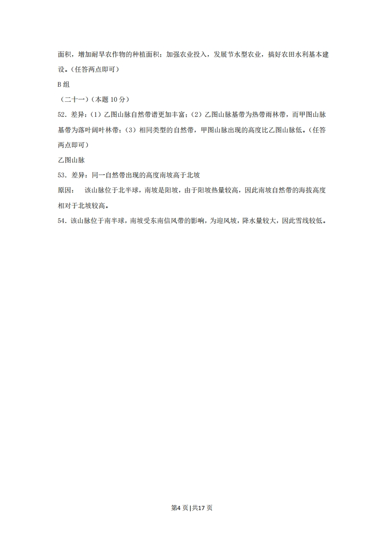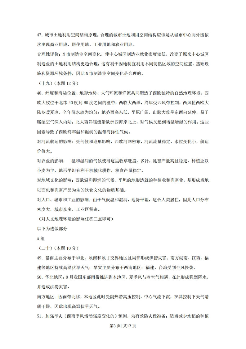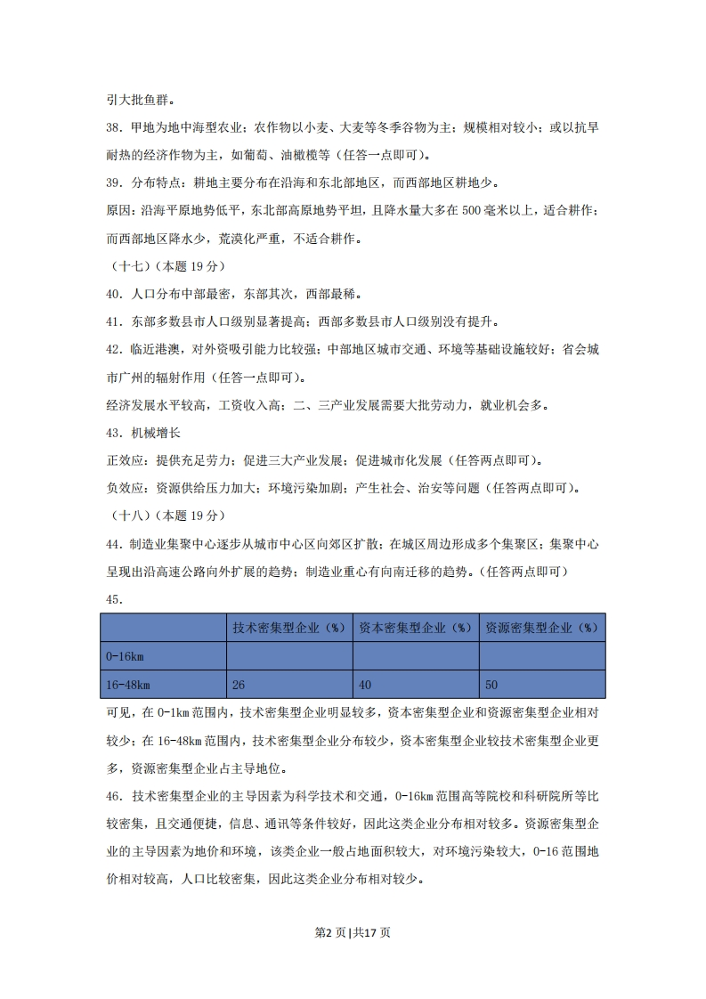 2013年普通高等学校招生全国统一考试(上海卷)地理试卷参考答案选择题(共60分,每小题2分)(-)1.A2.D(二)3.D4.A(三)5.C6.C(四)7.B8.A(五)9.B10.C(六)11.D12.B(七)13.D14.C(八)15.C16.D17.A(九)18.C19.B20.D(十)21.A22.C(十一)23.C24.A(十二)25.B26.D(十三)27.C28.D(十四)29.A30.B二.综合分析题(共90分)考生回答合理可酌情给分第(十五)至第(十九)题为共同部分(十五)(本题14分)31.3,532.135°W,11°43'N33.16°34',5634.延长,减慢35.移动方向:向北移动。该移动会造成南亚地区降水丰富,因为北移的东南信风越过赤道,受地球自转影响,风向右偏形成西南季风,西南季风掠过暖湿的印度洋洋面,带来丰沛的降水。该移动会导致澳大利亚北部干旱少雨,因为该区在这一期间转为受干燥的东南信风控制,所以干旱少雨。(十六)(本题16分)36.位于非洲大陆最南部,东、南临印度洋,西濒大西洋。优:地处两大洋间的航运要冲,西南部的好望角航线是世界上最繁忙的海上通道之一。(任答一点即可)劣:好望角的航线长,交通运输成本较高:好望角航线航线有风浪危险。(任答一点即可)37.南非南部沿海有本格拉寒流和厄加勒斯暖流交汇,西部沿海出现甬升流,为西部、南部沿海带来大量营养物质,有利于浮游生物的生长,浮游生物又为鱼类提供了丰富的饵料,吸第1页1共17页引大批鱼群。38.甲地为地中海型农业:农作物以小麦、大麦等冬季谷物为主:规模相对较小:或以抗旱耐热的经济作物为主,如葡萄、油橄榄等(任答一点即可)。39.分布特点:耕地主要分布在沿海和东北部地区,而西部地区耕地少。原因:沿海平原地势低平,东北部高原地势平坦,且降水量大多在500毫米以上,适合耕作:而西部地区降水少,荒漠化严重,不适合耕作。(十七)(本题19分)40.人口分布中部最密,东部其次,西部最稀。41.东部多数县市人口级别显著提高:西部多数县市人口级别没有提升。42.临近港澳,对外资吸引能力比较强:中部地区城市交通、环境等基础设施较好:省会城市广州的辐射作用(任答一点即可)。经济发展水平较高,工资收入高:二、三产业发展需要大批劳动力,就业机会多。43.机械增长正效应:提供充足劳力:促进三大产业发展:促进城市化发展(任答两点即可)。负效应:资源供给压力加大:环境污染加剧:产生社会、治安等问题(任答两点即可)。(十八)(本题19分)44.制造业集聚中心逐步从城市中心区向郊区扩散:在城区周边形成多个集聚区:集聚中心呈现出沿高速公路向外扩展的趋势:制造业重心有向南迁移的趋势。(任答两点即可)45.技术密集型企业(%)资本密集型企业(%)资源密集型企业(%)0-16km16-48km264050可见,在0-1km范围内,技术密集型企业明显较多,资本密集型企业和资源密集型企业相对较少:在16-48km范围内,技术密集型企业分布较少,资本密集型企业较技术密集型企业更多,资源密集型企业占主导地位。46.技术密集型企业的主导因素为科学技术和交通,0-16km范围高等院校和科研院所等比较密集,且交通便捷,信息、通讯等条件较好,因此这类企业分布相对较多。资源密集型企业的主导因素为地价和环境,该类企业一般占地面积较大,对环境污染较大,0-16范围地价相对较高,人口比较密集,因此这类企业分布相对较少。第2页1共17页