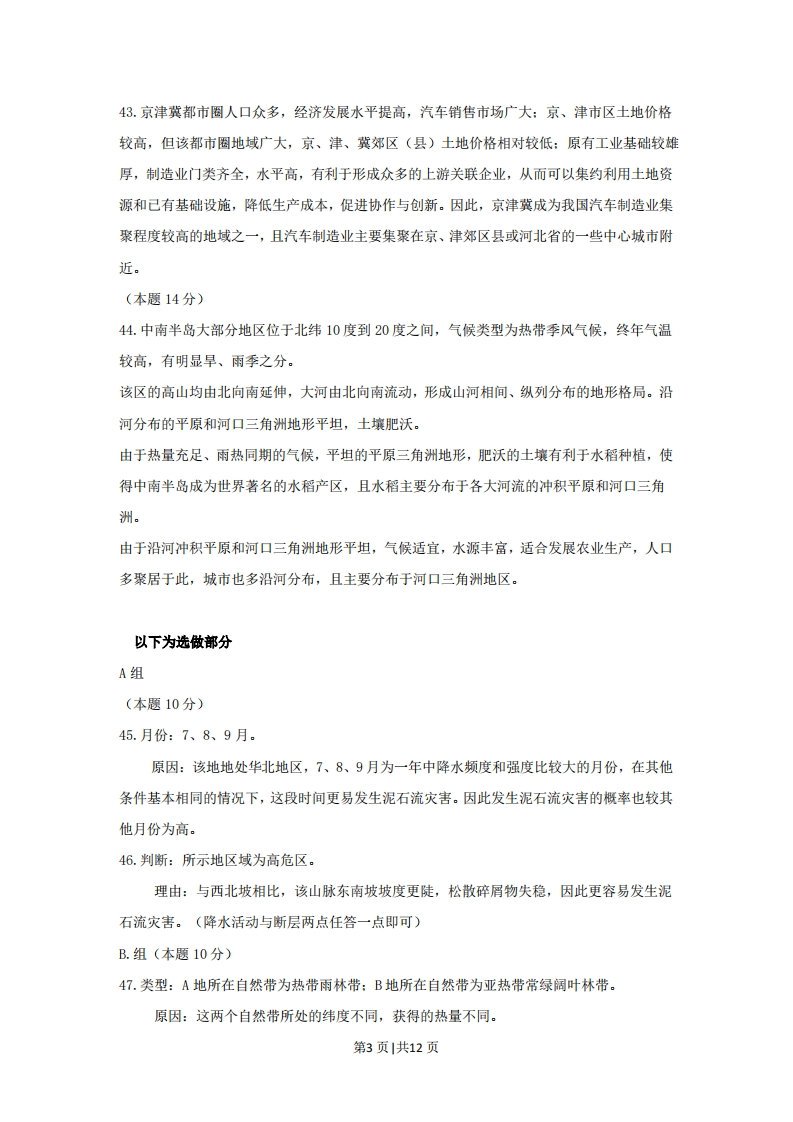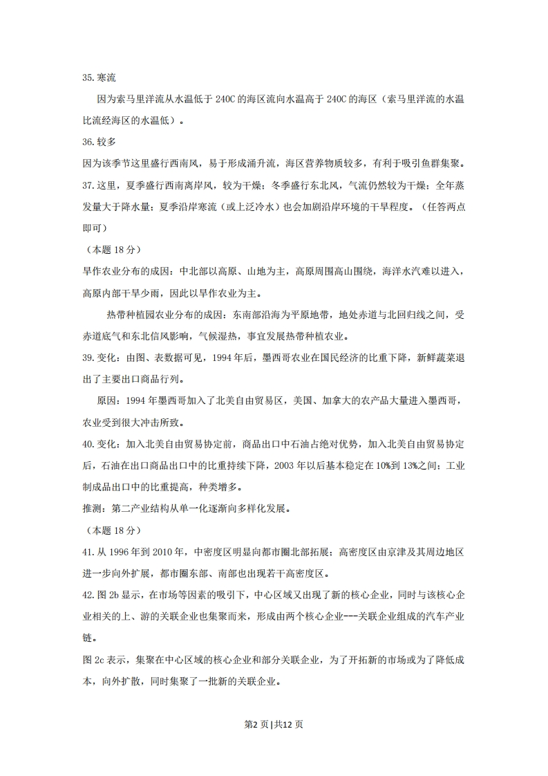 2014年普通高等学校招生全国统一考试(上海卷)地理试卷参考答案选择题(共60分,每小题2分)()1.D2.A3.B(二)4.D5.C6.B(三)7.B8.C9.C(四)10.A11.D(五)12.A13.C(六)14.D15.C(七)16.B17.A(八)18.D19.D(九)20.D21.A22.B(十)23.A24.B(十一)25.C26.A27.C(十二)28.A29.B30.D二、综合分析题(共90分)(十三)(本题14分)31.北岸岸线向陆地凹,南岸岸线向海湾凸。32.在地转偏向力的作用下,海浪向北偏折,使北岸易于遭受侵蚀:夏秋季节,盛行东南风,北岸成为迎风岸,也易遭受海浪的冲刷。33.距离远近差异:杭州湾北岸城镇、公路距岸线很近,甚至紧贴岸线:而杭州湾南岸,城镇、公路距岸线相对较远。北岸建设需要注意问题:由于杭州湾北岸易于遭受海浪冲刷,岸线向后退缩,城镇与公路建设应该向背离岸线的方向拓展,采取措施,防治海岸崩塌、后退。南岸建设需要注意问题:由于南岸快速淤涨,滩涂面积较大,城镇建设中可以适当利用滩涂荒地:注意保护滩涂湿地生态环境(任答一点即可)(本题16分)34.夏季太阳直射点位于北半球,南半球的东南信风北移越过赤道,在地转偏向力的作用下,偏转成强劲的西南季风,驱动索马里沿岸的洋流向北运动。第1页|共12页35.寒流因为索马里洋流从水温低于240C的海区流向水温高于240C的海区(索马里洋流的水温比流经海区的水温低)。36.较多因为该季节这里盛行西南风,易于形成涌升流,海区营养物质较多,有利于吸引鱼群集聚。37.这里,夏季盛行西南离岸风,较为干燥:冬季盛行东北风,气流仍然较为干燥:全年蒸发量大于降水量:夏季沿岸寒流(或上泛冷水)也会加剧沿岸环境的干旱程度。(任答两点即可)(本题18分)旱作农业分布的成因:中北部以高原、山地为主,高原周围高山围绕,海洋水汽难以进入,高原内部干旱少雨,因此以旱作农业为主。热带种植园农业分布的成因:东南部沿海为平原地带,地处赤道与北回归线之间,受赤道底气和东北信风影响,气候湿热,事宜发展热带种植农业。39.变化:由图、表数据可见,1994年后,墨西哥农业在国民经济的比重下降,新鲜蔬菜退出了主要出口商品行列。原因:1994年墨西哥加入了北美自由贸易区,美国、加拿大的农产品大量进入墨西哥,农业受到很大冲击所致。40.变化:加入北美自由贸易协定前,商品出口中石油占绝对优势,加入北美自由贸易协定后,石油在出口商品出口中的比重持续下降,2003年以后基本稳定在10%到13%之间:工业制成品出口中的比重提高,种类增多。推测:第二产业结构从单一化逐渐向多样化发展。(本题18分)41.从1996年到2010年,中密度区明显向都市圈北部拓展:高密度区由京津及其周边地区进一步向外扩展,都市圈东部、南部也出现若干高密度区。42.图2b显示,在市场等因素的吸引下,中心区域又出现了新的核心企业,同时与该核心企业相关的上、游的关联企业也集聚而来,形成由两个核心企业-一关联企业组成的汽车产业链。图2c表示,集聚在中心区域的核心企业和部分关联企业,为了开拓新的市场或为了降低成本,向外扩散,同时集聚了一批新的关联企业。第2页|共12页
