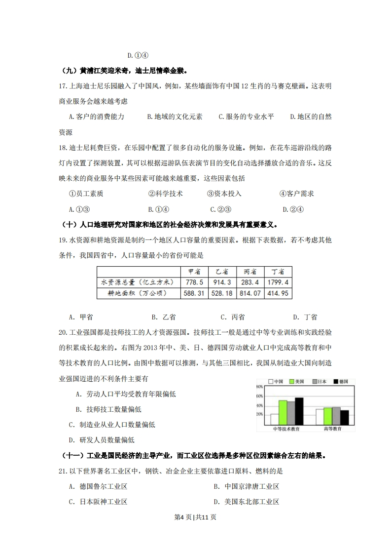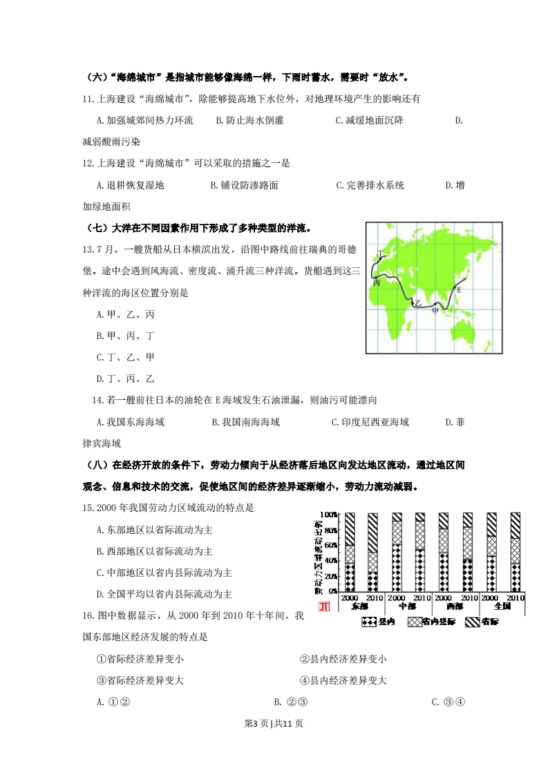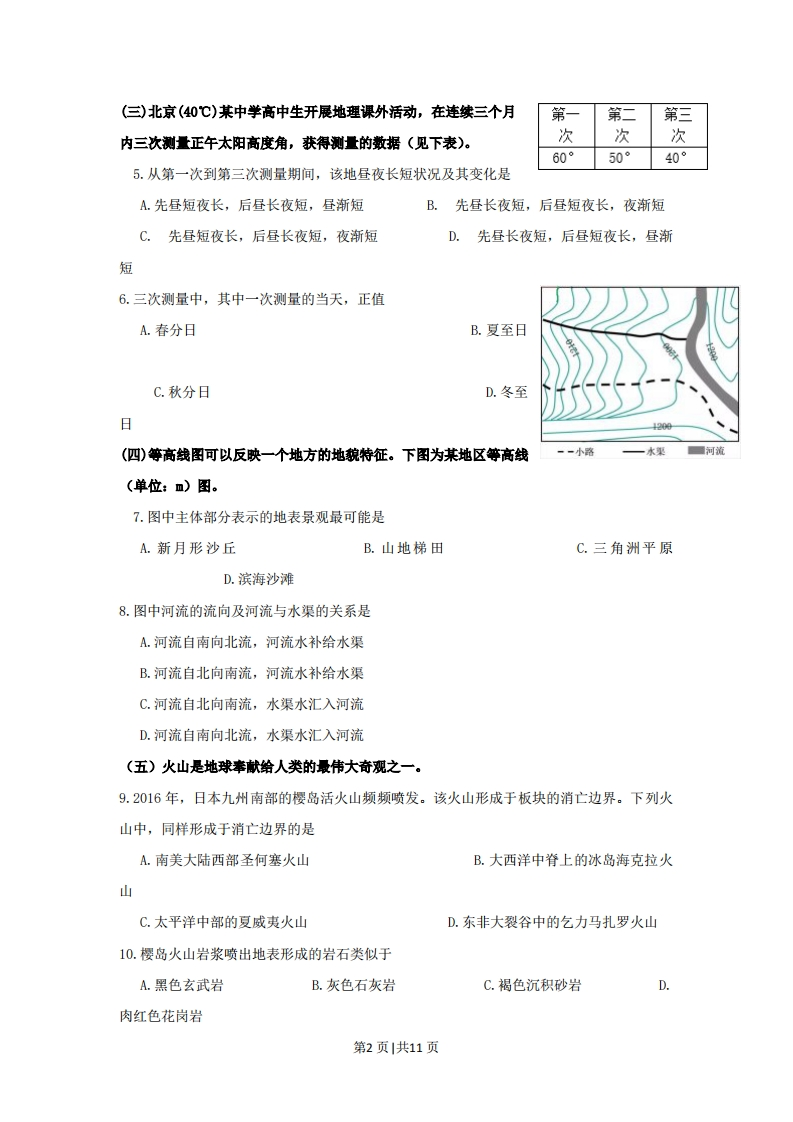 2016年普通高等学校招生全国统一考试(上海卷)地理试卷本试卷共10页,满分150分,考试时间120分钟。全套包括两大趣,第一大题为选择趣:第二大趣为综合分析趣,包括共同部分和选做部分。考生注意:1.答卷前,务必用钢笔或签字笔在答趣纸正面清楚地填写姓名、准考证号,并将核对后的条形码贴在指定位置上,在答趣纸反面清楚地填写姓名。2.答案必须全部涂或写在答趣纸上。所有考生应完成第一大趣和第二大趣的共同部分。第二大趣选做部分分为A、B两组,两组试趣分值相同,A组对应于考试手册中“任选模块一”,B组对应于“任选模块二”,考生须任选一组答趣。3.应答选做部分前,应将答趣纸上选做组别的识别框用2B铅笔涂黑:填涂的组别识别框必须与实际应答组别一致,如果不一致,以填涂的组别识别框为准,两组识别框全涂或不涂者得零分。一、选择题(共60分,每小题2分。每小题只有一个正确答案)(一)太空中隐熏着无限的奥秘,人类对太空的探索越来越深入…1.人类在探月过程中发现,月球表面覆盖着厚厚的月壤。月壤的形成主要是由于月球表面A.平均温度过低B.平均温度过高C.温度变化无常D.昼夜温差过大2.2018年我国将发射嫦娥4号飞行器,实现人类首次在月球背面软着陆。飞行器在月球表面会受到诸多来自宇宙空间的威胁,其中人类难以估计的威胁可能是月球表面A.空气太稀薄B.宇宙辐射太强C.陨石撞击太多D.月球引力太小(二)下图为北半球中纬度某地,半个月内清展6点出现的月相示意图。3.当月球出现在天际最高位置甲处时,其月相是A.满月B.上弦月C.新月D.下弦月4.当月球出现在天际的乙位置时,有可能发生的现象是A.日食、大潮B.日食、小潮C.月食、大潮D.月食、小潮第1页1共11页(三)北京(40℃)某中学高中生开展地理课外活动,在连续三个月第一第二第三内三次测量正午太阳高度角,获得测量的数据(见下表)。次次次60°50040°5.从第一次到第三次测量期间,该地昼夜长短状况及其变化是A.先昼短夜长,后昼长夜短,昼渐短B.先昼长夜短,后昼短夜长,夜渐短C.先昼短夜长,后昼长夜短,夜渐短D.先昼长夜短,后昼短夜长,昼渐短6.三次测量中,其中一次测量的当天,正值A.春分日B.夏至日C.秋分日D.冬至日(四)等高线图可以反映一个地方的地貌特征。下图为某地区等高线一一小路一水果■河流(单位:)图。7.图中主体部分表示的地表景观最可能是A.新月形沙丘B.山地梯田C.三角洲平原D.滨海沙滩8.图中河流的流向及河流与水渠的关系是A.河流自南向北流,河流水补给水渠B.河流自北向南流,河流水补给水渠C.河流自北向南流,水渠水汇入河流D.河流自南向北流,水渠水汇入河流(五)火山是地球奉献给人类的最伟大奇观之一。9.2016年,日本九州南部的樱岛活火山频频喷发。该火山形成于板块的消亡边界。下列火山中,同样形成于消亡边界的是A.南美大陆西部圣何塞火山B.大西洋中脊上的冰岛海克拉火山C.太平洋中部的夏威夷火山D.东非大裂谷中的乞力马扎罗火山10.樱岛火山岩浆喷出地表形成的岩石类似于A.黑色玄武岩B.灰色石灰岩C.褐色沉积砂岩D.肉红色花岗岩第2页1共11页