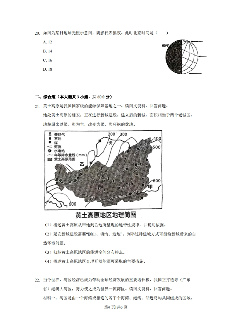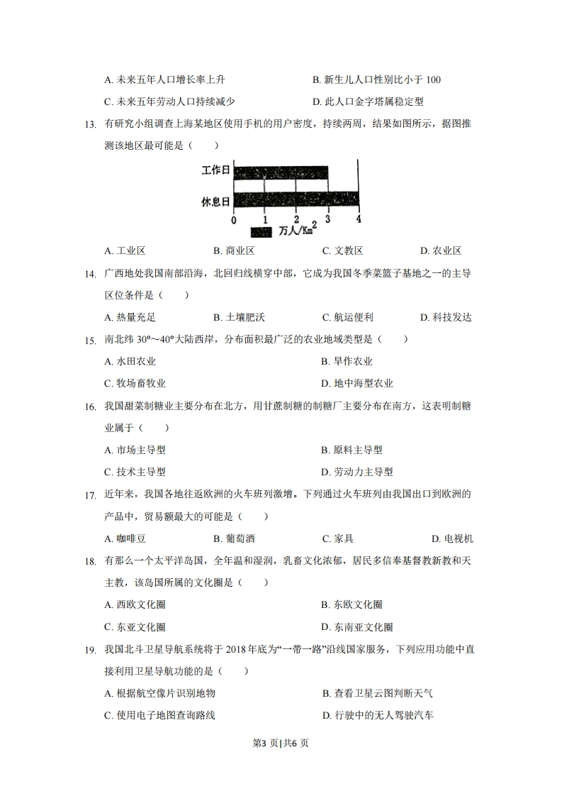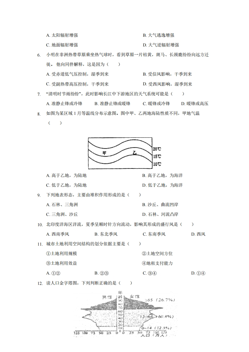 2018年上海市普通高中学业水平等级性考试地理试卷考生注意:1.试卷满分100分,考试时间60分钟。2.本考试分设试卷和答题纸。试卷包括两部分,第一部分为选择题,第二部分为综合分析题,所有试题均为简答题。3.答题前,务必在答题纸上填写姓名、报名号、考场号和座位号,并将核对后的条形码贴在指定位置上。作答必须涂或写在答题纸上,在试卷上作答一律不得分。第一部分的作答必须涂在答题纸上相应的区域,第二部分的作答必须写在答题纸上与试卷题号对应的位置。一、单选题(本大题共20小题,共40.0分)1.“春潮又涌动,扬帆再奋发”。2018年我国决定海南全岛建设海南自由贸易试验区和中国特色自由贸易港。这将进一步促进海南省()A.产业结构优化与升级B.工业比重大幅提高C.城市农业用地扩大D.粮食出口迅速增加2.“涛之起也,随月盛衰”。下列地月位置关系中(白色为光照面),表示会出现大潮的是()月②地A.①②B.①③C.②③D.②④3.下列地表形态,由板块张裂形成的是()A.阿尔卑斯山脉B.喜马拉雅山脉C.太平洋洋脊D.马里亚纳海沟4.我国学者利用溶洞内的石笋,研究全球气候变化,该岩石属于()A.花岗岩B.玄武岩C.大理岩D.石灰岩5.大气中温室气体含量上升引起的变化是()第1页共6页A.太阳辐射增强B.大气逃逸增强C.地面辐射增强D.大气逆辐射增强6.小明在非洲热带草原乘坐热气球时,看到草原一片枯黄,斑马、长颈鹿纷纷向远方迁徙。他向同伴解释,这是因为()A.受赤道低气压控制,湿季到来B.受信风影响,干季到来C.受副热带高压控制,干季到来D.受西风影响,湿季到来7.“清明时节雨纷纷”,此时影响长江中下游地区的天气系统可能是()A.准静止锋或冷锋B.准静止锋或暖锋C.暖锋或冷锋D.暖锋或高压8.如图为某区域1月等温线分布示意图。图中甲、乙两地海陆性质不同,甲地气温()20℃甲15℃10℃A.高于乙地,为陆地B.高于乙地,为海洋C.低于乙地,为陆地D.低于乙地,为海洋9.下列地表形态,主要由堆积作用形成的是()A.石林、三角洲B.沙丘、曲流凹岸C.三角洲、沙丘D.石林、河流凸岸10.北印度洋海区洋流,夏季呈顺时针方向流动,影响其形成的盛行风是()A.西南季风B.东北季风C.东南季风D.西风11.城市土地利用空间结构的划分依据主要是()①土地利用规模②土地空间方位③土地利用效益④地租支付能力A.①②B.②③C.③④D.①④12.读人口金字塔图,下列判断正确的是(年女6526.7%70400-4(1259)