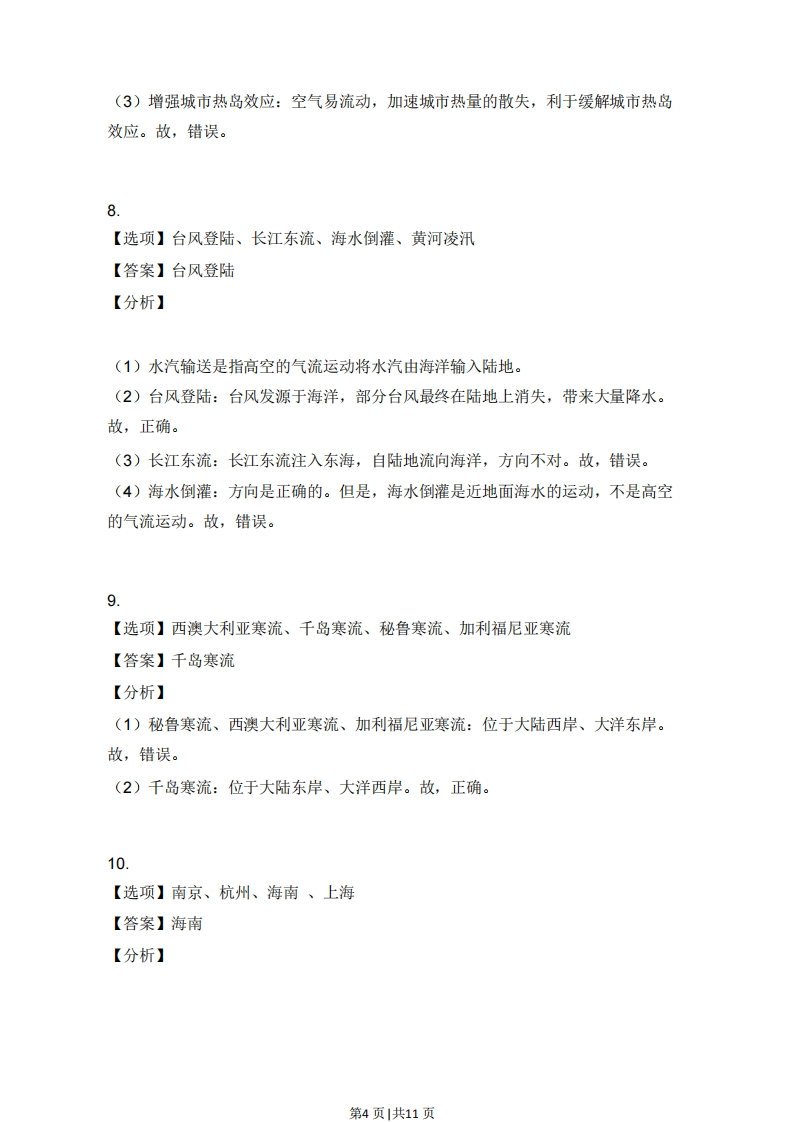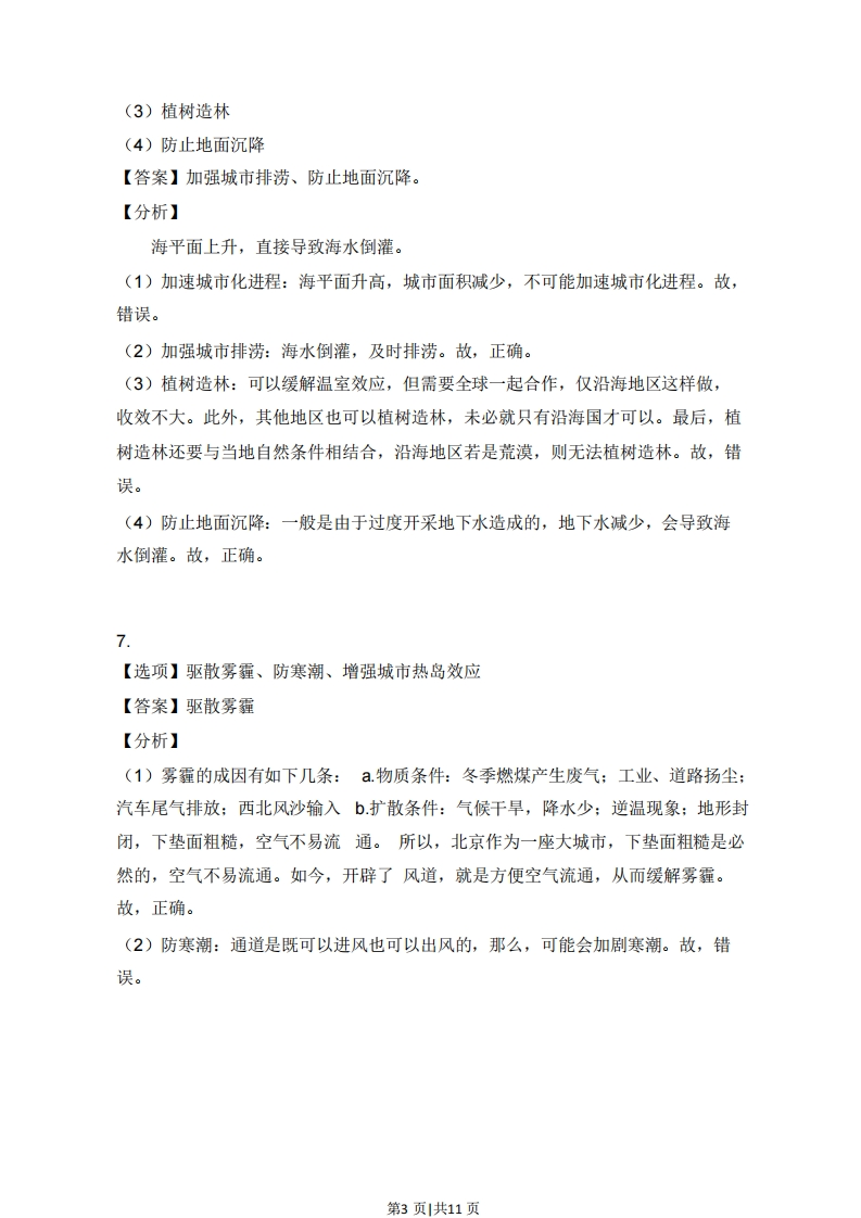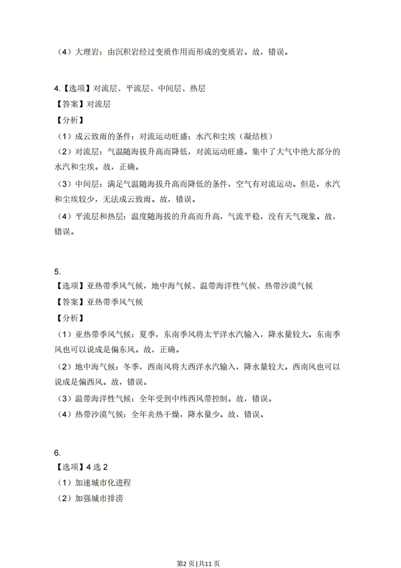 答案与解析一、选择题(20*2'=40)1.【选项】纬度、气候、地形、水文【答案】纬度【分析】(1)纬度:文昌纬度低,地球自转线速度大,节省燃料:纬度低,地球自转偏向力小,发射精度较高。故,正确。(2)气候:文昌的气候属于热带季风气候,降水量较大,雨天多,天气条件不好。故,错误。(3)地形:文昌的地形主要属于低台丘陵,地势起伏较大。而地势平坦地区,视野开阔,更利于发射卫星。故,错误。(4)水文与对卫星发射的影响不大。故,错误。2.【答案】16时【分析】(1)计算公式:达到(当地)时间=时差+飞行时间(2)时差:北京时间为东八区区时,比东九区晚一小时,为13点。加上飞行时间3小时,达到北京的区时是16点。3.【选项】玄武岩、花岗岩、石灰岩、大理岩【答案】玄武岩【分析】(1)玄武岩:岩浆在地表冷凝而形成的喷出岩。故,正确。(2)花岗岩:岩浆在地下冷凝而形成的侵入岩。故,错误。(3)石灰岩:沉积岩。故,错误。第1页|共11页(4)大理岩:由沉积岩经过变质作用而形成的变质岩。故,错误。4.【选项】对流层、平流层、中间层、热层【答案】对流层【分析】(1)成云致雨的条件:对流运动旺盛:水汽和尘埃(凝结核)(2)对流层:气温随海拔升高而降低,对流运动旺盛。集中了大气中绝大部分的水汽和尘埃。故,正确。(3)中间层:满足气温随海拔升高而降低的条件,空气有对流运动。但是,水汽和尘埃较少,无法成云致雨。故,错误。(4)平流层和热层:温度随海拔的升高而升高,气流平稳,没有天气现象。故,错误。【选项】亚热带季风气候,地中海气候、温带海洋性气候、热带沙漠气候【答案】亚热带季风气候【分析】(1)亚热带季风气候:夏季,东南季风将太平洋水汽输入,降水量较大。东南季风也可以说成是偏东风。故,正确。(2)地中海气候:冬季,西南风将大西洋水汽输入,降水量较大。西南风也可以说成是偏西风。故,错误。(3)温带海洋性气候:全年受到中纬西风带控制。故,错误。(4)热带沙漠气候:全年炎热干燥,降水量少。故,错误。6.【选项】4选2(1)加速城市化进程(2)加强城市排涝第2页1共11页