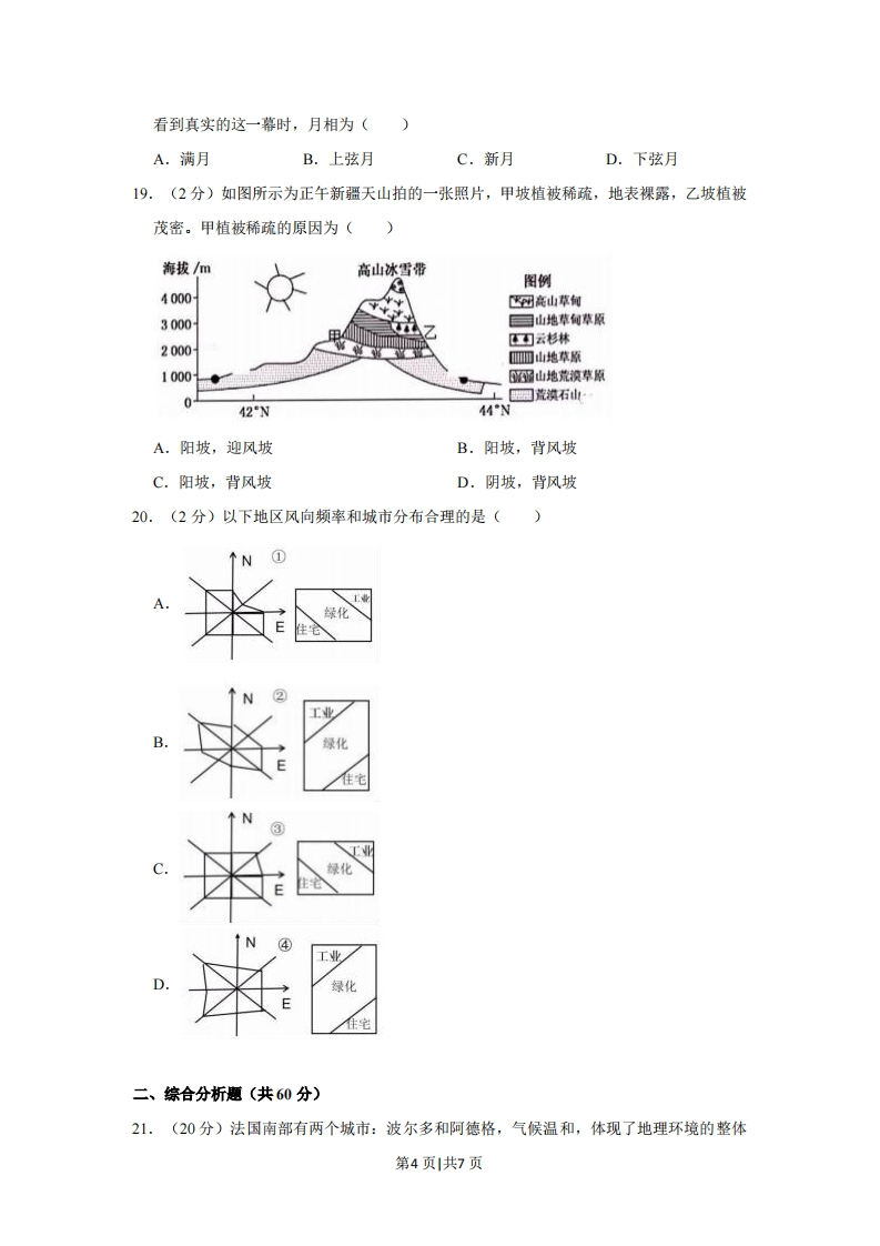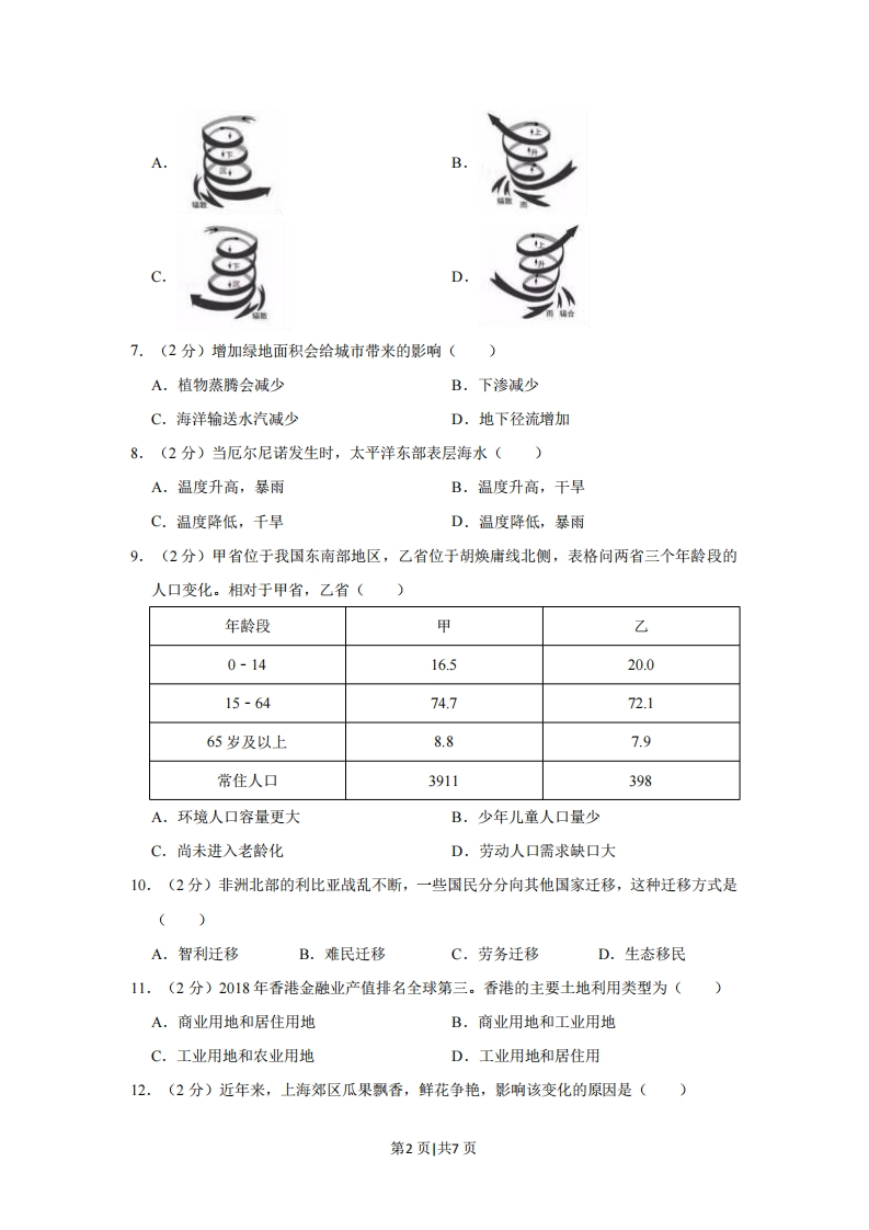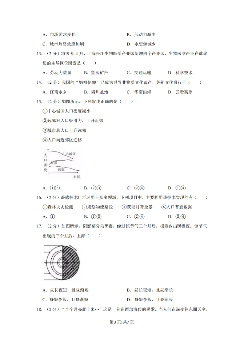 2019年上海市普通高中学业水平等级性考试地理试卷考生注意:1.试卷满分100分,考试时间60分钟。2.本考试分设试卷和答题纸。试卷包括两部分,第一部分为选择题,第二部分为综合分析题,所有试题均为简答题。3.答题前,务必在答题纸上填写姓名、报名号、考场号和座位号,并将核对后的条形码贴在指定位置上。作答必须涂或写在答题纸上,在试卷上作答一律不得分。第一部分的作答必须涂在答题纸上相应的区域,第二部分的作答必须写在答题纸上与试卷题号对应的位置。一、选择题(共40分,每小题2分.每小题只有一个正确答案.)1.(2分)“新速度,新经济,新时代”我国高速铁路建设是世界最完善,运行里程最长的。在高铁建设中,需要克服多溶洞,多暗河等不利地质条件的地貌类型区是()A.海成地貌B.黄土地貌C.岩溶地貌D.风成地貌2.(2分)横断山脉位于青藏高原,云贵高原,四川盆地之间。横断山脉是亚欧板块和哪一板块碰撞形成的()A.太平洋板块B.印度洋板块C.非洲板块D.美洲板块3.(2分)学生在福建平潭的研学旅行中,观察到矗立在沙滩上的两块巨石,其矿物晶体颗粒较粗色泽较浅,其岩石可能是()A.花岗岩B.玄武岩C.大理岩D.石灰岩4.(2分)人类首次使用射电望远镜拍下了黑洞照片,干燥的环境有助于天文观测,根据己知条件判断下列哪些地区适合天文观测()①西欧平原②亚马孙平原③南美沙漠区④南极大陆A.①和②B.①和③C.①和④D.③和④5.(2分)某地因我国东部丽带的移动,降水一般集中在6月中旬到7月上旬,之后一段时间出现炎热干燥的天气,这一地方位于()A.华北平原B.东北平原C.长江三角洲D.珠江三角洲6.(2分)赤道以南莫桑比克等地区受热带气旋“伊代”影响该地区的天气系统应是()第1页共7页B曼7.(2分)增加绿地面积会给城市带来的影响(A.植物蒸腾会减少B.下渗减少C.海洋输送水汽减少D.地下径流增加8.(2分)当厄尔尼诺发生时,太平洋东部表层海水()A.温度升高,暴雨B.温度升高,干旱C.温度降低,千旱D.温度降低,暴雨9.(2分)甲省位于我国东南部地区,乙省位于胡焕庸线北侧,表格问两省三个年龄段的人口变化。相对于甲省,乙省()年龄段甲乙0-1416.520.015-6474.772.165岁及以上8.87.9常住人口3911398A.环境人口容量更大B.少年儿童人口量少C.尚未进入老龄化D.劳动人口需求缺口大10.(2分)非洲北部的利比亚战乱不断,一些国民分分向其他国家迁移,这种迁移方式是()A.智利迁移B.难民迁移C.劳务迁移D.生态移民11.(2分)2018年香港金融业产值排名全球第三。香港的主要土地利用类型为()A.商业用地和居住用地B.商业用地和工业用地C.工业用地和农业用地D.工业用地和居住用12.(2分)近年来,上海郊区瓜果飘香,鲜花争艳,影响该变化的原因是()第2页共7页