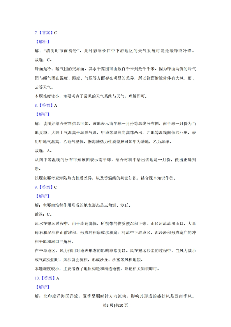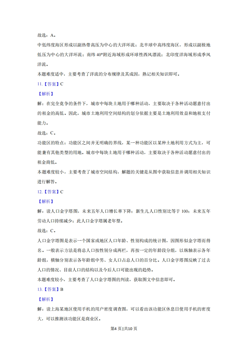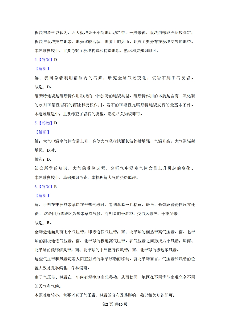 2018年上海市普通高中学业水平等级性考试地理试卷答案和解析1.【答案】A【解析】解:建设海南自由贸易试验区和中国特色自由贸易港会促进海南的产业结构的优化和升级,促进经济的发展。故选:A。自由贸易试验区是指在贸易和投资等方面比世贸组织有关规定更加优惠的贸易安排,在主权国家或地区的关境以外,划出特定的区域,准许外国商品豁免关税自由进出。本题以材料为背景,考查了海南建设自由贸易试验区的有利影响,要求学生调用储备知识分析解决问题。2.【答案】B【解析】解:根据所学知识,太阳和月球对地球共同引力作用而产生的,当三者位于同一条直线上时为大潮。当太阳、地球和月球位于同一条直线上,且月球位于中间时,此时月球亮面背对着地球,地球人无法看到月球,此时为新月:当当太阳、地球和月球位于同一条直线上,且地球位于中间时,此时月球亮面面向地球,看到的是满月。读图可知,①③图符合题意,B对,ACD错。故选:B。本题考查月相变化与潮汐变化的关系。海洋潮汐是太阳和月球对地球共同引力作用而产生的,当三者位于同一条直线上时为大潮,三者呈90°角时为小潮。解答本题要根据三者位置关系,结合月相变化知识加以分析判断。本题难度适中,考查学生获取和解读图文信总及调动和运用知识的能力。解题关键是学生在理解月相变化与潮汐变化关系的基础上,熟记基础知识,提高学生综合解决问题的能力。3.【答案】C【解析】解:由板块张裂形成的是太平洋洋脊,其它为板块挤压形成。故选:C。第1页1共10页板块构造学说认为,六大板块处于不断地运动之中,一般来说,板块内部地壳比较稳定:板块与板块交界地带,地壳比较活跃。世界上的火山、地震主要分布在板块交界的地带。本题难度较小,主要考察了板块构造和构造地貌,熟记相关知识即可。4.【答案】D【解析】解:我国学者利用溶洞内的石笋,研究全球气候变化,该岩石属于石灰岩。故选:D。喀斯特地貌是喀斯特作用形成的一种独特的地貌类型。喀斯特作用的本质是含有二氧化碳的水对可溶性岩石的溶蚀和淀积作用。岩石的可溶性是喀斯特地貌发育的最基本条件。本题难度适中,主要考查了岩石的类型,熟记相关知识即可。5.【答案】D【解析】解:大气中温室气体含量上升,会使大气吸收地面长波辐射增强,气温升高,大气逆辐射增强,D对。故选:D。结合所学的知识,大气的受热过程,分析气中温室气体含量上升引起的变化。本题难度较小,基础知识考查,掌握理解大气的受热原理。6.【答案】B【解析】解:小明在非洲热带草原乘坐热气球时,看到草原一片枯黄,斑马、长颈鹿纷纷向远方迁徙。这是因为该地区为热带草原气候,有明显的干湿季,受信风影响,干季到来。故选:B。全球近地面共有七个气压带,即赤道低气压带,南、北半球的副热带高气压带,南、北半球的副极地低气压带,南、北半球的极地高气压带。在气压带之间形成六个风带,即南、北半球的低纬信风带,南、北半球的中纬盛行西风带,南、北半球的极地东风带。这些气压带和风带随着太阳直射点的季节移动而移动。就北半球而言,气压带和风带的位置大致是夏季偏北,冬季偏南。由于气压带、风带在一年内有规律地南北移动,从而使同一地区在不同季节出现完全不同的天气和气候。本题难度较小,主要考查了气压带、风带的分布及其影响,熟记相关知识即可。第2页|共10页