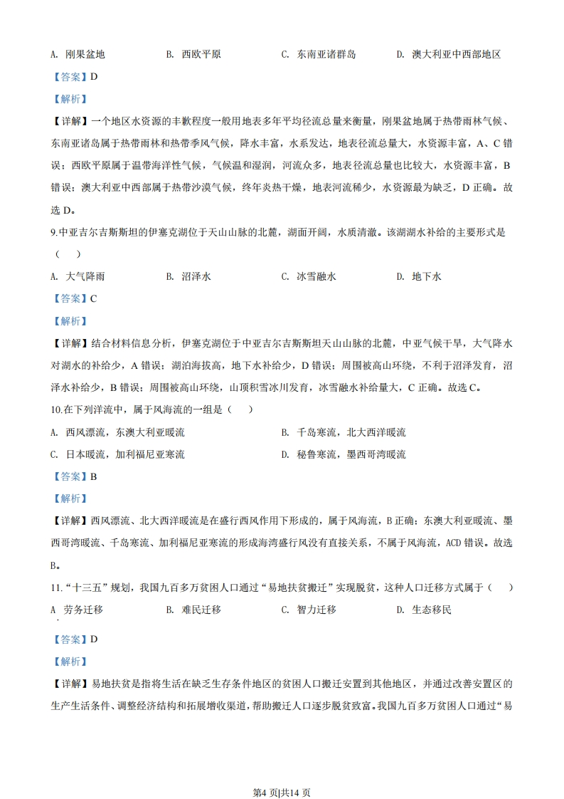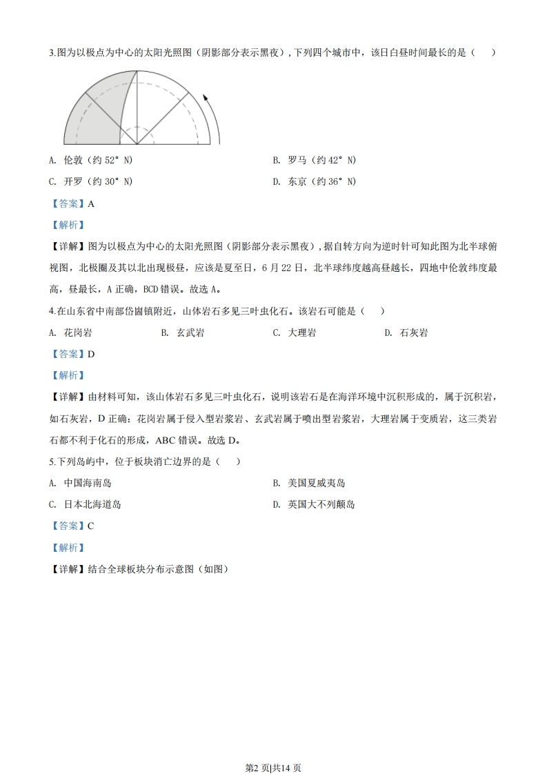 2020年上海市普通高中学业水平等级性考试地理试卷考生注意:1.试卷满分100分,考试时间60分钟。2.本考试分设试卷和答题纸。试卷包括两部分,第一部分为选择题,第二部分为综合分析题,所有试题均为简答题。3.答题前,务必在答题纸上填写姓名、报名号、考场号和座位号,并将核对后的条形码贴在指定位置上。作答必须涂或写在答题纸上,在试卷上作答一律不得分。第一部分的作答必须涂在答题纸上相应的区域,第二部分的作答必须写在答题纸上与试卷题号对应的位置。一、选择题(共40分,每小题2分。每小题只有一个正确答案。)1抗击疫情向武汉赠送物资,以下哪几个与地区对应正确()①黑龙江一大米②海南一苹果③陕西一香蕉④广西一蔬菜A.②③B.②④C.①④D.①③【答案】C【解析】【详解】黑龙江盛产大米,①正确。苹果是暖温带作物,海南位于热带,②错误。香蕉是热带作物,陕西位于暖温带,③错误。疫情期间为冬季、春季,广西纬度低,蔬菜产量大,可以供给武汉,④正确。C正确,ABD错误。故选C。2.2020年3月28日傍晚,某一中学天文爱好者观测拍下“金星伴月”一幕,当天的农历日期是()A.三月初五B.三月十二C.三月十九D.三月廿六【答案】A【解析】【详解】娥眉月是农历的月相,弯弯娥眉月,形状如同眉毛,由此而得名。分为新月娥眉月和残月娥眉月。新月娥眉月是在月初的傍晚,出现在西方天空,月面朝西,呈反C状。残月娥眉月是在月末的黎明,出现在东方天空,月面朝东,呈C状。图中月相月面朝西,呈反C状,由于形状如同眉毛,是新月峨眉月,是指农历初三、四的月相,因此3月28日的农历日期是三月初五,A正确,BCD错误。故选A。第1页共14页3图为以极点为中心的太阳光照图(阴影部分表示黑夜),下列四个城市中,该日白昼时间最长的是()A.伦敦(约52°N)B.罗马(约42°N)C.开罗(约30°N)D.东京(约36°N)【答案】A【解析】【详解】图为以极点为中心的太阳光照图(阴影部分表示黑夜),据自转方向为逆时针可知此图为北半球俯视图,北极圈及其以北出现极昼,应该是夏至日,6月22日,北半球纬度越高昼越长,四地中伦敦纬度最高,昼最长,A正确,BCD错误。故选A。4在山东省中南部岱崮镇附近,山体岩石多见三叶虫化石。该岩石可能是()A.花岗岩B.玄武岩C.大理岩D.石灰岩【答案】D【解析】【详解】由材料可知,该山体岩石多见三叶虫化石,说明该岩石是在海洋环境中沉积形成的,属于沉积岩,如石灰岩,D正确:花岗岩属于侵入型岩浆岩、玄武岩属于喷出型岩浆岩,大理岩属于变质岩,这三类岩石都不利于化石的形成,ABC错误。故选D.5.下列岛屿中,位于板块消亡边界的是()A.中国海南岛B.美国夏威夷岛C.日本北海道岛D.英国大不列颠岛【答案】C【解析】【详解】结合全球板块分布示意图(如图)第2页共14页