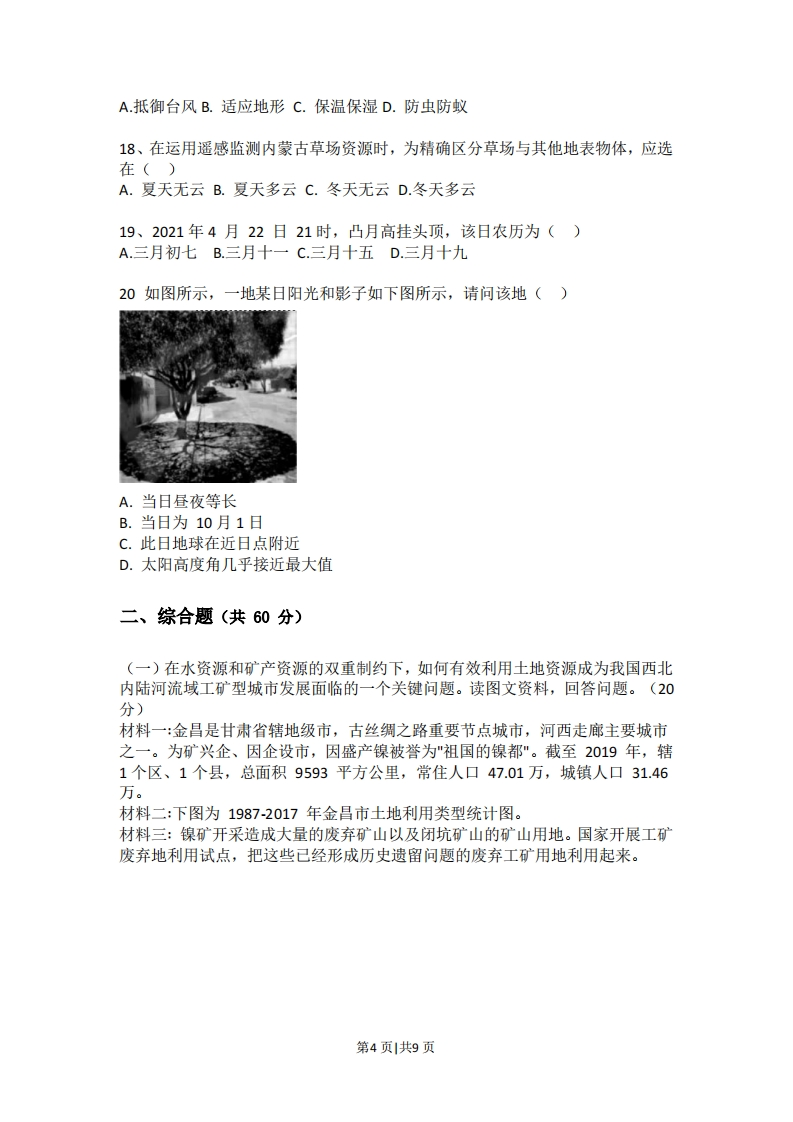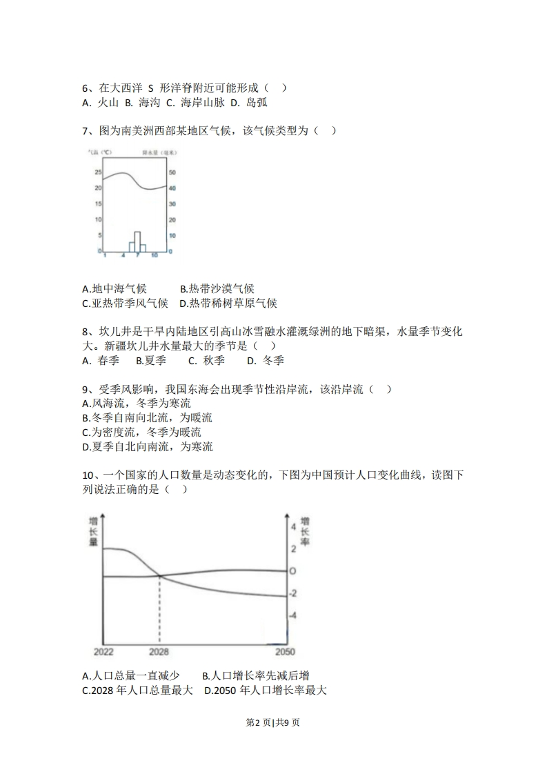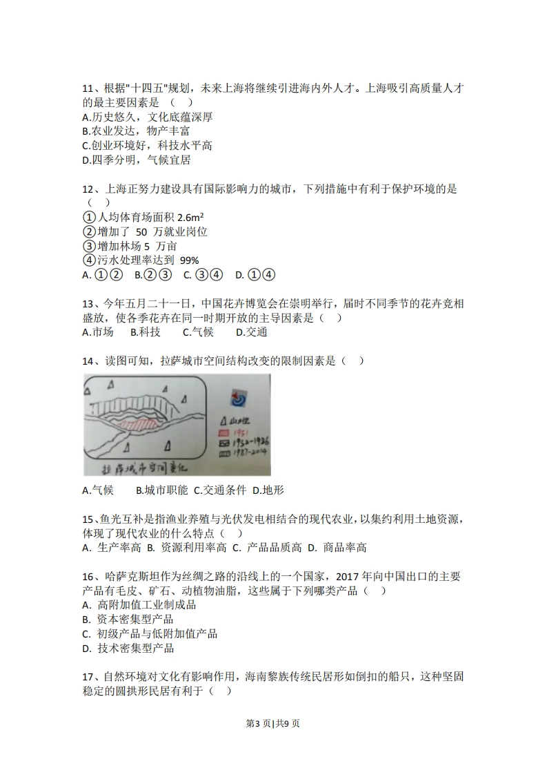 2021年上海市高考真题地理试卷考生注意:1.试卷满分100分,考试时间60分钟。2本考试分设试卷和答题纸。试卷包括两部分,第一部分为选择题,第二部分为综合分析题,所有试题均为简答题。3.答题前,务必在答题纸上填写姓名、报名号、考场号和座位号,并将核对后的条形码贴在指定位置上。作答必须涂或写在答题纸上,在试卷上作答一律不得分。第一部分的作答必须涂在答题纸上相应的区域,第二部分的作答必须写在答题纸上与试卷题号对应的位置。一、选择题(共40分,每小题2分,每小题只有一个正确答案)1、当地时间2021年2月25日23时(北京时间26日11时),首批中国新冠疫苗运抵乌拉圭首都蒙特维迪亚,蒙特维迪亚所在时区是()A.东四区B.西二区C.西四区D.西十一区2、陕西延安的主要地貌类型为()A.风成地貌B.流水地貌C.卡斯特地貌D.黄土地貌3、观察某地出露地表的岩石,可见其中有砂岩和生物化石,可知该岩石按成因分类属于()A.侵入岩B.喷出岩C.沉积岩D.变质岩4、已知杨梅多生活在海拔低的阴坡,不需要过多的光照,同时需要一定的排水条件,下列地区中最适合种植杨梅的是()300A.甲B.乙C.丙D.丁5、探空气球可直接测量并实时传回30km高空的气象数据,假设在下列各地同时释放探空气球,并以同样的速度上升,最先测得平流层数据的是()A.海口(20N)B.广州(23N)C.上海(31N)D.哈尔滨(45N)第1页共9页6、在大西洋S形洋脊附近可能形成()A.火山B.海沟C.海岸山脉D.岛弧7、图为南美洲西部某地区气候,该气候类型为()气盖(℃500A.地中海气候B.热带沙漠气候C.亚热带季风气候D.热带稀树草原气候8、坎儿井是干旱内陆地区引高山冰雪融水灌溉绿洲的地下暗渠,水量季节变化大。新疆坎儿井水量最大的季节是()A.春季B.夏季C.秋季D.冬季9、受季风影响,我国东海会出现季节性沿岸流,该沿岸流()A.风海流,冬季为寒流B.冬季自南向北流,为暖流C.为密度流,冬季为暖流D.夏季自北向南流,为寒流10、一个国家的人口数量是动态变化的,下图为中国预计人口变化曲线,读图下列说法正确的是()增增率2202220282050A.人口总量一直减少B.人口增长率先减后增C.2028年人口总量最大D.2050年人口增长率最大第2页共9页