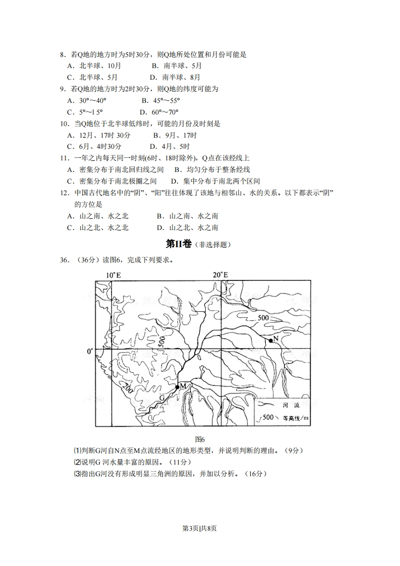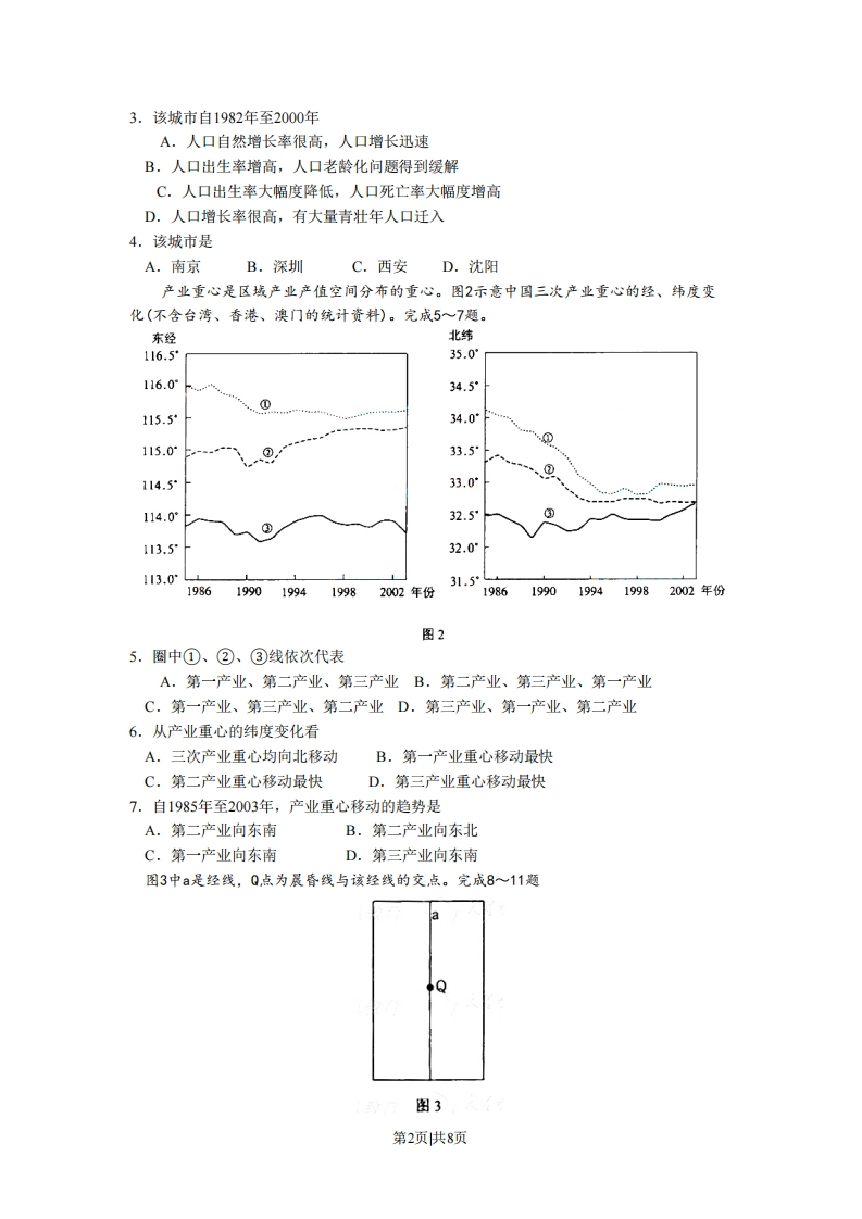 2008年普通高等学校招生全国统一考试(全国卷丨)文科综合(地理部分)本试卷分第I卷(选择题)和第Ⅱ卷两部分。第I卷1至7页,第Ⅱ卷8至12页,共300分。考生注意:1.答题前,考生务必将自己的准考证号、姓名填写在答题卡上。考生要认真核对答题卡上粘贴的条形码的“准考证号、姓名、考试科目”与考生本人准考证号、姓名是否一致。2.第I卷每小题选出答案后,用2B铅笔把答题卡上对应题目的答案标号涂黑,如需改动,用橡皮擦干净后,再选涂其他答案标号。第Ⅱ卷用黑色墨水签字笔在答题卡上书写作答。在试题卷上作答,答案无效。3.考试结束,监考员将试题卷、答题卡一并收回。第舡卷(选择题)本卷共35小题,每小题4分,共140分。在每小题给出的四个选项中,只有一项符合题目要求。张某承包了0.5公顷耕地.种植结构变化如图1。当地1月平均气温3℃。完成1~2题。图例☐水稻☑蔬菜留花卉细油菜1985年1995年2005年图其他图11.张某承包的耕地可能位于A.珠江三角洲B.太湖平原C.华北平原D.松嫩平原2.导致种植结构变化的主要因素是A.市场需求B.生产经验C.自然条件D.国家政策下表为我国某城市人口资料。读下表完成3~4题。1982年1990年2000年总人口(万人)351677010~14岁(%)35.2714.638.515一64岁(%)58.3683.1590.3965岁及以上(%)6.372221.11第1页共8页3.该城市自1982年至2000年A.人口自然增长率很高,人口增长迅速B.人口出生率增高,人口老龄化问题得到缓解C.人口出生率大幅度降低,人口死亡率大幅度增高D.人口增长率很高,有大量青壮年人口迁入4.该城市是A.南京B.深圳C.西安D.沈阳产业重心是区域产业产值空间分布的重心。图2示意中国三次产业重心的经、纬度变化(不含台湾、香港、澳门的统计资料)。完成5~7题。东经北纬116.535.0116.034.5⑦115.534.00115.033.5114.533.0114.032.5113.532.0113.0°31.519861990199419982002年份19861990199419982002年份图25.圈中①、②、③线依次代表A.第一产业、第二产业、第三产业B.第二产业、第三产业、第一产业C.第一产业、第三产业、第二产业D.第三产业、第一产业、第二产业6.从产业重心的纬度变化看A.三次产业重心均向北移动B.第一产业重心移动最快C.第二产业重心移动最快D.第三产业重心移动最快7.自1985年至2003年,产业重心移动的趋势是A.第二产业向东南B.第二产业向东北C.第一产业向东南D.第三产业向东南图3中a是经线,Q点为晨昏线与该经线的交点。完成8~11题图3第2页供8页