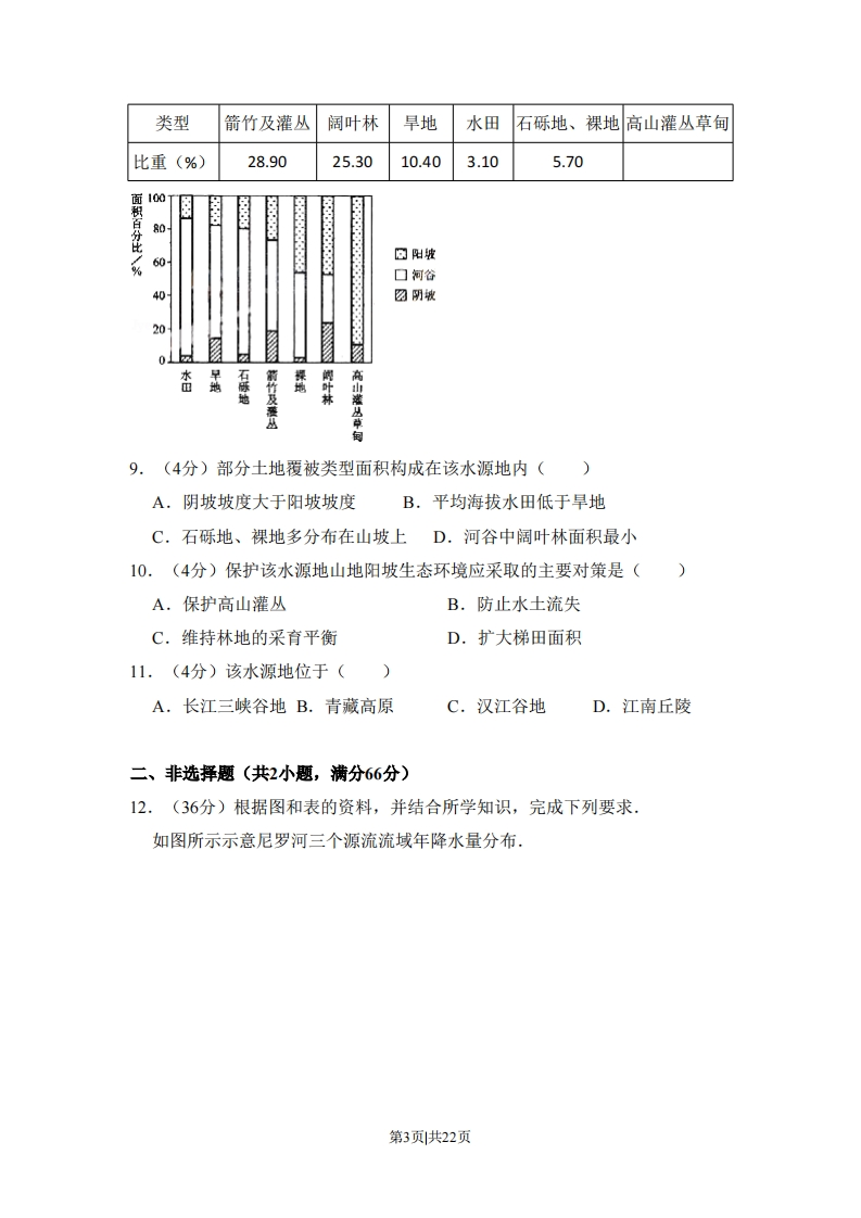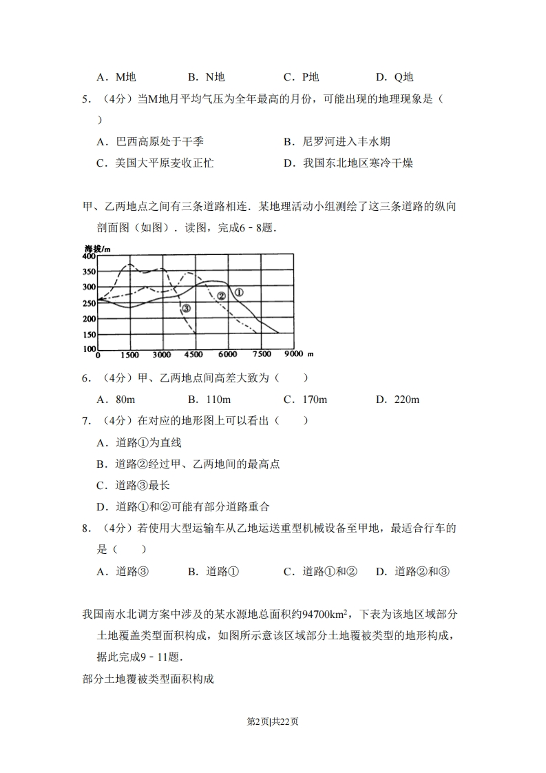 2009年全国统一考试地理试卷(全国卷I)一、选择题:在每题给出的四个选项中,只有一项是符合题目要求的.甲市2008年户籍人口出生9.67万人,出生率为0.699%:死亡10.7万人,死亡率为0.773%.甲市户籍人口这种自然增长态势已持续14年.图上显示四个地区的人口出生率和死亡率.据此完成1-2题,出生率/%4④3②2①234死亡率/%1.(4分)甲市可能是()A,西宁B.延安C.上海D.广州2.(4分)①②③④四个地区中,人口再生产与甲市处于同一类型的地区是()A.①B.②C.③D.④如图所示意某区域某月一条海平面等压线,图中N地气压高于P地.读图,完成3-5题.3.(4分)N地风向为()90130°Q●e M40NA.东北风B.东南风C.西北风D.西南风4.(4分)M、N、P、Q四地中,阴雨天气最有可能出现在()第1页共22页A.M地B.N地C.P地D.Q地5,(4分)当M地月平均气压为全年最高的月份,可能出现的地理现象是()A,巴西高原处于干季B.尼罗河进入丰水期C.美国大平原麦收正忙D.我国东北地区寒冷干燥甲、乙两地点之间有三条道路相连.某地理活动小组测绘了这三条道路的纵向剖面图(如图),读图,完成6-8题.德拔口350300L②①250③200150100150030004500600075009000m6.(4分)甲、乙两地点间高差大致为()A.80mB.110mC.170mD.220m7.(4分)在对应的地形图上可以看出()A.道路①为直线B.道路②经过甲、乙两地间的最高点C.道路③最长D.道路①和②可能有部分道路重合8.(4分)若使用大型运输车从乙地运送重型机械设备至甲地,最适合行车的是()A.道路③B.道路①C.道路①和②D.道路②和③我国南水北调方案中涉及的某水源地总面积约94700km2,下表为该地区域部分土地覆盖类型面积构成,如图所示意该区域部分土地覆被类型的地形构成,据此完成9-11题,部分土地覆被类型面积构成第2页共22页