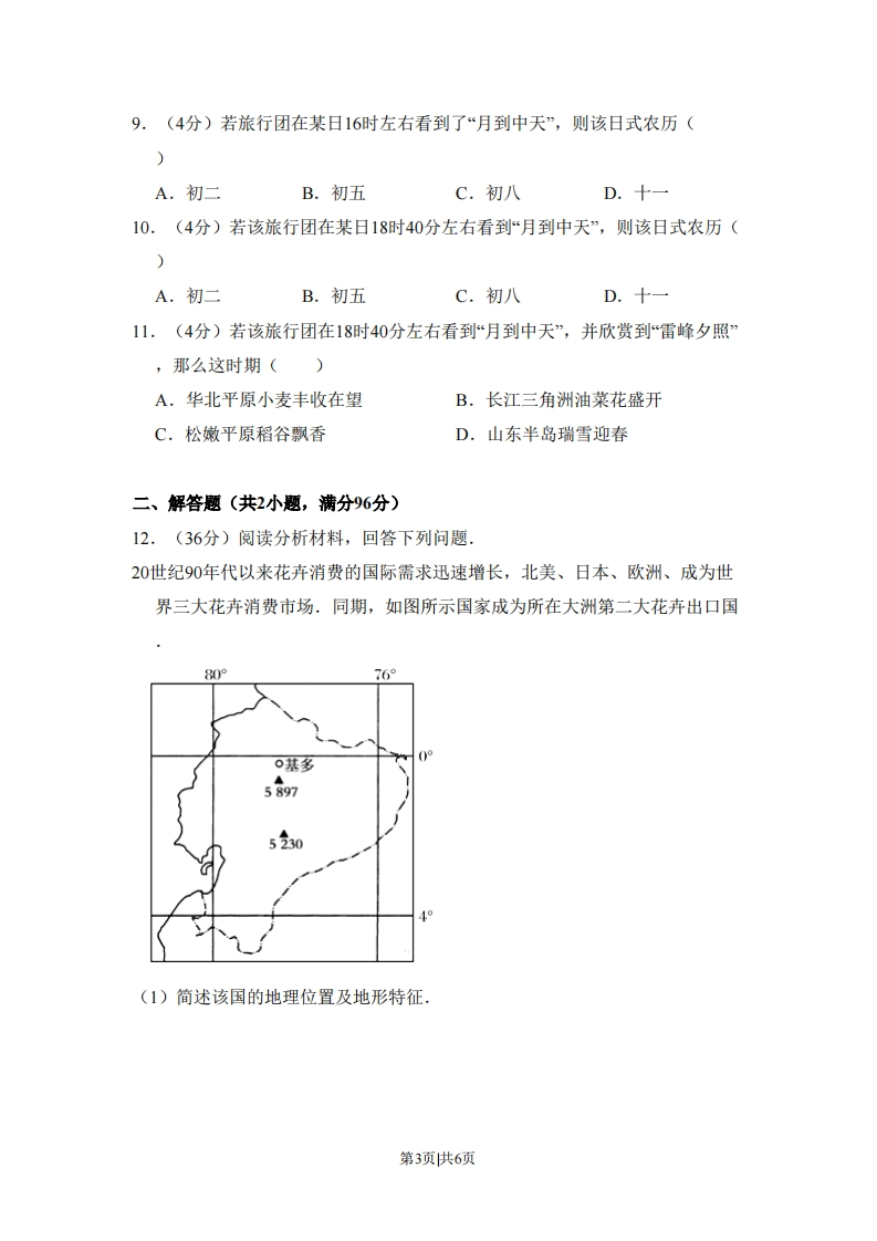 2009年全国统一考试地理试卷(全国卷Ⅱ)一、本卷共4小题,每小题0分,共44分。在每题给出的四个选项中,只有一项是符合题目要求的。近期研制出利用玉米叶片加工、编织购物袋的技术,这种购物袋易分解且物美价廉.据此完成1~3题.1.(4分)该种购物袋的生产厂应该近()A.原料产地B.销售产地C.能原产地D.研发基地2.(4分)以该种购物袋替代目前广泛使用的同类产品,对环境保护的直接作用是()A.减轻大气污染B.减轻“白色污染”C.促进生物多样性D.减轻酸雨危害3.(4分)该种购物袋的生产原料在我国的最大产地是()A.河南省B.山东省C.四川省D.吉林省如图显示某国1951-2000年每10年的人口变化读图完成4~5题人增长数二厅45☐自然州长人口戴1.1%☐许迁人人口数百分比数疗为增长节204.8%2.9%152.2%39%51.0%0.9%0■03%】-0.1%-3-19%-10-15」1951-19601961-19701971-19801981-19901991-2000时段4.(4分)1951--2000年,该国()A,是人口净迁入国B,人口的迁入是维持人口增长的主要方式C.人口的出生率一直高于死亡率D.人口增长了15.1%第1页共6页5.(4分)据图示资料推测,该国()A.自20世纪70年代,人口再生产进入现代型B.可能位于欧洲C.1990年人口达到900万D.20世纪末青壮年人口比重偏大如图中,H地恰与某高压天气系统中心吻合,该天气系统以每天约200千米的速度东移.据此完成6一8题.北200060020km☑案落A600一等高线/m一河流6.(4分)H地与甲聚落的相对高差约为()A.800米B.1500米C.1800米D.2100米7.(4分)上午10时,H地气温为12℃,甲聚落气温为17℃.到15时甲聚落的气温最接近()A.15CB.18CC.21℃D.24C8.(4分)甲聚落第二天的天气状况为()A.晴天转阴雨B.大风有浮尘C.晴暖有微风D.阵风间暴雨某旅游团希望在杭州西湖欣赏“雷锋(塔)夕照”的同时,也领略“月到中天(月亮高度最大),水面风来的情境.(注:月球公转周期约为30天,农历初一月球在天空中的视位置最靠近太阳完成9~11题.第2页共6页