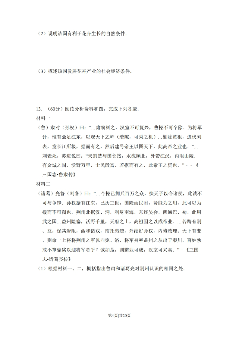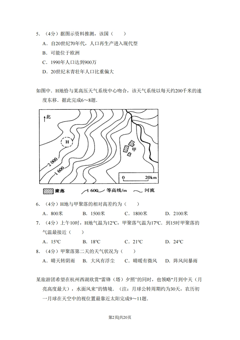 2009年全国统一考试地理试卷(全国卷Ⅱ)一、本卷共4小题,每小题0分,共44分。在每题给出的四个选项中,只有一项是符合题目要求的。近期研制出利用玉米叶片加工、编织购物袋的技术,这种购物袋易分解且物美价廉.据此完成1~3题.1.(4分)该种购物袋的生产厂应该近()A.原料产地B.销售产地C.能原产地D.研发基地2.(4分)以该种购物袋替代目前广泛使用的同类产品,对环境保护的直接作用是()A.减轻大气污染B.减轻“白色污染”C.促进生物多样性D.减轻酸雨危害3.(4分)该种购物袋的生产原料在我国的最大产地是()A.河南省B.山东省C.四川省D.吉林省如图显示某国1951-2000年每10年的人口变化读图完成4~5题人增长数二厅45☐自然州长人口戴1.1%☐许迁人人口数百分比数疗为增长节204.8%2.9%152.2%39%51.0%0.9%0■03%】-0.1%-3-19%-10-151951-19601961-19701971-19801981-19901991-2000时段4.(4分)1951--2000年,该国()A,是人口净迁入国B,人口的迁入是维持人口增长的主要方式C.人口的出生率一直高于死亡率D.人口增长了15.1%第1页共20页5.(4分)据图示资料推测,该国()A.自20世纪70年代,人口再生产进入现代型B.可能位于欧洲C.1990年人口达到900万D.20世纪末青壮年人口比重偏大如图中,H地恰与某高压天气系统中心吻合,该天气系统以每天约200千米的速度东移.据此完成6一8题.北200060020km☑聚落A600一等高线/m一河流6.(4分)H地与甲聚落的相对高差约为()A.800米B.1500米C.1800米D.2100米7.(4分)上午10时,H地气温为12℃,甲聚落气温为17℃.到15时甲聚落的气温最接近()A.15CB.18CC.21℃D.24C8.(4分)甲聚落第二天的天气状况为()A.晴天转阴雨B.大风有浮尘C.晴暖有微风D.阵风间暴雨某旅游团希望在杭州西湖欣赏“雷锋(塔)夕照”的同时,也领略“月到中天(月亮高度最大),水面风来的情境.(注:月球公转周期约为30天,农历初一月球在天空中的视位置最靠近太阳完成9~11题.第2页共20页