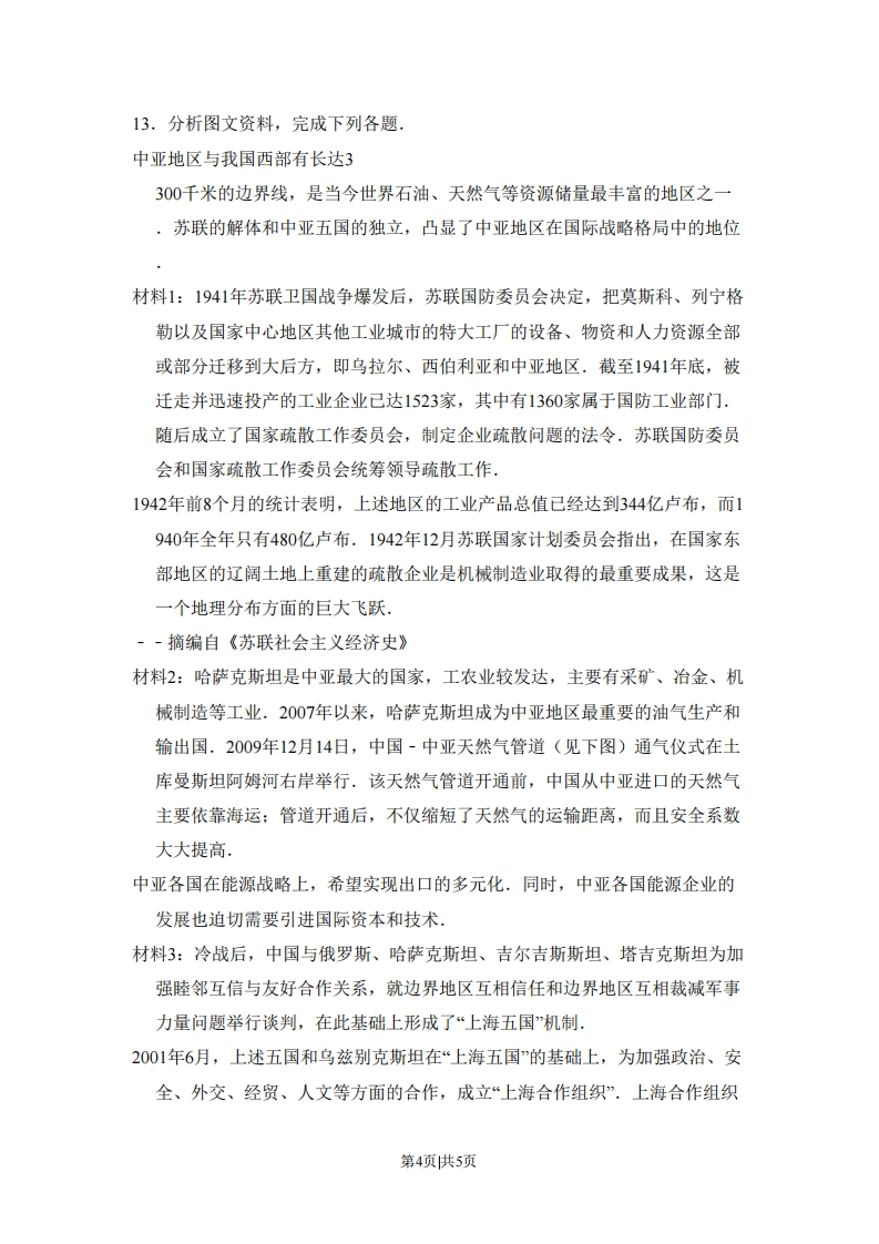 2010年全国统一高考地理试卷(全国卷Ⅱ)一、选择题(共4小题,每小题0分,满分0分)如图是2010年3月中旬发生在我国的沙尘暴的一幅遥感影像.图中色调由浅到深依次是云层、被卷到空中的沙尘和陆地表面.读图完成1~3题.云层沙尘沙尘云层1.(3分)该沙尘暴发生地位于()A.副极地低压带B.西风带C.副热带高压带D.东北信风带2.(3分)导致该沙尘暴的天气系统是()A.反气旋、冷锋B.反气旋、暖锋C.气旋、冷锋D.气旋、暖锋3.(3分)影像中部显示的是该沙尘暴的()A.中心区,沙尘扬升B.边缘区,沙尘扩散C.中心区,沙尘沉降D.边缘区,沙尘沉降如图示意某河流入海径流量和输沙量的逐年变化.读图,完成4一5题1400170012006005001006040020020010019501955196019651970197519801945198019%20002005(4年p一径流量一…输沙量4.(3分)图中信息表明该河流()A.1950~1969年输沙量与径流量年变化同步B.1985年之后输沙量和径流量变化趋势相反C.1950~2005年输沙量的变化率高于径流量的变化率第1页供5页D.高径流量年份与高输沙量年份逐一对应5.(3分)比较1984年以来径流量和输沙量的变化趋势,可以看出流域内(A.气候变暖、变干的速度日益加快B.水土保持和水利工程效益显著C.地质灾害得到有效控制D.水资源总量呈波动式下降巴西的柑橘产量位居世界前列.巴西柑橘果酱生产几乎全部集中在东南部沿海的S州.该州面积不大,拥有大型港口.20世纪80年代中期,随着运输果酱的专用轮船的使用,巴西柑橘果酱在国际市场的统治地位得以巩固.完成6~8题.6.(3分)一般而言,影响柑橘果酱生产厂区位选择的主导因素是()A.原料地B.消费市场C.劳动力价格D.交通运输7.(3分)巴西柑橘果酱生产集中在S州的主要原因是()A.接近原料产地B.接近消费市场C.利用廉价劳动D.方便产品运输8.(3分)据材料推测,20世纪80年代初期,巴西柑橘果酱在国际竞争中面临的问题出现在()A.原料生产环节B.加工环节C.运输环节D.销售环节据报道,某年3月9日,我国科考队员在中国北极黄河站(7855N,11°56E)观看了极夜后的首次日出.完成9~11题9.(3分)当日,科考队员在黄河站看到日出时,北京时间约为()A.10时B.13时C.16时D.19时10.(3分)当日,日落于黄河站的()A.东方B.西方C.南方D.北方11.(3分)据此推算,黄河站此次极夜开始的时间约在前一年的()A.9月21~30日B.10月1~10日C.10月11~20日D.10月21~30日第2页供5页