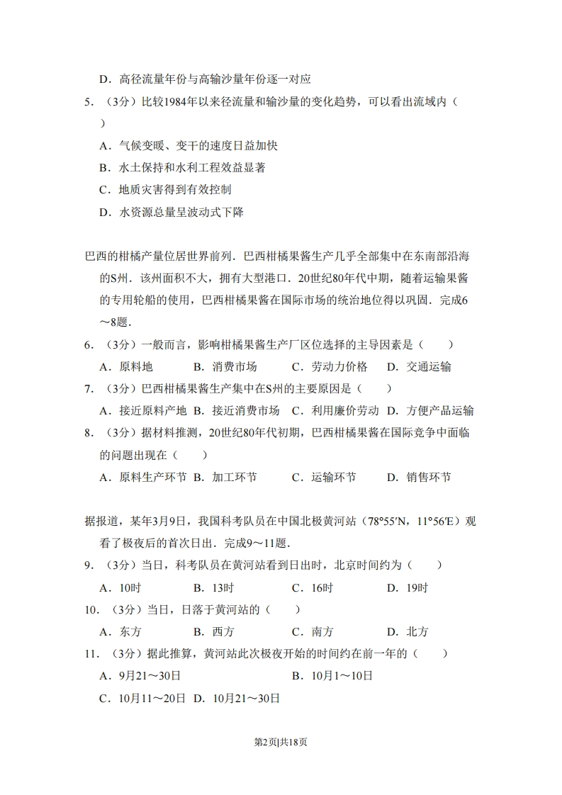 2010年全国统一高考地理试卷(全国卷Ⅱ)一、选择题(共4小题,每小题0分,满分0分)如图是2010年3月中旬发生在我国的沙尘暴的一幅遥感影像.图中色调由浅到深依次是云层、被卷到空中的沙尘和陆地表面.读图完成1~3题.云层沙尘沙尘云层1.(3分)该沙尘暴发生地位于()A.副极地低压带B.西风带C.副热带高压带D.东北信风带2.(3分)导致该沙尘暴的天气系统是()A.反气旋、冷锋B.反气旋、暖锋C.气旋、冷锋D.气旋、暖锋3.(3分)影像中部显示的是该沙尘暴的()A.中心区,沙尘扬升B.边缘区,沙尘扩散C.中心区,沙尘沉降D.边缘区,沙尘沉降如图示意某河流入海径流量和输沙量的逐年变化.读图,完成4一5题1400170012006005001006040020020010019501955196019651970197519801945198019%20002005(4年p一径流量一…输沙量4.(3分)图中信息表明该河流()A.1950~1969年输沙量与径流量年变化同步B.1985年之后输沙量和径流量变化趋势相反C.1950~2005年输沙量的变化率高于径流量的变化率第1页共18页D.高径流量年份与高输沙量年份逐一对应5.(3分)比较1984年以来径流量和输沙量的变化趋势,可以看出流域内(A.气候变暖、变干的速度日益加快B.水土保持和水利工程效益显著C.地质灾害得到有效控制D.水资源总量呈波动式下降巴西的柑橘产量位居世界前列.巴西柑橘果酱生产几乎全部集中在东南部沿海的S州.该州面积不大,拥有大型港口.20世纪80年代中期,随着运输果酱的专用轮船的使用,巴西柑橘果酱在国际市场的统治地位得以巩固.完成6~8题.6.(3分)一般而言,影响柑橘果酱生产厂区位选择的主导因素是()A.原料地B.消费市场C.劳动力价格D.交通运输7.(3分)巴西柑橘果酱生产集中在S州的主要原因是()A.接近原料产地B.接近消费市场C.利用廉价劳动D.方便产品运输8.(3分)据材料推测,20世纪80年代初期,巴西柑橘果酱在国际竞争中面临的问题出现在()A.原料生产环节B.加工环节C.运输环节D.销售环节据报道,某年3月9日,我国科考队员在中国北极黄河站(7855N,11°56E)观看了极夜后的首次日出.完成9~11题9.(3分)当日,科考队员在黄河站看到日出时,北京时间约为()A.10时B.13时C.16时D.19时10.(3分)当日,日落于黄河站的()A,东方B.西方C.南方D.北方11.(3分)据此推算,黄河站此次极夜开始的时间约在前一年的()A.9月21~30日B.10月1~10日C.10月11~20日D.10月21~30日第2页共18页