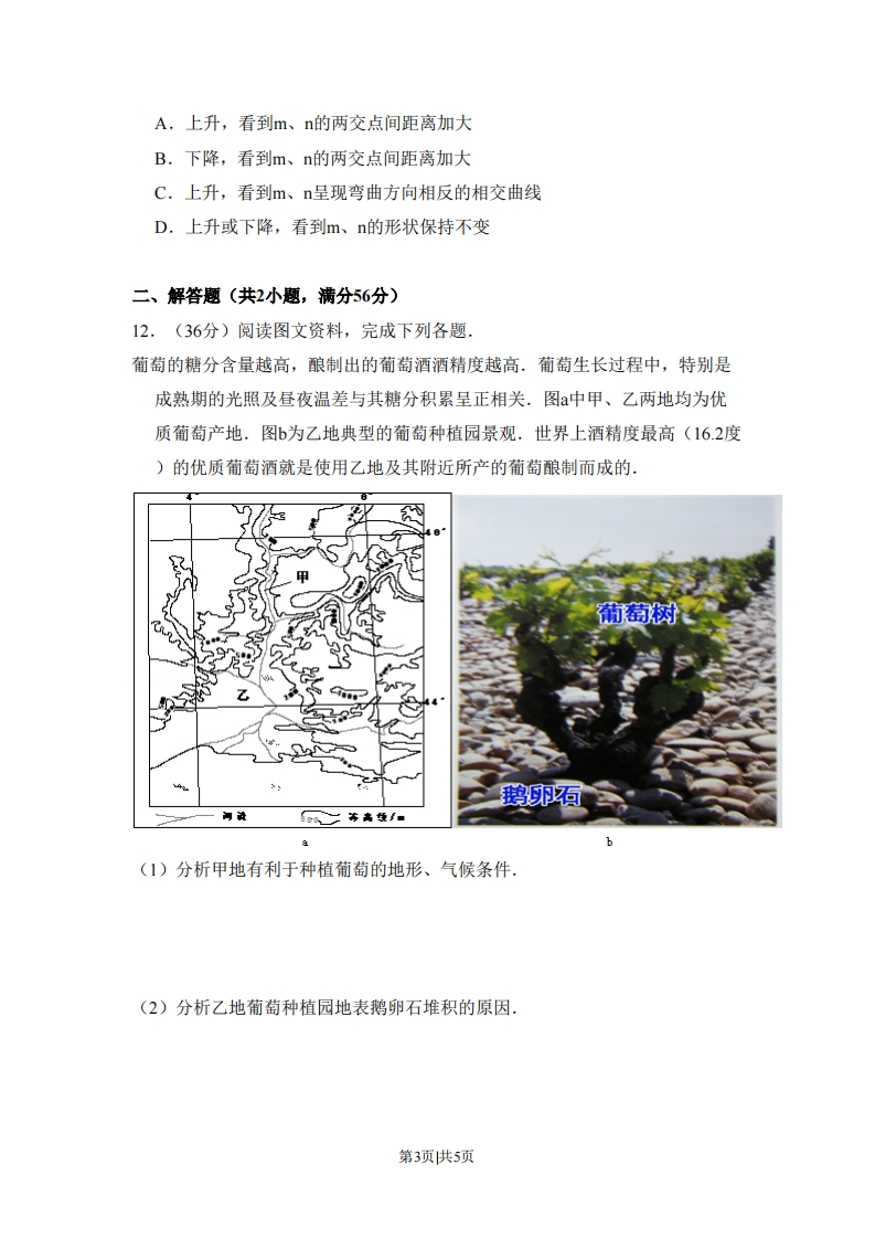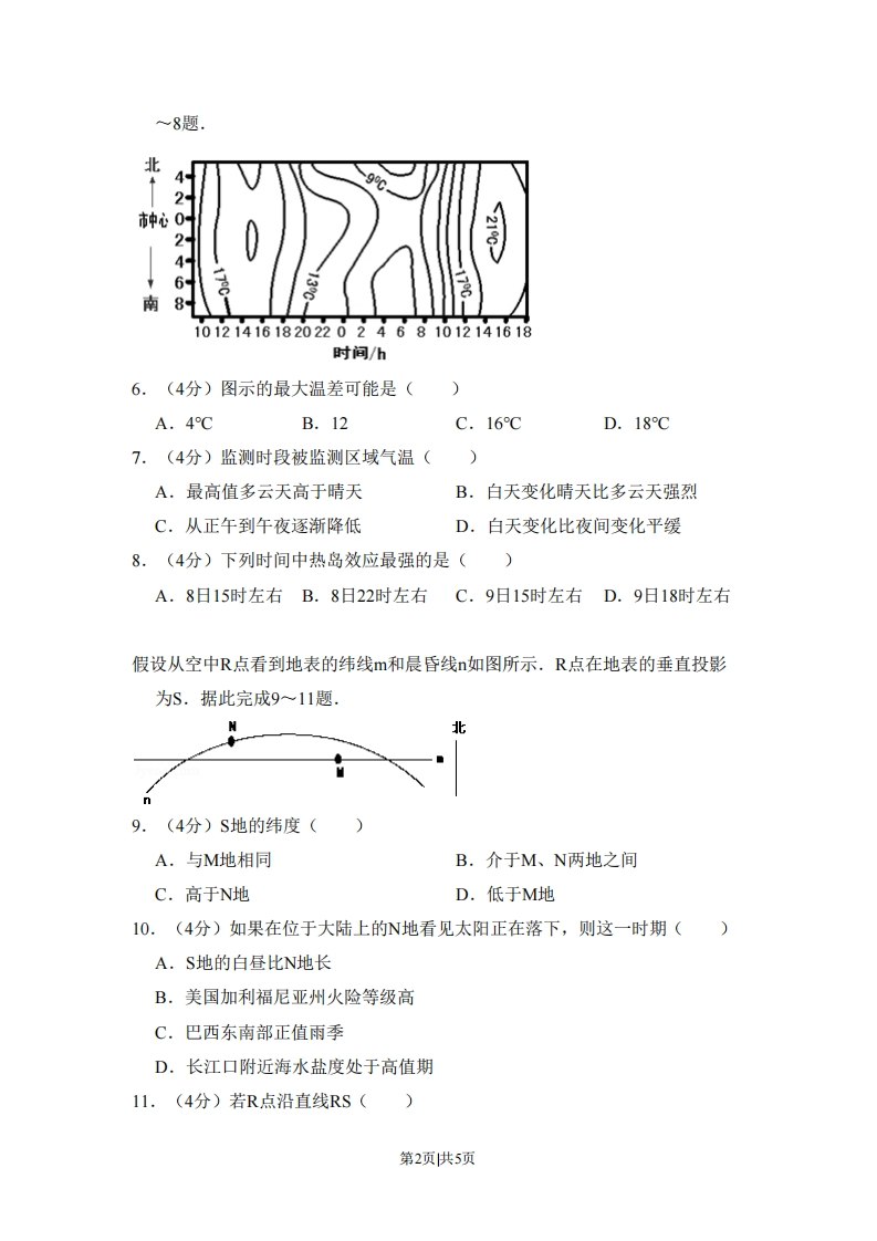 2010年全国统一高考地理试卷(全国卷I)一、选择题(共4小题,每小题0分,满分0分)江苏北部沿海滩涂围垦,需要经过筑堤、挖渠等工程措施和种植适应性植物等生物措施改造,4~5年后才能种植粮食作物.据此完成1~2题.1.(4分)改造滩涂所种植的适应性植物应()A.耐湿B.耐旱C.耐盐D.抗倒伏2.(4分)若缩短滩涂改造时间,需投入更多的(A.化肥B.农家肥C.农药D.淡水北京的王女士登录总部位于上海的M公司(服装公司)网站,订购了两件衬衣,两天后在家收到货.图示意M公司的企业组织、经营网络.据此完成3-5题.面料厂总部24小时内运送设开:采购网站日制衣丁:二计!市场销售:呼叫中心消费者库存管理1小时内运送仓储中心配送仓库☐M公司○M公司的供应商一供应商完成的物流→物流公司完成的物流·实时信息流3.(4分)王女士此次购买的衬衣,在M公司员工完成的环节是()A,设计B.提供面料C.加工D.送货上门4.(4分)M公司的产品销售依靠()A.大型服装超市B.服装专卖店C.代理销售商D.信息交流平台5.(4分)在M公司的组织、经营网络中,区位选择最灵活的是()A.配送仓库B.面料厂C.制衣厂D.仓储中心自某城市市中心向南、向北分别设若干站点,监测城市气温的时空分布.监测时间为8日(多云)9时到9日(晴)18时.监测结果如图2所示.据此完成6第1页供5页一8题.902市钟心05210461700南810121416182022024681012141618时间/h6.(4分)图示的最大温差可能是()A.4℃B.12C.16℃D.18℃7.(4分)监测时段被监测区域气温()A,最高值多云天高于晴天B.白天变化晴天比多云天强烈C.从正午到午夜逐渐降低D.白天变化比夜间变化平缓8.(4分)下列时间中热岛效应最强的是()A.8日15时左右B.8日22时左右C.9日15时左右D.9日18时左右假设从空中R点看到地表的纬线m和晨昏线n如图所示.R点在地表的垂直投影为S.据此完成9~11题北9.(4分)S地的纬度()A,与M地相同B.介于M、N两地之间C.高于N地D.低于M地10.(4分)如果在位于大陆上的N地看见太阳正在落下,则这一时期()A.S地的白昼比N地长B.美国加利福尼亚州火险等级高C.巴西东南部正值雨季D.长江口附近海水盐度处于高值期11.(4分)若R点沿直线RS()第2页供5页