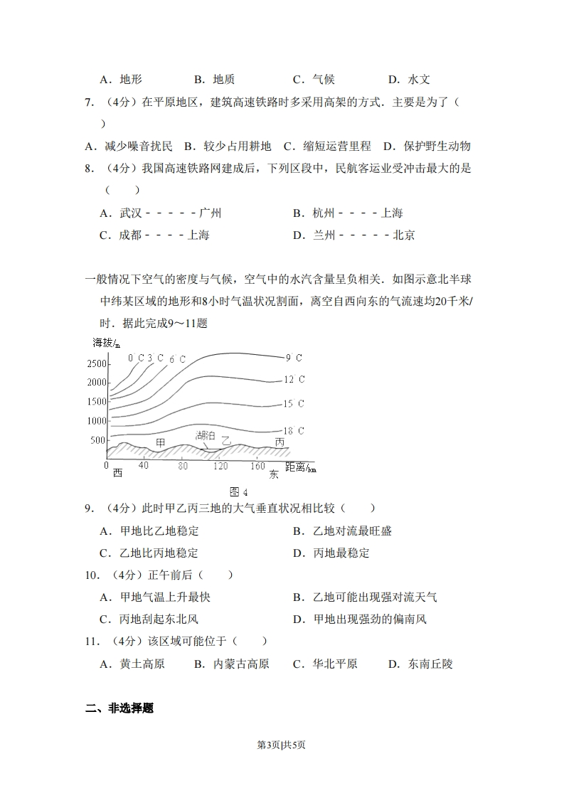 2011年全国统一高考地理试卷(大纲卷)一、选择题.第卷共4小题,每小题0分,共140分.在媒体给出的四个选项中,只有一项是复合题目要求的。读图,完成1~2题1.(4分)组成该山体岩石的矿物直接来自()A.地表B.地壳上部C.地壳下部D.地幔2.(4分)在岩石圈物质循环过程中,该山体岩石在地球表层可转化为(A,喷出岩B.侵入岩C.沉积岩D.变质岩芝加哥是美国五大湖区最大的城市,其位置见如图。1848年修通联系密西西比河水系和五大湖的运河,随后兴建铁路并形成以芝加哥为中心的放射状铁路网。这段时期,芝加哥工业主要有农产品加工、农具、交通工具等生产部门。1890年,芝加哥人口达到100万。20世纪上半叶,芝加哥发展以钢铁为主导的重工业,并成为20世纪美国最大的钢铁工业基地。据此完成3~5。3.(4分)1848年后,芝加哥成为美国中西部农产品集散中心的主导区位条件是()第1页供5页铁矿■煤矿0首都0其他城市山一运河河-…国界A.濒临五大湖B.位于美国中西部的中心位置C.位于密西西比河航运的上游起点D,位于密西西比河与五大湖的转运地点4.(4分)20世纪之前,芝加哥的工业活动主要联系()A.芝加哥周边农村地区B.五大湖沿岸各城市C.美国东北部工业区D.美国本土5.(4分)芝加哥发展钢铁工业最有利的条件是()A.良好的工业基础B.便捷的交通运输C.充足的劳动力D.丰富的原料和燃料到2010年底,我国投入运营的调整铁路约7500千米.图3显示我国某段高速铁路景观.据此完成6~8题.6,(4分)为了保持列车高速运行,高速铁路运线时首要考虑的自然元素是(第2页供5页