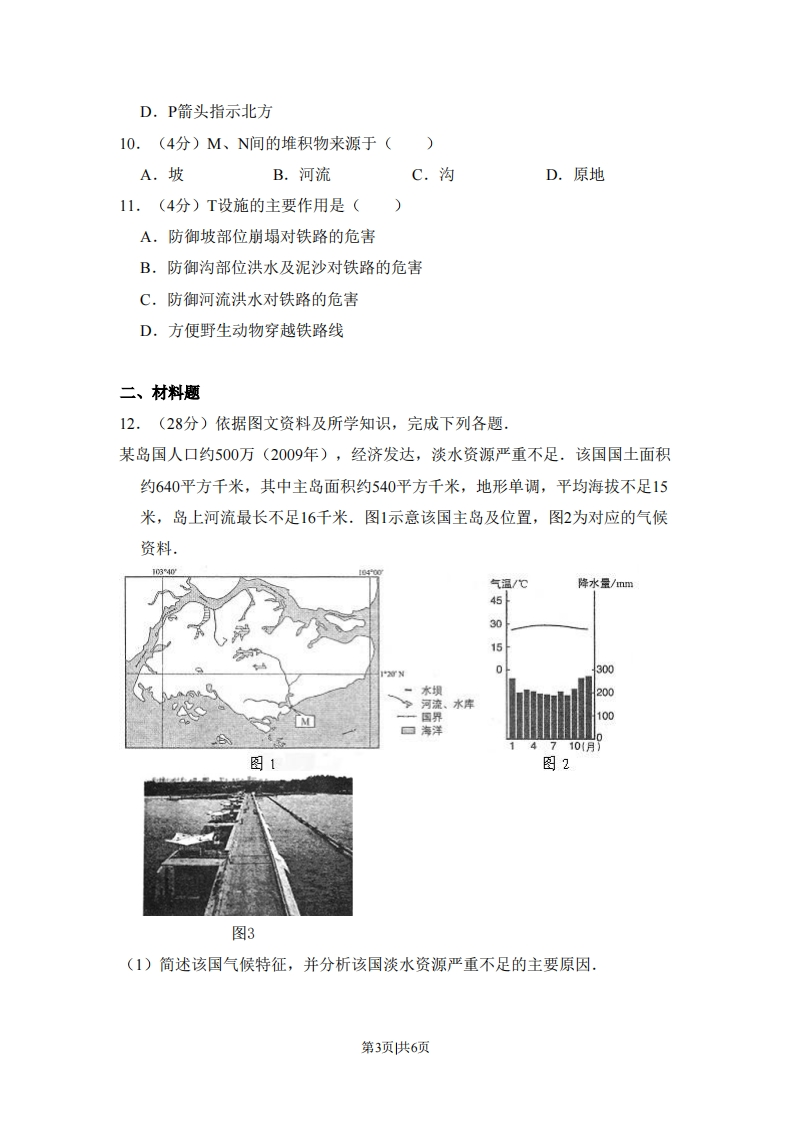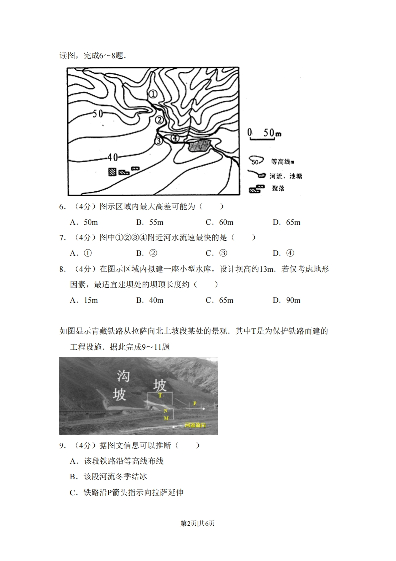 2011年全国统一高考地理试卷(新课标)一、选择题日本某汽车公司在中国建有多个整车生产厂和零件生产厂.2011年3月11日东日本大地震及随后的海啸、核辐射灾难,使该公司在灾区的工厂停产,受其影响,该公司在中国的整车生产厂也被迫减产,据此完成1~2题,1.(4分)该公司在中国建零部件生产厂,主要目的是()A.避免自然灾害对本土汽车生产的影响B.为其中国整车厂配套,降低整车生产成本C.利用中国廉价劳动力,为其日本整车厂服务D.建立其全球整车生产的零部件工业基地2.(4分)中国整车生产厂被迫减产是由于该公司在灾区有()A.研发中心B.一般零部件厂C.核心零部件厂D.整车厂第二次世界大战后,美国通过大量技术投入和大规模专业化生产,成为世界最大的大豆生产国和出口国.巴西自20世纪70年代开始种植大豆,在积极培育优良品种的同时,鼓励农民组建农场联合体,实现了大豆的规模化生产与经营.目前,巴西的大豆产量、出口量仅次于美国.中国曾是世界最大的大豆生产国和出口国,近些年大豆的质量下降(品种退化,出油率低),生产成本较高,成为世界最大的大豆进口国.据此完成3~5题,3.(4分)巴西大豆总产量增加的潜力大于美国,主要是因为巴西()A,技术力量较雄厚B.气候条件较优越C.可开垦的土地资源较丰富D.劳动力较充足4.(4分)在国际市场上,巴西大豆价格低于美国的主要原因是巴西()A.专业化水平较高B.科技投入较大C.劳动生产率较高D.劳动力价格较低5.(4分)中国要提高大豆质量需()A.加大科技投入B.扩大种植面积C.增加劳动力投入D.加大化肥使用量第1页共6页读图,完成6~8题.050m4050D等高线m母口河流、池塘58聚落6.(4分)图示区域内最大高差可能为()A.50mB.55mC.60mD.65m7.(4分)图中①②③④附近河水流速最快的是()A.①B.②C.③D.④8.(4分)在图示区域内拟建一座小型水库,设计坝高约13m.若仅考虑地形因素,最适宜建坝处的坝顶长度约()A.15mB.40mC.65mD.90m如图显示青藏铁路从拉萨向北上坡段某处的景观.其中T是为保护铁路而建的工程设施.据此完成9~11题沟坡河流流向9.(4分)据图文信息可以推断()A.该段铁路沿等高线布线B.该段河流冬季结冰C.铁路沿P箭头指示向拉萨延伸第2页共6页