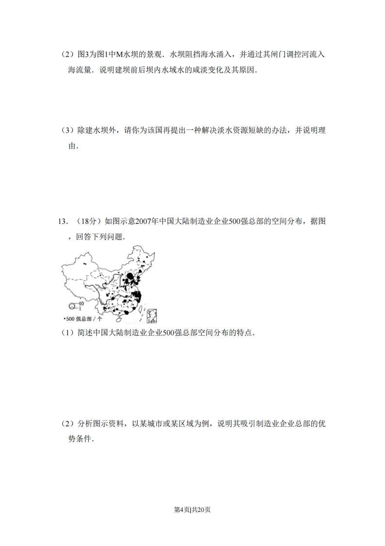 2011年全国统一高考地理试卷(新课标)一、选择题日本某汽车公司在中国建有多个整车生产厂和零件生产厂.2011年3月11日东日本大地震及随后的海啸、核辐射灾难,使该公司在灾区的工厂停产,受其影响,该公司在中国的整车生产厂也被迫减产,据此完成1~2题,1.(4分)该公司在中国建零部件生产厂,主要目的是()A.避免自然灾害对本土汽车生产的影响B.为其中国整车厂配套,降低整车生产成本C.利用中国廉价劳动力,为其日本整车厂服务D.建立其全球整车生产的零部件工业基地2.(4分)中国整车生产厂被迫减产是由于该公司在灾区有()A.研发中心B.一般零部件厂C.核心零部件厂D.整车厂第二次世界大战后,美国通过大量技术投入和大规模专业化生产,成为世界最大的大豆生产国和出口国.巴西自20世纪70年代开始种植大豆,在积极培育优良品种的同时,鼓励农民组建农场联合体,实现了大豆的规模化生产与经营.目前,巴西的大豆产量、出口量仅次于美国.中国曾是世界最大的大豆生产国和出口国,近些年大豆的质量下降(品种退化,出油率低),生产成本较高,成为世界最大的大豆进口国.据此完成3~5题,3.(4分)巴西大豆总产量增加的潜力大于美国,主要是因为巴西()A,技术力量较雄厚B.气候条件较优越C.可开垦的土地资源较丰富D.劳动力较充足4.(4分)在国际市场上,巴西大豆价格低于美国的主要原因是巴西()A.专业化水平较高B.科技投入较大C.劳动生产率较高D.劳动力价格较低5.(4分)中国要提高大豆质量需()A.加大科技投入B.扩大种植面积C.增加劳动力投入D.加大化肥使用量第1页共20页读图,完成6~8题.050m4050D等高线m母口河流、池塘58聚落6.(4分)图示区域内最大高差可能为()A.50mB.55mC.60mD.65m7.(4分)图中①②③④附近河水流速最快的是()A.①B.②C.③D.④8.(4分)在图示区域内拟建一座小型水库,设计坝高约13m.若仅考虑地形因素,最适宜建坝处的坝顶长度约()A.15mB.40mC.65mD.90m如图显示青藏铁路从拉萨向北上坡段某处的景观.其中T是为保护铁路而建的工程设施.据此完成9~11题沟坡河流流向9.(4分)据图文信息可以推断()A.该段铁路沿等高线布线B.该段河流冬季结冰C.铁路沿P箭头指示向拉萨延伸第2页共20页