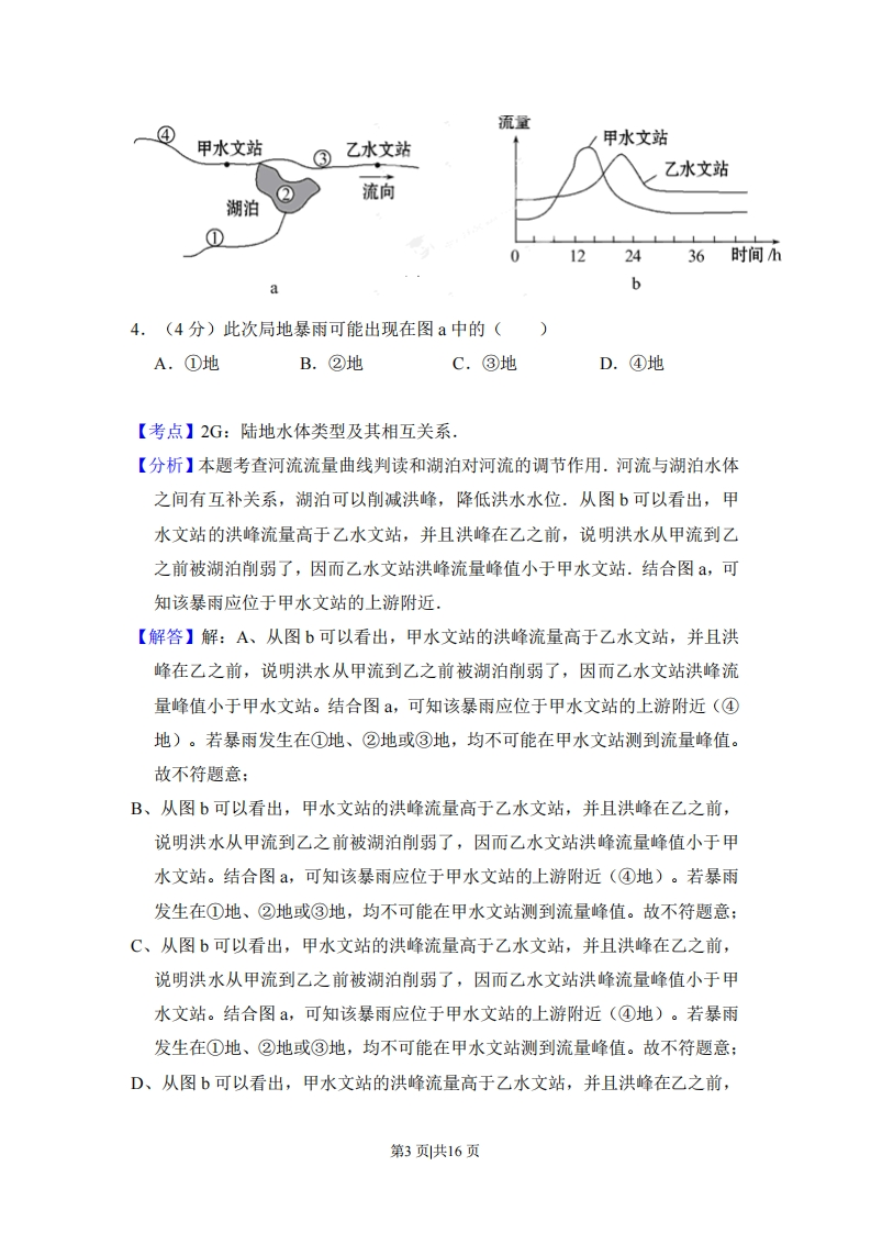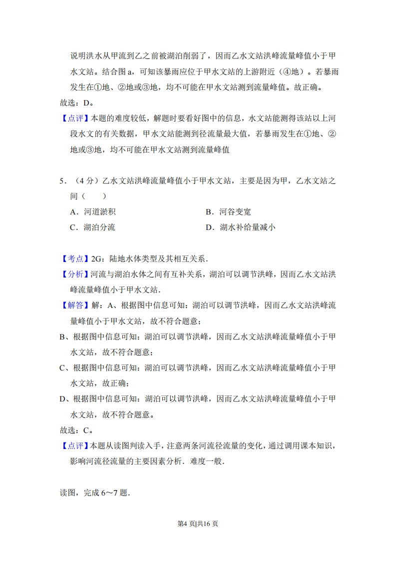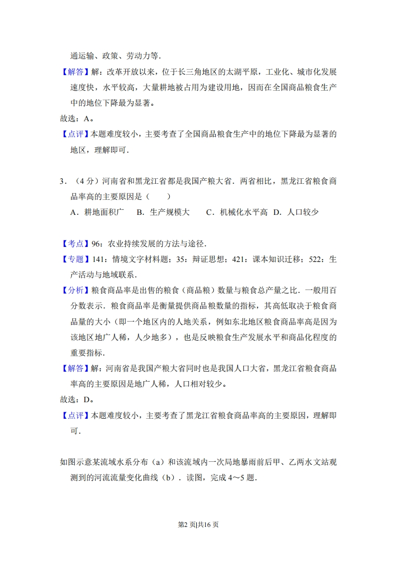 2012年全国统一高考地理试卷(新课标)事考答来与试想解析一、选择题(共5小题,每小题0分,满分0分)随着工业化、城市化的飞速发展,耕地不断被挤占,但2004年以来,我国粮食总量仍连续增长.据此完成1~3题1.(4分)近年来,我国粮食总产量连续增长的主要原因是()A.扩大了粮食播种面积B.加大了农业科技投入C.改进了农田水利设施D.完善了粮食流通体系【考点】98:工业化和城市化产生的问题及应对措施.【专题】141:情境文字材料题:35:辩证思想:421:课本知识迁移:522:生产活动与地域联系。【分析】影响农业的主要区位因素:气候、地形、水源、土壤、市场、技术、交通运输、政策、劳动力等,【解答】解:近年来,我国粮食总产量连续增长的主要原因是加大了农业科技投入。故选:B。【点评】本题难度较小,主要考查了影响农业的主要区位因素,理解即可.2.(4分)改革开放以来,下列粮食主要产区在全国商品粮食生产中的地位下降最为显著的是()A.太湖平原B.洞庭湖平原C.汉江平原D.成都平原【考点】96:农业持续发展的方法与途径.【专题】141:情境文字材料题:35:辩证思想:421:课本知识迁移:522:生产活动与地域联系,【分析】影响农业的主要区位因素:气候、地形、水源、土壤、市场、技术、交第1页共16页通运输、政策、劳动力等【解答】解:改革开放以来,位于长三角地区的太湖平原,工业化、城市化发展速度快,水平较高,大量耕地被占用为建设用地,因而在全国商品粮食生产中的地位下降最为显著。故选:A。【点评】本题难度较小,主要考查了全国商品粮食生产中的地位下降最为显著的地区,理解即可.3.(4分)河南省和黑龙江省都是我国产粮大省.两省相比,黑龙江省粮食商品率高的主要原因是()A.耕地面积广B.生产规模大C.机械化水平高D.人口较少【考点】96:农业持续发展的方法与途径,【专题】141:情境文字材料题:35:辩证思想:421:课本知识迁移:522:生产活动与地域联系,【分析】粮食商品率是出售的粮食(商品粮)数量与粮食总产量之比.一般用百分数表示.粮食商品率是衡量提供商品粮数量的指标,其高低取决于粮食商品量的大小(即一个地区内的人地关系,例如东北地区粮食商品率高是因为该地区地广人稀,人少地多),也是反映粮食生产发展水平和商品化程度的重要指标。【解答】解:河南省是我国产粮大省同时也是我国人口大省,黑龙江省粮食商品率高的主要原因是地广人稀,人口相对较少。故选:D。【点评】本题难度较小,主要考查了黑龙江省粮食商品率高的主要原因,理解即可如图示意某流域水系分布()和该流域内一次局地暴雨前后甲、乙两水文站观测到的河流流量变化曲线(b),读图,完成4~5题.第2页共16页