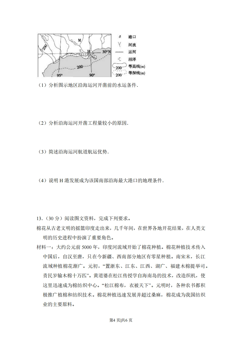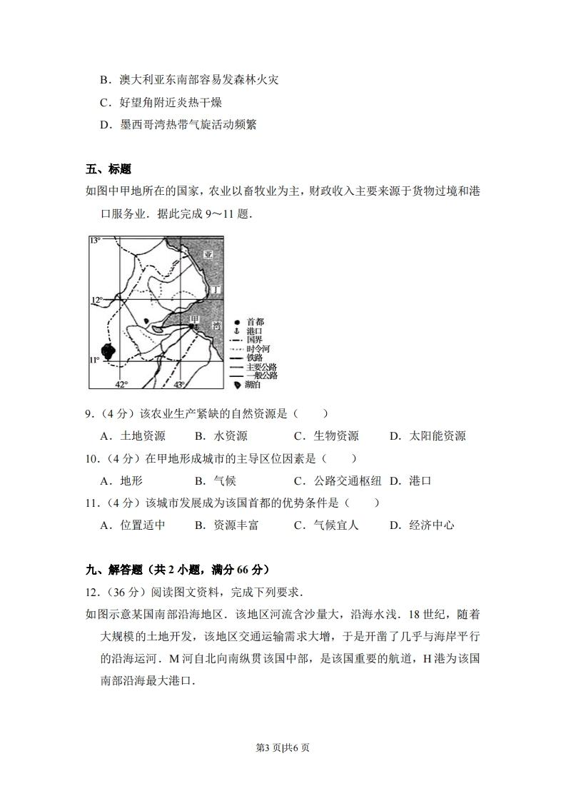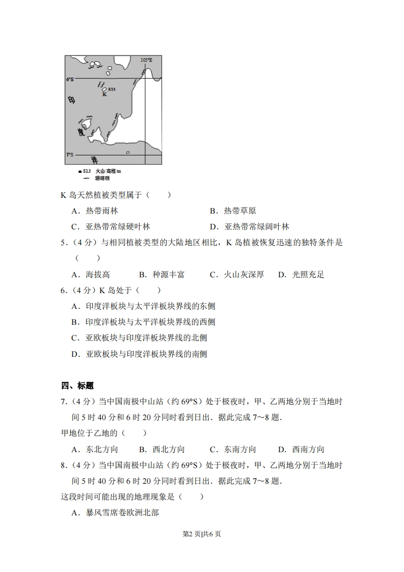 2014年全国统一高考地理试卷(大纲版)一、选择题美国M公司在我国投资建设某电子产品生产厂,零部件依靠进口,产品全部销往美国,产品的价格构成如图所示.据此完成1~3题.零部件供应经销商商35%37.5%M公司生产20%7.5%销售价格100%1.(4分)M公司的电子产品生产厂可以在全球选址,主要是因为()A.产品和零部件的运输成本相对较低B.产品技术要求高,需要多国合作C.异国生产可以提高产品的附加值D.能降低原材料成本,扩大国际市场2.(4分)M公司将电子产品生产厂由美国转移至中国,主要原因是中国()A.市场广阔B.劳动力价格低C.交通运输方便D.原材料丰富3.(4分)我国进一步发展电子信息产业,下列措施最有利的是()A,扩大电子信息产品生产环节的国际引进B,提高电子信息产品生产环节的利益比重C.加大电子信息产品高附加值环节的投入D.限制电子信息产品生产环节的国际引进三、标题4.(4分)如图中K岛于1983年火山爆发,植被消失殆尽.1987年,该岛上已有64种植物生长旺盛.据研究,百年之内该岛上的天然植被就可以恢复.据此完成4~6题.第1页供6页105E21379。813火山高程如K岛天然植被类型属于()A.热带雨林B.热带草原C.亚热带常绿硬叶林D.亚热带常绿阔叶林5,(4分)与相同植被类型的大陆地区相比,K岛植被恢复迅速的独特条件是()A.海拔高B.种源丰富C.火山灰深厚D.光照充足6.(4分)K岛处于()A,印度洋板块与太平洋板块界线的东侧B.印度洋板块与太平洋板块界线的西侧C.亚欧板块与印度洋板块界线的北侧D.亚欧板块与印度洋板块界线的南侧四、标题7.(4分)当中国南极中山站(约69S)处于极夜时,甲、乙两地分别于当地时间5时40分和6时20分同时看到日出.据此完成7~8题.甲地位于乙地的()A.东北方向B.西北方向C.东南方向D.西南方向8.(4分)当中国南极中山站(约69S)处于极夜时,甲、乙两地分别于当地时间5时40分和6时20分同时看到日出.据此完成7~8题.这段时间可能出现的地理现象是()A,暴风雪席卷欧洲北部第2页供6页