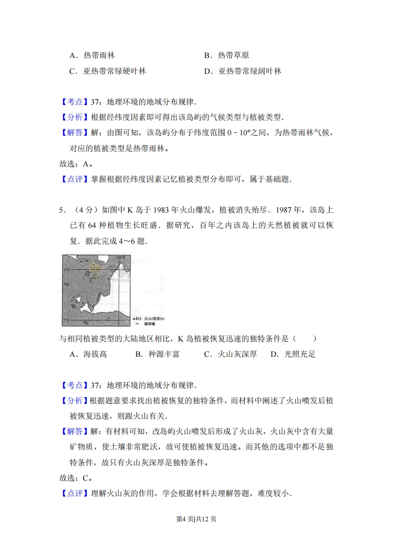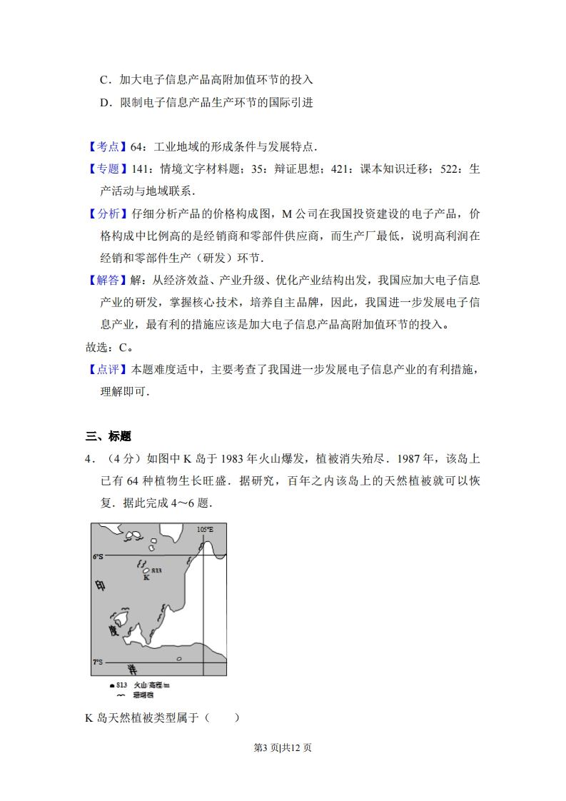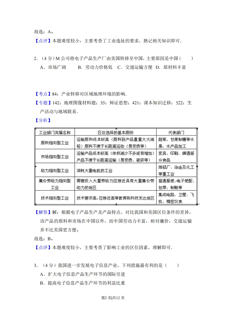 2014年全国统一高考地理试卷(大纲版)事考答来与试想解析一、选择题美国M公司在我国投资建设某电子产品生产厂,零部件依靠进口,产品全部销往美国,产品的价格构成如图所示.据此完成1~3题.零部件供应经销离商35%375%M公司生产209%7.5%销售价格100%1.(4分)M公司的电子产品生产厂可以在全球选址,主要是因为()A.产品和零部件的运输成本相对较低B.产品技术要求高,需要多国合作C.异国生产可以提高产品的附加值D.能降低原材料成本,扩大国际市场【考点】64:工业地域的形成条件与发展特点.【专题】142:地理图像材料题:35:辩证思想:421:课本知识迁移:522:生产活动与地域联系,【分析】阅读材料,M公司的电子产品生产厂市场在美国,零部件(原料)依靠进口,说明主要是利用我国的劳动力:读图可知,产品的价格构成中生产厂只占7.5%,最低,对提高产品的附加值没有多大影响.注意审题,问的是“可以选址”的原因.电子产品一般体积小,重量轻,价格贵,所以产品和零部件的运输成本相对较低,是M公司的电子产品生产厂可以在全球选址的主要原因【解答】解:M公司的电子产品生产厂可以在全球选址,主要是因为产品和零部件的运输成本相对较低。第1页共12页故选:A。【点评】本题难度较小,主要考查了工业选址的要求,熟记相关知识即可.2.(4分)M公司将电子产品生产厂由美国转移至中国,主要原因是中国(A.市场广阔B.劳动力价格低C.交通运输方便D.原材料丰富【考点】84:产业转移对区域地理环境的影响.【专题】142:地理图像材料题:35:辩证思想:421:课本知识迁移:522:生产活动与地域联系.【分析】工业部门类属名称区位选择的基本原侧代表部门运输原料成本较高(原科到产品重量大大减甜菜、甘蔗制糖等水原料指向型工业轻)原料不便于长距离运动(易变质等)果、水产品加工运输产品成本较高(体积减少不多或有增加)家具、印刷、啤酒部市场指向型工业产品不便于长距离运输(易变质、破碎等)分食品炼铝厂、治金及化工动力指向型工业消耗大量电能的工业等重工业廉价劳动力指向型需要投入大量劳动力应接近具有大量廉价劳普通服装、电子装配、工业动力的地区包带、制鞋等集成电路、卫星、飞技术指向型工业技术要求高,应接近高等教育和科技发达地区机、精密仪表【解答】解:根据电子产品生产及产品特点,对比我国和美国区位条件的差异,该产品的原料和市场在中国以外,而中国劳动力丰富,相对廉价,交通运输并不比美国更方便。故选:B。【点评】本题难度较小,主要考查了影响工业的区位因素,理解即可.3.(4分)我国进一步发展电子信息产业,下列措施最有利的是()A.扩大电子信息产品生产环节的国际引进B.提高电子信息产品生产环节的利益比重第2页共12页