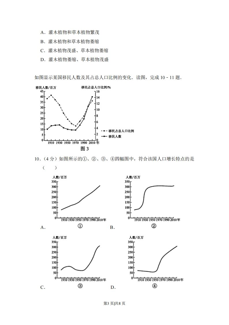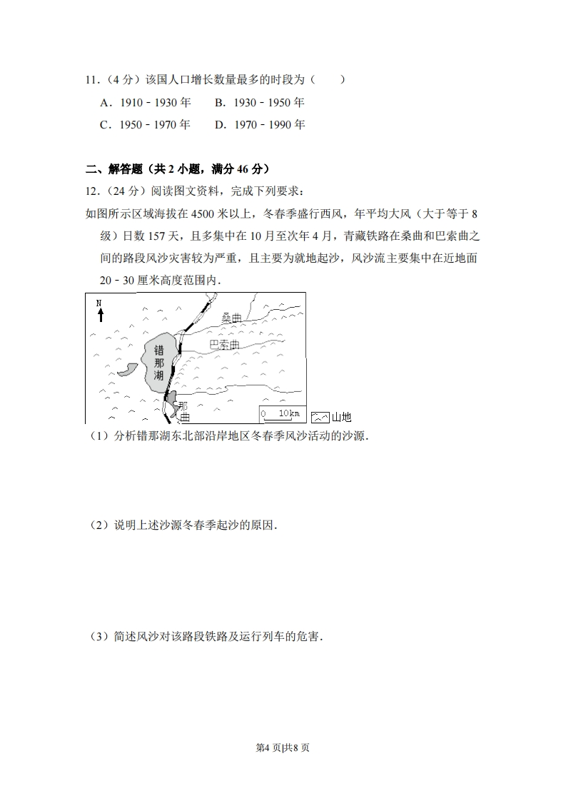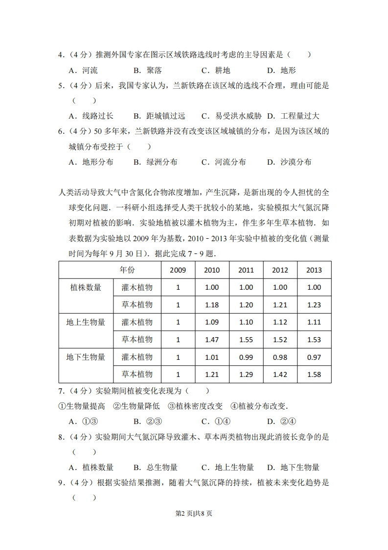 2014年全国统一高考地理试卷(新课标I)一、本卷共4小题.每小题0分.在每个小题给出的四个选项中,只有一项是符合题目要求的,太阳能光热电站(如图)通过数以十万计的反光版聚焦太阳能,给高塔顶端的锅炉加热,产生蒸汽,驱动发电机发电.据此完成1-3题.电站远景反光板1.(4分)我国下列地区中,资源条件最适宜建太阳能光热电站的是()A.柴达木盆地B.黄土高原C.山东半岛D.东南丘陵2.(4分)太阳能光热电站可能会()A.提升地表温度B.干扰飞机电子导航C.误伤途径飞鸟D.提高作物产量3.(4分)若在北回归线上建一太阳能光热电站,其高塔正午影长于塔高的比值为P,则()A.春、秋分日P=0B.夏至日P>0C.全年日P<1D.冬至日P>120世纪50年代,在外国专家的指导下,我国修建了兰新铁路.兰新铁路在新疆吐鲁番附近的线路如图所示.读图,完成4-6题.天山100043吐鲁番市⊙部善县200火车站500铁路1000030 kmC200等高线/m90第1页供8页4.(4分)推测外国专家在图示区域铁路选线时考虑的主导因素是()A,河流B.聚落C.耕地D.地形5,(4分)后来,我国专家认为,兰新铁路在该区域的选线不合理,理由可能是()A.线路过长B.距城镇过远C.易受洪水威胁D.工程量过大6.(4分)50多年来,兰新铁路并没有改变该区域城镇的分布,是因为该区域的城镇分布受控于()A.地形分布B.绿洲分布C.河流分布D.沙漠分布人类活动导致大气中含氮化合物浓度增加,产生沉降,是新出现的令人担忧的全球变化问题.一科研小组选择受人类干扰较小的某地,实验模拟大气氮沉降初期对植被的影响.实验地植被以灌木植物为主,伴生多年生草本植物.如表数据为实验地以2009年为基数,2010-2013年实验中植被的变化值(测量时间为每年9月30日).据此完成7-9题.年份20092010201120122013植株数量灌木植物11.001.001.001.00草本植物1.181.201.211.23地上生物量灌木植物11.091.101.121.11草本植物11.471.551.521.53地下生物量灌木植物1.010.990.980.97草本植物11.211.291.421.587.(4分)实验期间植被变化表现为(①生物量提高②生物量降低③植株密度改变④植被分布改变,A.①③B.②③C.①④D.②④8.(4分)实验期间大气氮沉降导致灌木、草本两类植物出现此消彼长竞争的是()A.植株数量B.总生物量C.地上生物量D.地下生物量9,(4分)根据实验结果推测,随着大气氮沉降的持续,植被未来变化趋势是()第2页供8页