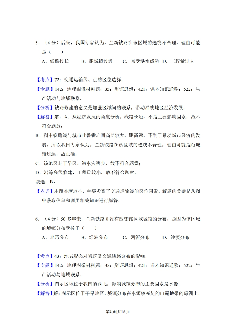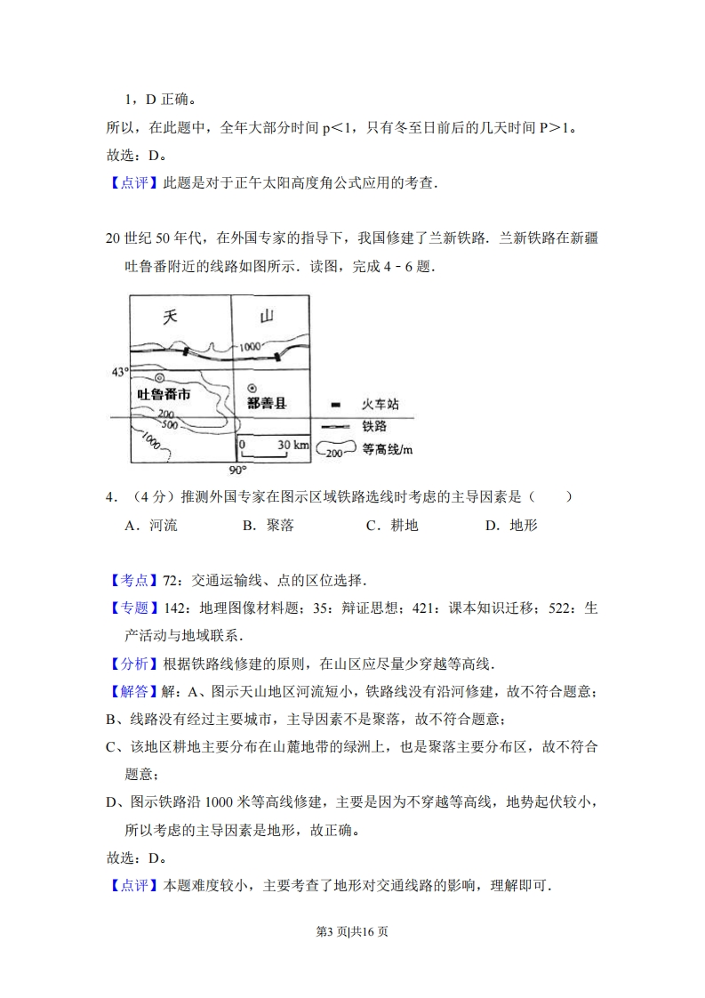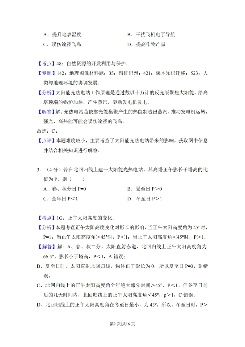 2014年全国统一高考地理试卷(新课标)事考答案与试题佩析一、本卷共4小题。每小题0分.在每个小题给出的四个选项中,只有一项是符合题目要求的,太阳能光热电站(如图)通过数以十万计的反光版聚焦太阳能,给高塔顶端的锅炉加热,产生蒸汽,驱动发电机发电.据此完成1-3题.电站远景反光板1.(4分)我国下列地区中,资源条件最适宜建太阳能光热电站的是()A.柴达木盆地B.黄土高原C.山东半岛D.东南丘陵【考点】16:太阳能量的来源及其对地球的影响.【分析】我国太阳能资源分布的主要特点太阳能的高值中心和低值中心都处在北纬22N~35N这一带,青藏高原是高值中心,四川盆地是低值中心:太阳年辐射总量,西部地区高于东部地区,而且除西藏和新疆两个自治区外,基本上是南部低于北部:由于南方多数地区云雾雨多,在30N~40N地区,太阳能的分布情况与一般的太阳能随纬度而变化的规律相反,太阳能不是随着纬度的增加而减少,而是随着纬度的增加而增长,【解答】解:柴达木盆地位于我国太阳能资源高值区,人口稀少,有大面积的未利用土地。所以最适宜建太阳能电站。故选:A。【点评】本题考查太阳能量的来源及其对地球的影响,主要掌握我国太阳能资源的分布,熟悉我国的主要地理区域,是基础知识2.(4分)太阳能光热电站可能会()第1页共16页A.提升地表温度B.干扰飞机电子导航C.误伤途径飞鸟D.提高作物产量【考点】48:自然资源的开发利用与保护【专题】142:地理图像材料题:35:辩证思想:421:课本知识迁移:523:人类与地理环境的协调发展,【分析】太阳能光热电站工作原理是通过数以十万计的反光版聚焦太阳能,给高塔顶端的锅炉加热,产生蒸汽,驱动发电机发电【解答】解:光热电站是依靠光能集聚产生的热能制造出蒸汽,推动发电机运转,强光、高热能可能会误伤途径的飞鸟。故选:C。【点评】本题难度较小,主要考查了太阳能光热电站带来的影响,获取图中信息并结合相关知识进行解答.3.(4分)若在北回归线上建一太阳能光热电站,其高塔正午影长于塔高的比值为P,则()A.春、秋分日P=0B.夏至日P>0C.全年日P<1D.冬至日P>1【考点】1G:正午太阳高度的变化【分析】本题考查正午太阳高度变化对影长的影响,当正午太阳高度角为45时,P=1:当正午太阳高度角>45时,P<1:当正午太阳高度角<45时,P>1.【解答】解:A、春、秋二分,太阳直射赤道,北回归线上正午太阳高度角为66.5°,影长小于塔高,P<1,A错误:B、夏至日时,太阳直射北回归线,物体正午影长为0,所以夏至日P=0,B错误。C、北回归线上的正午太阳高度角全年绝大部分时间>45°,P<1,但冬至日前后的几天时间内,北回归线上的正午太阳高度角<45°,p>1,C错误:D、北回归线上的正午太阳高度角在冬至日最小,为43°,所以,冬至日时,P>第2页共16页