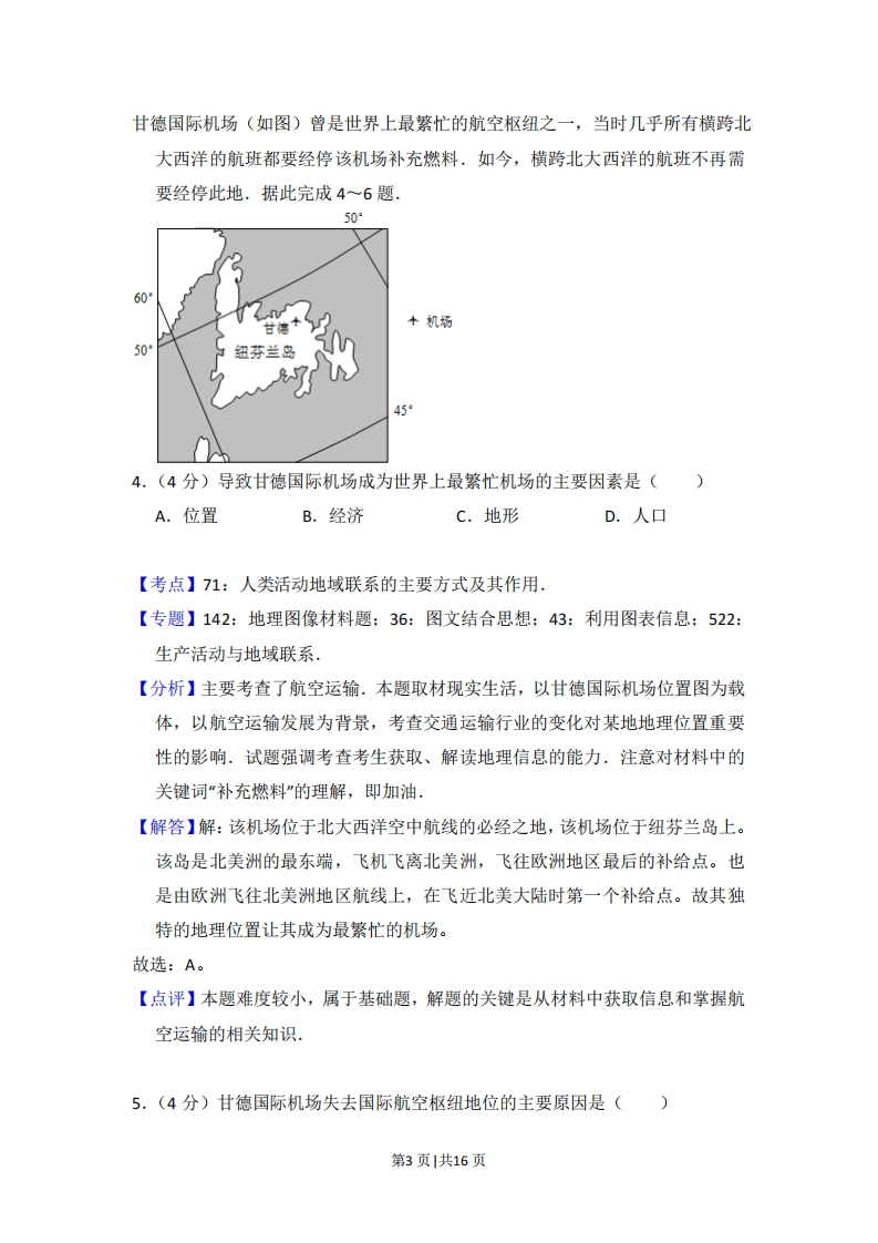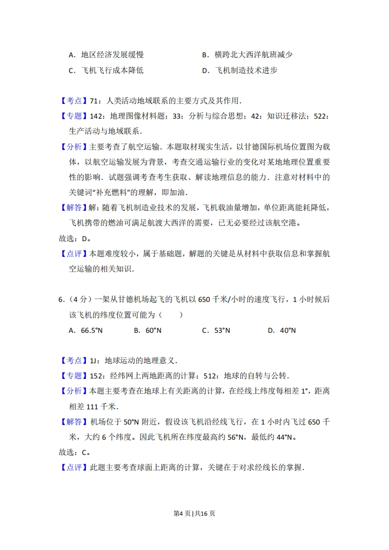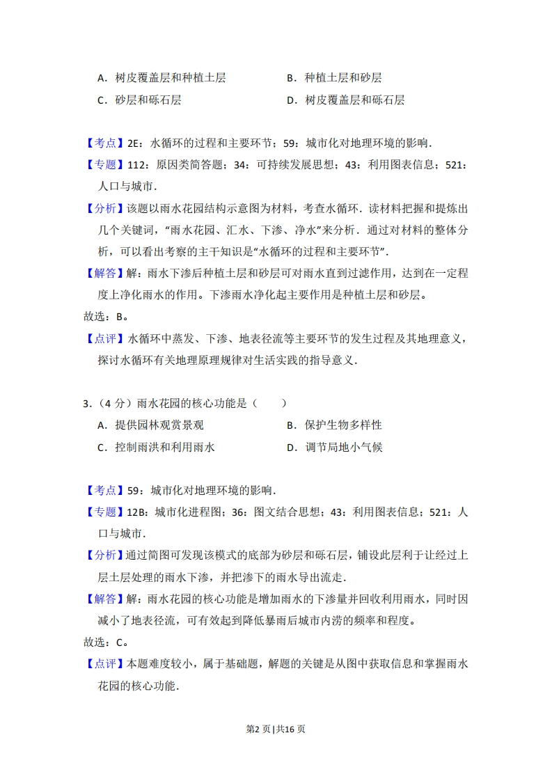 2015年全国统一高考地理试卷(新课标I)事考答案与试题佩折一、选择题(每小题0分)雨水花园是一种模仿自然界雨水汇集、渗漏而建设的浅凹绿地,主要用于汇聚并吸收来自屋顶或地面的雨水,并通过植物及各填充层的综合作用使渗漏的雨水得到净化.净化后的雨水不仅可以补给地下水,也可以作为城市景观用水、厕所用水等.图1示意雨水花园结构.据此完成1~3题.人树支爱盖层砂层乐石层1.(4分)铺设树皮覆盖层的主要目的是()A.为植物提供养分B.控制雨水渗漏速度C.吸附雨水污染物D.保持土壤水分【考点】59:城市化对地理环境的影响.【专题】12B:城市化进程图:36:图文结合思想:43:利用图表信息:521:人口与城市.【分析】通过简图可发现该模式的底部为砂层和砾石层,铺设此层利于让经过上层土层处理的雨水下渗,并把渗下的雨水导出流走。【解答】解:该雨水花园地下部分含水量变化很大,为保证地表植物生长,必须保持土壤合适的水分条件,覆盖树皮可达到此目的。故选:D。【点评】本题难度较小,属于基础题,解题的关键是从材料中获取信息和掌握铺设树皮覆盖层的主要目的。2.(4分)对下渗雨水净化起主要作用的填充层是()第1页|共16页A.树皮覆盖层和种植土层B.种植土层和砂层C.砂层和砾石层D.树皮覆盖层和砾石层【考点】2:水循环的过程和主要环节:59:城市化对地理环境的影响.【专题】112:原因类简答题:34:可持续发展思想:43:利用图表信息:521:人口与城市【分析】该题以雨水花园结构示意图为材料,考查水循环.读材料把握和提炼出几个关键词,“雨水花园、汇水、下渗、净水”来分析.通过对材料的整体分析,可以看出考察的主干知识是“水循环的过程和主要环节”,【解答】解:雨水下渗后种植土层和砂层可对雨水直到过滤作用,达到在一定程度上净化雨水的作用。下渗雨水净化起主要作用是种植土层和砂层。故选:B。【点评】水循环中蒸发、下渗、地表径流等主要环节的发生过程及其地理意义,探讨水循环有关地理原理规律对生活实践的指导意义,3.(4分)雨水花园的核心功能是()A.提供园林观赏景观B.保护生物多样性C.控制雨洪和利用雨水D.调节局地小气候【考点】59:城市化对地理环境的影响.【专题】12B:城市化进程图:36:图文结合思想:43:利用图表信息:521:人口与城市.【分析】通过简图可发现该模式的底部为砂层和砾石层,铺设此层利于让经过上层土层处理的雨水下渗,并把渗下的雨水导出流走,【解答】解:雨水花园的核心功能是增加雨水的下渗量并回收利用雨水,同时因减小了地表径流,可有效起到降低暴雨后城市内涝的频率和程度。故选:C。【点评】本题难度较小,属于基础题,解题的关键是从图中获取信息和掌握雨水花园的核心功能,第2页1共16页