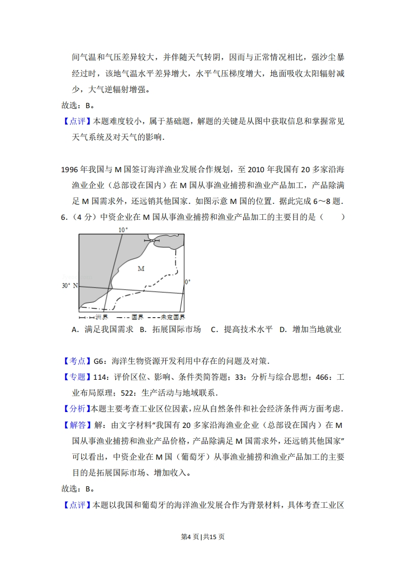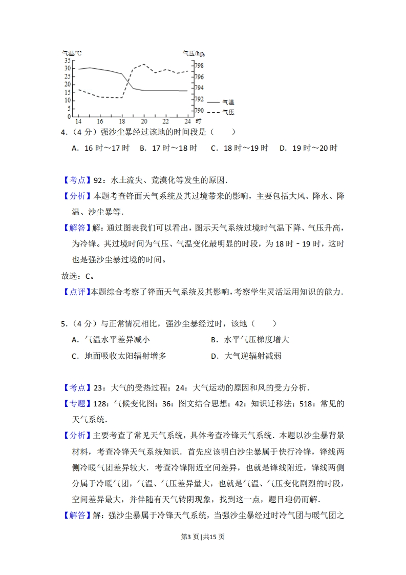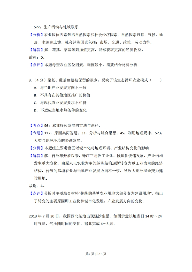 2015年全国统一高考地理试卷(新课标Ⅱ)事考答来与试想解析一、选择题.每小题0分,共44分,在每个小题给出的四个选项中,只有一项是符合题目要求的.桑基、蔗基、果基鱼塘是珠江三角洲地区传统的农业景观和被联合国推介的典型生态循环农业模式.改革开放以来,随着工业化和城镇化的快速发展,传统的基塘农业用地大部分变为建设用地,保留下来的基塘也变为以花基、菜基为主.据此完成1~3题,1.(4分)该地基塘转变为建设用地对局地气候的影响是()A.大气湿度增高B.大气降水增多C.近地面风速增大D.气温变率增大【考点】2B:影响气候的主要因素,【专题】112:原因类简答题:33:分析与综合思想:45:利用地理规律:51B:气候的类型与分布,【分析】本题主要考查影响气候的主要因素.【解答】解:“该地基塘转变为建设用地”表明下垫面发生变化,建设用地即比热容变小,升温快,降温亦快,温差变大。故选:D。【点评】影响气候的因素主要有纬度位置、大气环流、海陆分布、地形、洋流等,人类活动对气候也有影响.2.(4分)农民用花基、菜基鱼塘取代桑基、蔗基鱼塘的直接目的是()A.提高土壤质量B.节省劳动力C.促进生态循环D.提高经济收入【考点】61:影响农业区位因素.【专题】141:情境文字材料题:34:可持续发展思想:422:地理知识生活化:第1页1共15页522:生产活动与地域联系,【分析】农业区位因素包括自然因素和社会经济因素.自然因素包括:气候、地形、水源和土壤,社会经济因素包括:市场、交通、政策、劳动力等【解答】解:花基、菜基等附加值更高,能够获取更高的经济收益。故选:D。【点评】本题考查农业区位因素,难度较小,需要结合材料分析.3.(4分)桑基、蔗基鱼塘被保留的很少,反映了该生态循环农业模式()A.与当地产业发展方向不一致B.不具有在其他地区推广的价值C.与现代农业发展要求不相符D.不适应当地水热条件的变化【考点】96:农业持续发展的方法与途径.【专题】112:原因类简答题;33:分析与综合思想:45:利用地理规律:523:人类与地理环境的协调发展,【分析】本题组主要考查区域城市化对地理环境、产业结构变化的影响。【解答】解:自改革开放以来,珠江三角洲工业化、城镇化快速发展,产业结构发生重大变化,由原来以农业为主的经济结构逐渐转变为以工业为主的经济结构,传统的基塘农业与当地产业发展方向不一致,导致大部分湿地变为建设用地。故选:A。【点评】分析时主要结合材料“传统的基塘农业用地大部分变为建设用地”,指出了转变的主要原因即工业化和城市化发展,产业发展方向的变化2013年7月30日,我国西北某地出现强沙尘暴.如图示意该地当日14时~24时气温、气压随时间的变化.据此完成4一5题.第2页|共15页