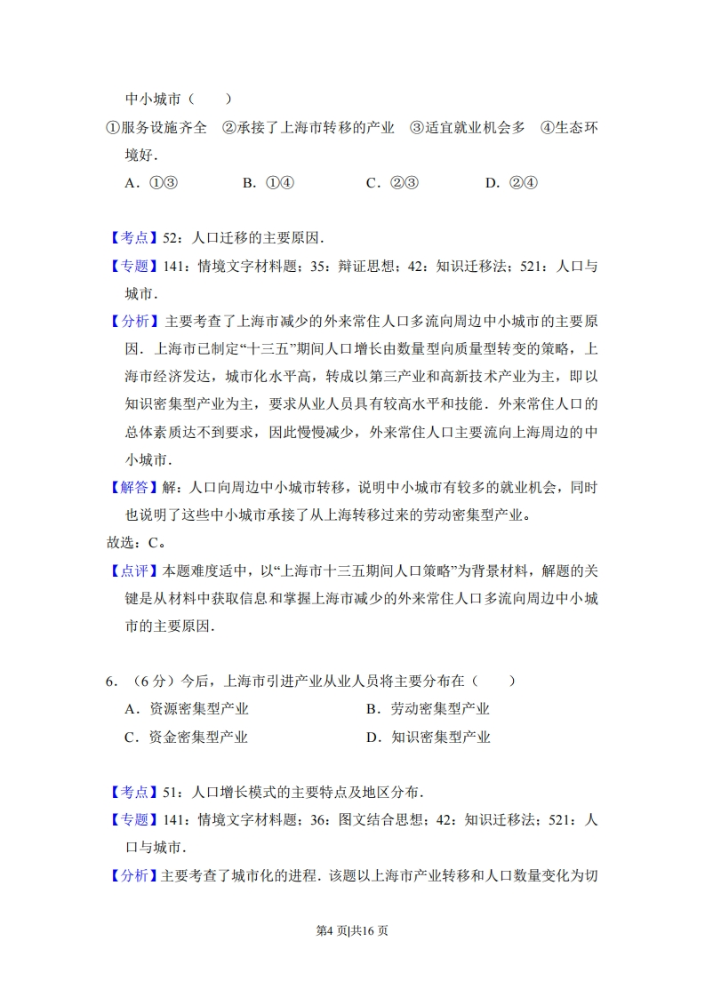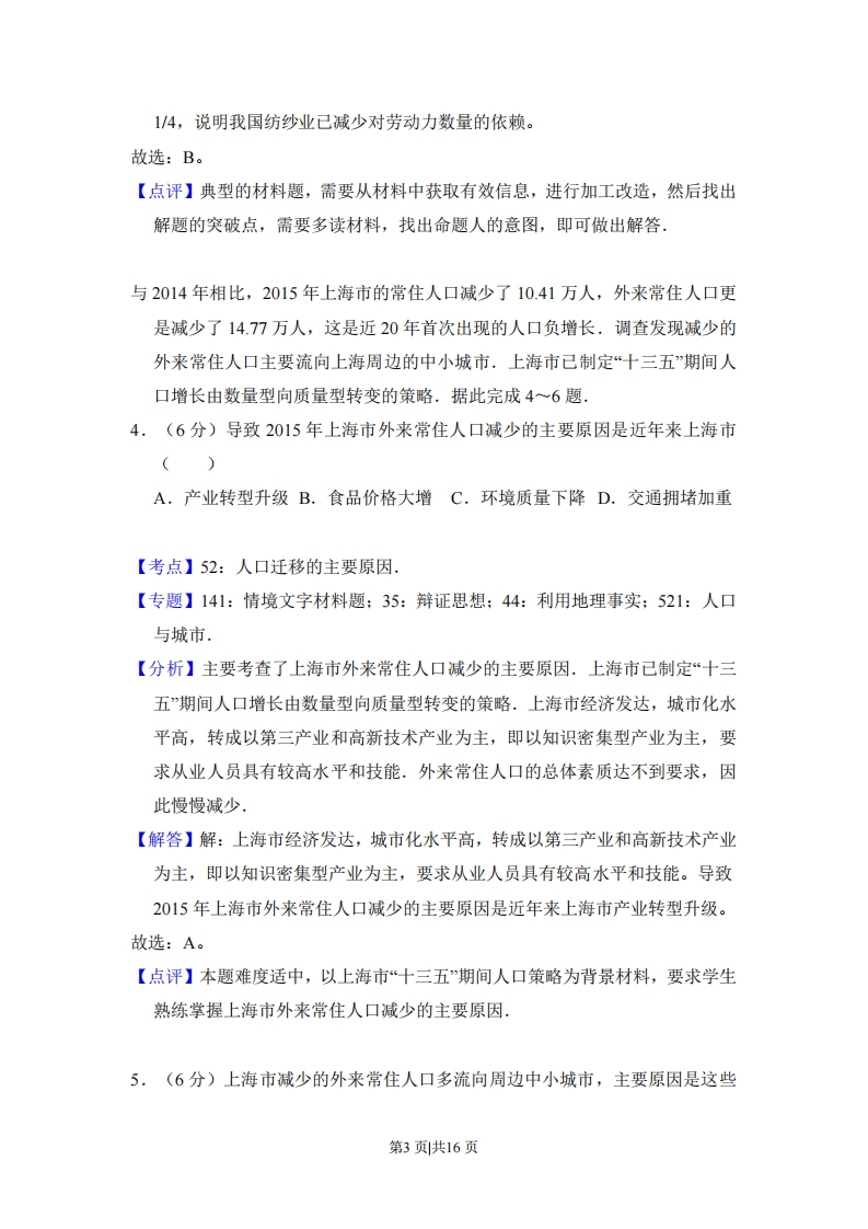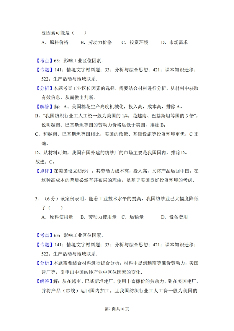 2016年全国统一高考地理试卷(新课标)考答来与试题解析一、选择题目前,我国为保护棉农利益,控制国际棉花进口,国内的棉花价格约比国际市场高马;我国纺织行业工人工资一般为美国的马,是越南、巴基斯坦等国的3倍.我国一些纺织企业为利用国际市场棉花,在国外建纺纱厂,并将产品(纱线)运回国内加工,在我国同行业企业纷纷到越南、巴基斯坦等国建厂的情况下,总部位于杭州的K企业独自在美国建纺纱厂.2015年4月底,K企业在美国工厂生产的第一批110吨纱线运至杭州.据此完成1~3题.1.(6分)如果K企业将纺纱厂建在越南、巴基斯坦等国,利润比建在美国高,最主要的原因是越南、巴基斯坦等国()A.离原料产地较近B.离消费市场较近C.劳动生产率较高D.劳动力价格较低【考点】63:影响工业区位因素:84:产业转移对区域地理环境的影响.【专题】141:情境文字材料题:21:热点问题:33:分析与综合思想:423:在新情境中迁移:522:生产活动与地域联系.【分析】本题考查工业区位因素的判读.需要结合材料中给出的事实,结合题干,选出答案。【解答】解:材料“我国纺织行业工人工资一般为美国的1/4,是越南、巴基斯坦等国的3倍”,利润比建在美国高,说明主要原因是在越南或者巴基斯坦建厂,劳动力价格较低。故选:D。【点评】本题属于材料题,需要精确的结合材料,解读材料中的关键信息,得出答案2.(6分)K企业舍弃越南、巴基斯坦等国而选择在美国建纺纱厂,考虑的主第1页共16页要因素可能是()A.原料价格B.劳动力价格C.投资环境D.市场需求【考点】63:影响工业区位因素.【专题】141:情境文字材料题:33:分析与综合思想:421:课本知识迁移:522:生产活动与地域联系【分析】本题考查工业区位因素的选择,需要结合材料进行分析,从材料中获取有效信息,从而做出判断.【解答】解:A、美国棉花生产高度机械化,投入高,成本高,排除A。B、“我国纺织行业工人工资一般为美国的14,是越南、巴基斯坦等国的3倍”,说明越南、巴基斯坦等国的劳动力价格远低于美国,排除B。C、和越南、巴基斯坦等国相比,美国的政策、基础设施等投资环境更优,C正确。D、从材料可知,我国在国外建的纺纱厂的市场主要是我国国内,排除D。故选:C。【点评】在美国设立纺纱厂,其劳动力成本高,投入高,又将产品运回中国,在这种高成本的背后必然有其布局的理由,是基于美国良好投资环境的考虑.3.(6分)该案例表明,随着工业技术水平的提高,我国纺纱业已大幅度降低了()A.原料使用量B.劳动力使用量C.运输量D.设备费用【考点】63:影响工业区位因素.【专题】141:情境文字材料题:33:分析与综合思想:421:课本知识迁移:522:生产活动与地域联系,【分析】本题需要结合材料进行综合分析,材料中提到越南等廉价劳动力,美国建厂等,引申出中国纺纱产业中区位因素的变化.【解答】解:从在越南、巴基斯坦建厂,使用丰富廉价的劳动力,到在美国建厂,并将产品(纱线)运回国内加工,且我国纺织行业工人工资一般为美国的第2页共16页