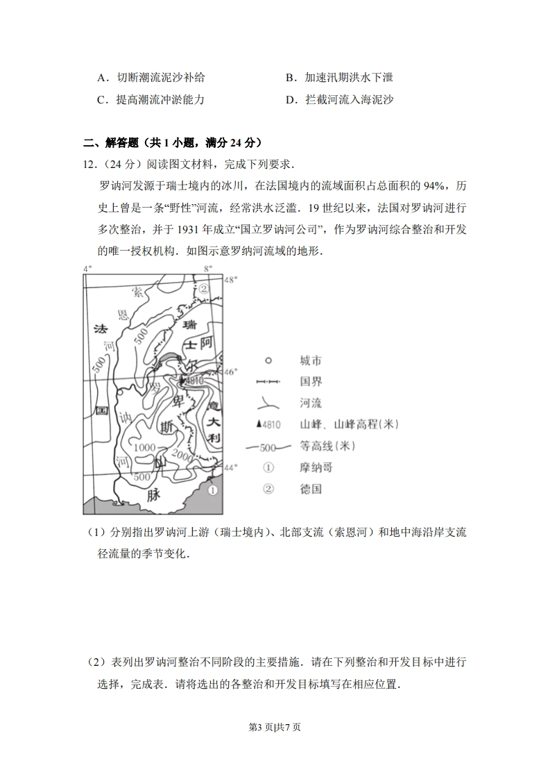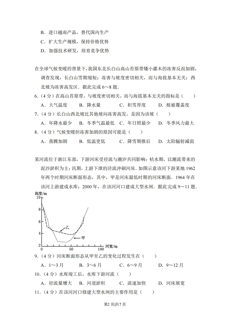 2016年全国统一高考地理试卷(新课标)一、选择题(共4小题,每小题0分,满分0分)庄园经济是一种实现农业资源聚集化、生产规模化、经营多元化、管理企业化、建设生态化的经营组织模式.某县生产的优质铁观音茶获得“中国地理标志”认证.该县茶企业通过整合特色山水,建设集茶种植、茶叶加工储存、旅游和文化为一体的现代茶庄园.据此完成1~2题.1.(4分)发展庄园经济的前提条件是当地拥有()A.丰富廉价的劳动力B.知名品牌的农产品C.发达便捷的交通网D.高精尖的技术水平2.(4分)与传统的茶园相比,现代茶庄园的突出优势是()A,品牌更多,环境更优B.市场更广,产品价格更低C.产品更多,效益更高D.投入更少,生产成本更低自20世纪70年代开始,日本家电企业将组装工厂向某国外转移,如图示意日资家电组装工厂转移目的地随时间的变化.据此完成3~5题,日本韩国马来西亚中国越南》时间3.(4分)影响日资家电组装工厂不断转移的主要因素是()A,市场规模B.劳动力成本C.原材料成本D.技术水平4.(4分)20世纪90年代末,越南对日资家电组装工厂的投资吸引力已超过中国,但其日资家电组装工厂数量却远少于中国,主要原因是中国()A.市场规模大B.技术水平高C.劳动力素质高D.基础设施水平高5.(4分)在日资家电组装工厂向越南等国家转移的背景下,中国家电产业发展的战略是()A,加大政策支持,吸引日资回归第1页供7页B.进口越南产品,替代国内生产C.扩大生产规模,保持价格优势D.加强技术研发,培育竞争优势在全球气候变暖的背景下,我国东北长白山高山苔原带矮小灌木的冻害反而加剧,调查发现,长白山雪期缩短:冻害与坡度密切相关,而与海拔基本无关:西北坡为冻害高发区.据此完成6一8题.6.(4分)在高山苔原带,与坡度密切相关,而与海拔基本无关的指标是()A.大气温度B.降水量C.积雪厚度D.植被覆盖度7.(4分)长白山西北坡比其他坡向冻害高发,是因为该坡()A.年降水最少B.冬季气温最低C.年日照最少D.冬季风力最大8.(4分)气候变暖但冻害加剧的原因可能是()A.蒸腾加剧B.低温更低C.降雪期推后D.太阳辐射减弱某河流位于浙江东部,下游河床受径流与潮汐共同影响:枯水期,以潮流带来的泥沙淤积为主:汛期,上游下泄的泾流冲刷河床.如图示意该河下游某地1962年两个时期河床断面形态,其中,甲是河床最低时期的河床断面.1964年在该河上游建成水库:2000年,在该河河口建成大型水闸.据此完成9~11题,高度/m10上86F一甲2050河宽/m1009.(4分)河床断面形态从甲至乙的变化过程发生在()A.1~3月B.3~6月C.6~9月D.912月10.(4分)水库竣工后,水库下游河流()A.径流量增大B.河道淤积C.流速加快D.河床展宽11.(4分)在该河河口修建大型水闸的主要作用是()第2页供7页