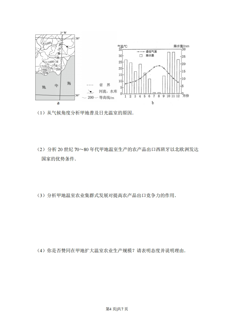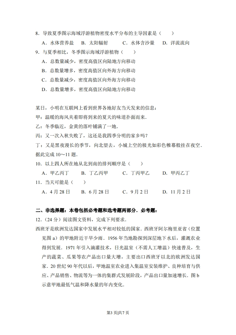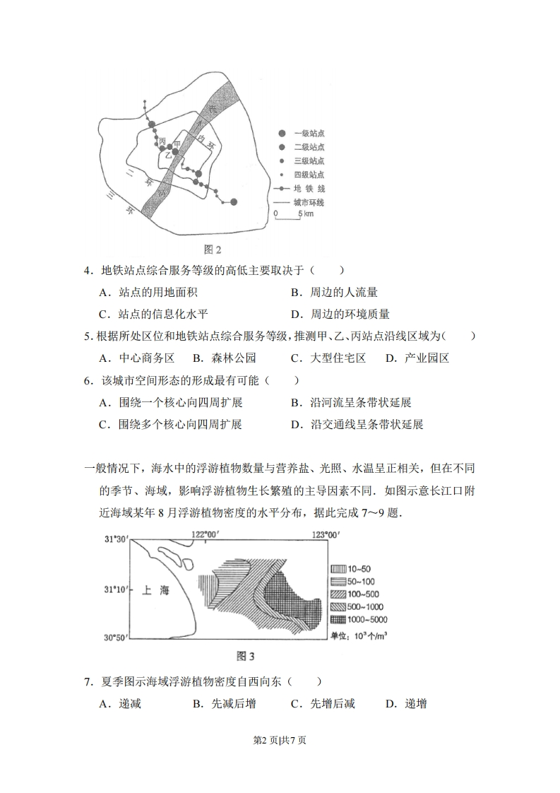 2017年全国统一高考地理试卷(新课标Ⅱ)一、选择题:本题11小题,每题4分,满44分.在每小题给出的四个选项中,只有一项是符合题目要求的,剪纸是中国传统民间艺术,2009年9月入选联合国教科文组织人类非物质文化遗产代表作名录.剪纸表现的内容丰富多彩,反映人们的生活环境、习俗和风情等,寄托人们对美好生活的向往,如图是一帧剪纸作品.据此完成1一3题1.如图剪纸所反映的景观主要分布于我国()A.四川盆地B.华北平原C.珠江三角洲D.长江三角洲2.形成这种景观特征的自然条件有()A.沟壑纵横,降水集中B.地势低平,降水丰沛C.地形封闭,排水不畅D.山河相间,降水均匀3.该景观主要分布区具代表性的地方剧种是()A.川剧B.豫剧C.粤剧D.越剧某条城市地铁线穿越大河,途经主要的客流集散地.如图示意该地铁线各站点综合服务等级.据此完成4~6题.第1页供7页●一级站点●二级站点●三级站点四级站点◆一地铁线城市环线5km图24.地铁站点综合服务等级的高低主要取决于()A.站点的用地面积B,周边的人流量C.站点的信息化水平D.周边的环境质量5.根据所处区位和地铁站点综合服务等级,推测甲、乙、丙站点沿线区域为()A.中心商务区B.森林公园C.大型住宅区D.产业园区6.该城市空间形态的形成最有可能(A,围绕一个核心向四周扩展B.沿河流呈条带状延展C.围绕多个核心向四周扩展D,沿交通线呈条带状延展一般情况下,海水中的浮游植物数量与营养盐、光照、水温呈正相关,但在不同的季节、海域,影响浮游植物生长繁殖的主导因素不同,如图示意长江口附近海域某年8月浮游植物密度的水平分布,据此完成7~一9题.31301220012300[m10-50目50-1003110上海7☑100-500☒500-1000围1000-50003050'单位:103个m3图37.夏季图示海域浮游植物密度自西向东()A.递减B.先减后增C.先增后减D.递增第2页供7页