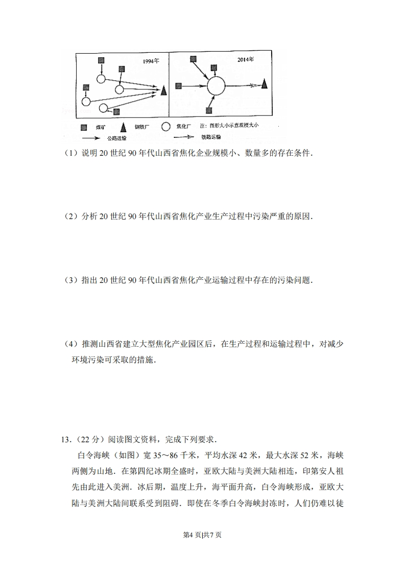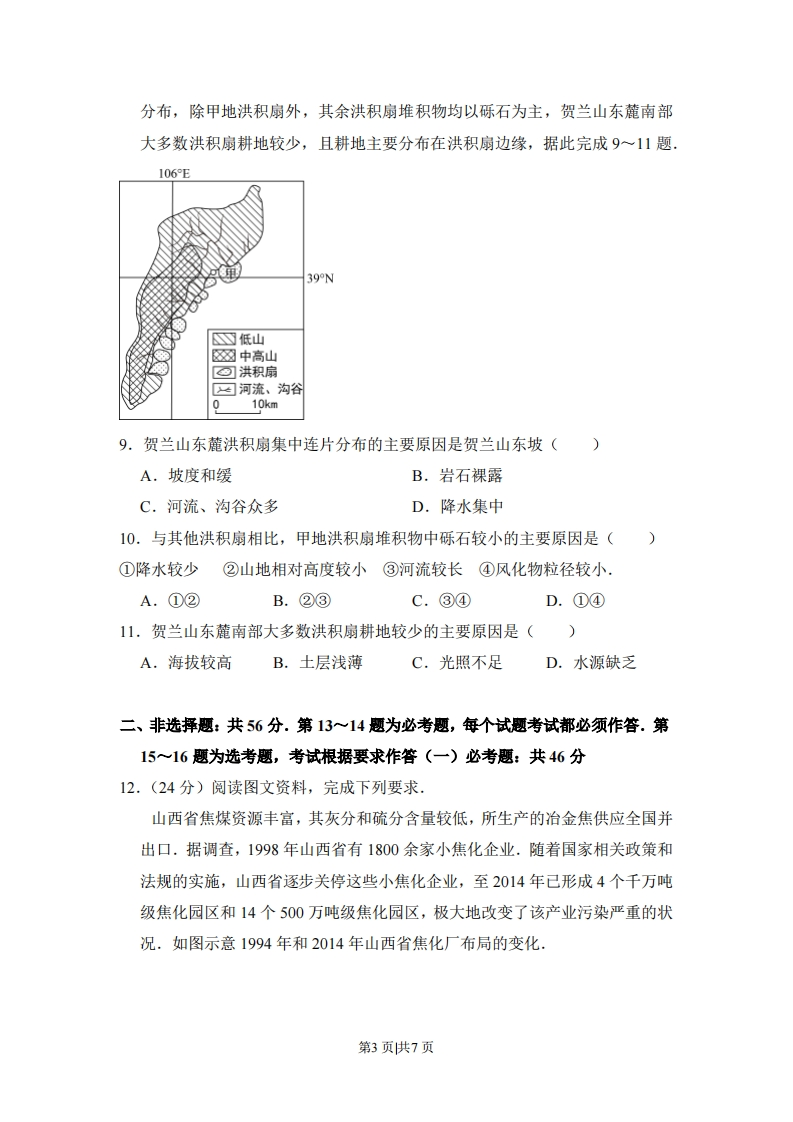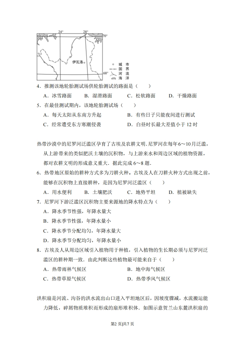 2017年全国统一高考地理试卷(新课标)一、选择题:本大题11小题,每题4分,共44分.在每小题给出的四个选项中,只有一项是符合题目要求的19世纪50年代,淮河自洪泽湖向南经长江入海:黄河结束夺淮历史,改从山东入海.1968年,南京长江大桥建成通车:自1999年,江苏境内又陆续建成了多座长江大桥.江苏习惯上以长江为界分为苏南和苏北两部分(如图).据此完成1-3题.1.目前,在洪泽湖以东地区,秦岭-淮河线()河流岁泊A.无划分指标依据B.与自然河道一致C.无对应的自然标志D.两侧地理差异显著2.习惯上苏南、苏北的划分突出体现了长江对两岸地区()A.自然地理分异的影响B.人文地理分异的影响C.互相联系的促进作用D.相互联系阻隔作用3.进入21世纪,促使苏南、苏北经济合作更加广泛的主导因素是()A.市场B.技术C.资金D.交通汽车轮胎性能测试需在不同路面上进行.芬兰伊瓦洛(位置见图)吸引了多家轮胎企业在此建设轮胎测试场,最佳测试期为每年11月至次年4月.据此完成4~5题.第1页供7页伊瓦洛。国界◆04.推测该地轮胎测试场供轮胎测试的路面是(A.冰雪路面B.湿滑路面C.松软路面D.干燥路面5.在最佳测试期内,该地轮胎测试场()A.每天太阳从东南方升起B.有些日子只能夜间进行测试C.经常遭受东方寒潮侵袭D.白昼时长最大差值小于12时热带沙漠中的尼罗河泛滥区孕育了古埃及农耕文明.尼罗河在每年6一10月泛滥,从上游带来的类似肥沃土壤的沉积物,与上游来水和周边区域的植物资源,都对农耕文明的形成意义重大.据此完成6一8题,6.热带地区原始的耕种方式多为刀耕火种。古埃及人在刀耕火种方式出现之前,能够在沉积物上直接耕种,是因为尼罗河泛滥区()A.用水便利B.土壤肥沃C.地势平坦D.植被缺失7.尼罗河下游泛滥区沉积物主要来源地的降水特点为()A,降水季节性强,年降水量大B.降水季节性强,年降水量小C.降水季节分配均匀,年降水量大D.降水季节分配均匀,年降水量小8.古埃及人从周边区域引入植物用于种植,引入植物的生长期必须与尼罗河泛滥区的耕种期一致.由此判断这些植物最可能来自于()A,热带雨林气候☒B.地中海气候区C.热带草原气候区D.热带季风气候区洪积扇是河流、沟谷的洪水流出山口进入平坦地区后,因坡度骤减,水流搬运能力降低,碎屑物质堆积而形成的扇形堆积体.如图示意贺兰山东麓洪积扇的第2页供7页
