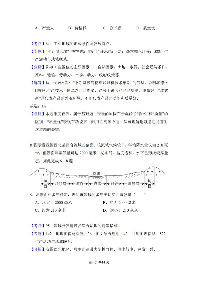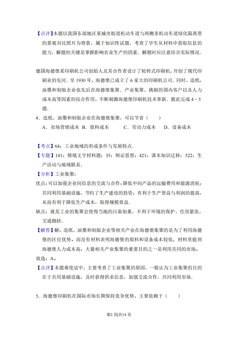 2017年全国统一高考地理试卷(新课标I)事考答案与试题佩析一、选择题:本大题11小题,每个小题4分,满分44分,在每小题给出第四个选项中,只有一项是符合题目要求的,如图为我国东部地区某城市街道机动车道与两侧非机动车道绿化隔离带的景观对比照片,拍摄于2017年3月25日.数年前,两侧的绿化隔离带按同一标准栽种了常绿灌木:而如今,一侧灌木修剪齐整(左图),另一侧则杂树丛生,灌木零乱(右图),拍摄当日,这些杂树隐有绿色,新叶呼之欲出,据此完成1-3题1.当地的自然植被属于()A.常绿阔叶林B.落叶阔叶林C.常绿硬叶林D.针叶林【考点】37:地理环境的地域分布规律【专题】141:情境文字材料题:36:图文结合思想:43:利用图表信息:51D:地理环境的整体性和差异性,【分析】地理环境的地域分异规律主要有纬度地带性分异规律,经度地带性分异规律,山地的垂直地带性分异规律【解答】解:由题中3月25日,杂树中隐有绿色,新叶呼之欲出,可知此处植被在冬季时,树叶落完,春季的时候长出新叶,所以此处的自然植被为温带落叶阔叶林。故选:B。【点评】本题主要考查学生阅读材料和分析材料的能力,关键是找到材料中的信息“这些杂树隐有绿色,新叶呼之欲出”.第1页共14页2.造成图示绿化隔离带景观差异的原因可能是该街道两侧()A.用地类型差异B.居民爱好差异C.景观规划不同D.行政管辖不同【考点】54:城市的空间结构及其形成原因.【专题】142:地理图像材料题:36:图文结合思想:421:课本知识迁移:521:人口与城市,【分析】首先应看清图例,其次应关注功能区周围的地理事物,最后运用城市各功能区的布局原则及工矿企业的区位要求,进行合理布局.【解答】解:道路两侧均为绿化隔离带,用地类型均为绿化用地:隔离带均种常绿灌木,景观规划相同:绿化带管理不受居民喜好影响:由于行政管辖不一样,道路一侧有按时修剪,另一侧则无修剪,所以景观不一样。故选:D。【点评】本题难度适中,主要考查了绿化隔离带景观差异的原因,解题的关键是从图中获取信息并调用相关知识进行解答,3,图示常绿灌木成为我国很多城市的景观植物,制约其栽种范围的主要自然因素是()A.气温B.降水C.光照D.土壤【考点】61:影响农业区位因素.【专题】12E:地理关联图:21:热点问题:33:分析与综合思想:43:利用图表信息:522:生产活动与地域联系.【分析】影响农业区位的主要因素:自然条件:气候、水源、土壤、地形:社会经济条件:市场、交通运输、政府政策、劳动力、土地价格、资金、管理:技术条件:冷藏、良种、化肥、机械,【解答】解:由题,根据课本相关知识,制约常绿灌木栽种范围的主要自然因素是热量,由于常绿灌木叶片较小,对寒冷气候适应能力强,冬季不落叶,所以成为我国很多城市的景观植物。故选:A。第2页共14页
