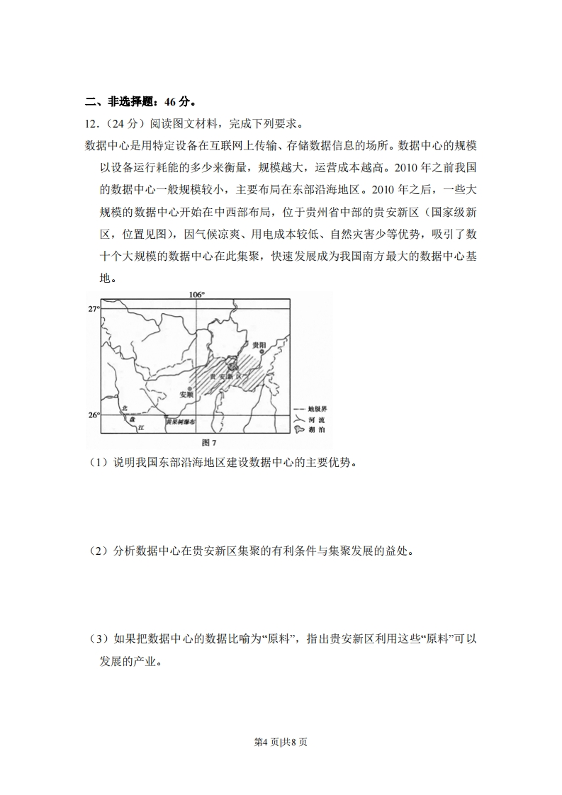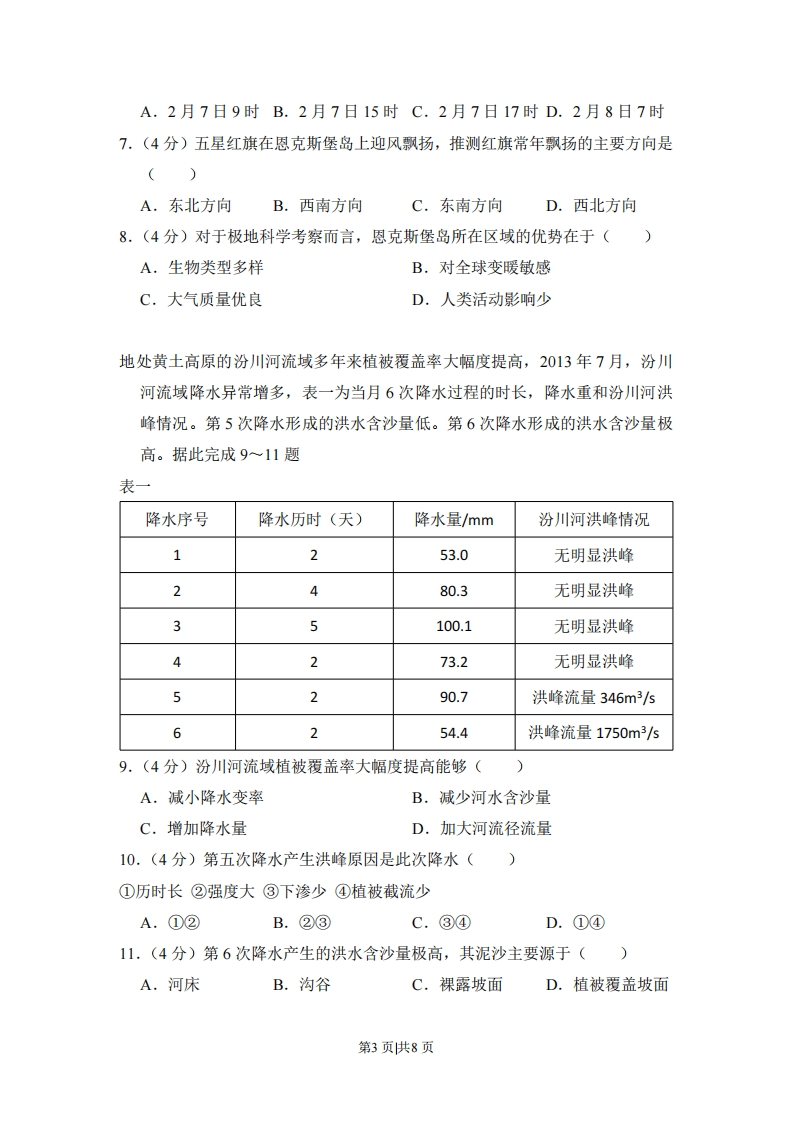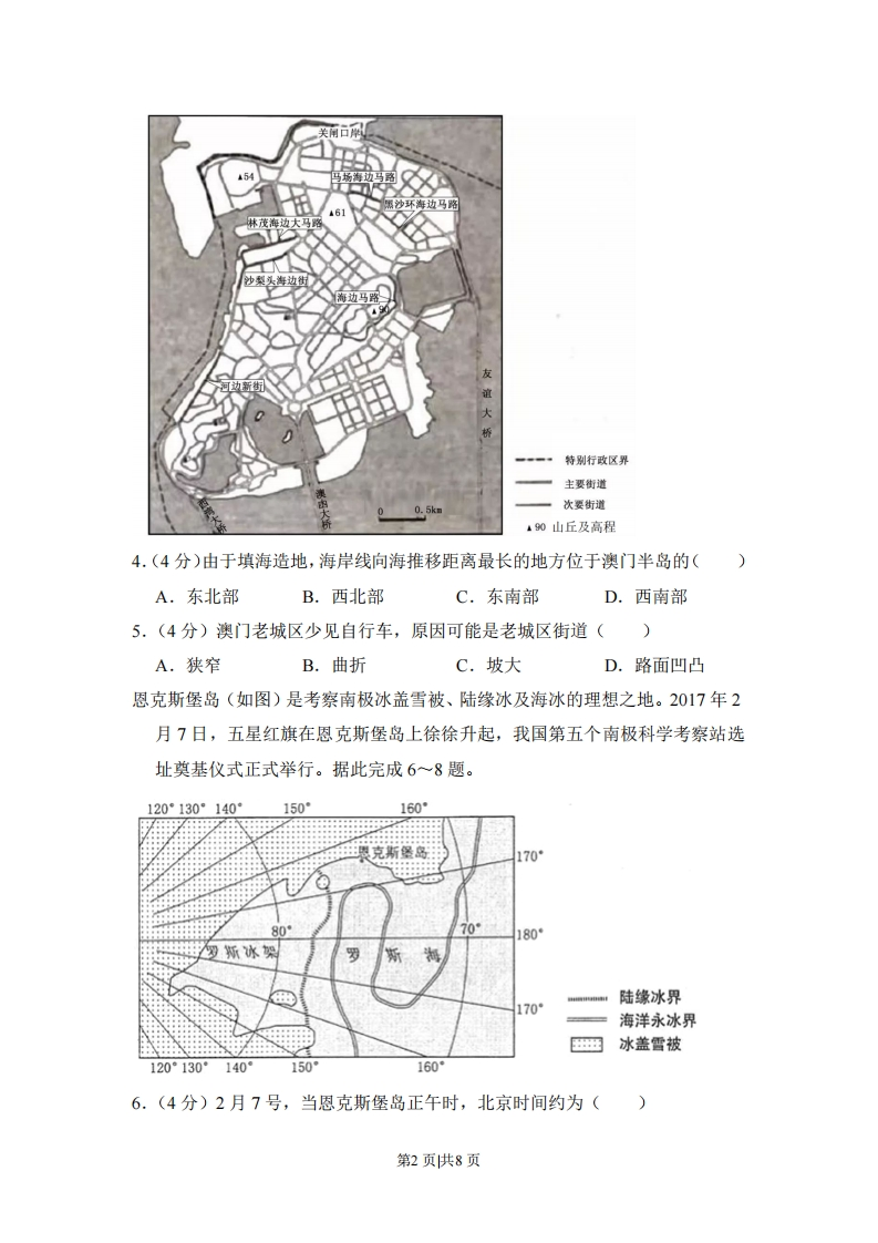 2018年全国统一高考地理试卷(新课标)一、选择题:本题11小题,每题4分,满44分。在每小题给出的四个选项中,只有一项是符合题目要求的。1994年,我国M公司(服装企业)在浙江温州成立,发展过程如图所示。据此完成1~3题。关闭自有生产厂总部由温州迁入上海在浙江温州建厂1994199519961997199819992005200620072008年多家生产人加翠并设第一家害卖店研发中心由温州销售网络覆盖全国迁入上海1.(4分)1996年,M公司关闭自有生产厂,主要是为了()A,提高附加值B.降低人工成本C.缩小规模D.加强合作2.(4分)M公司依次将研发中心和总部迁入上海,主要是因为上海()A,基础设施好B.交通便利C.销售市场大D.信息通达3.(4分)从发展过程看,M公司一直致力于()A.打造自主品牌B.扩大生产规模C.产品款式多样D.增强国际影响澳门丰岛以低矮的丘陵为主,现在的部分土地是历年填海而成的,如图示意澳门丰岛山丘分布、街道格局及部分街道名称,据此完成4~5题。第1页供8页154少环海边马特别行政区界主要街道次要街道.0山丘及高程4.(4分)由于填海造地,海岸线向海推移距离最长的地方位于澳门半岛的(A,东北部B.西北部C.东南部D.西南部5.(4分)澳门老城区少见自行车,原因可能是老城区街道()A.狭窄B.曲折C.坡大D.路面凹凸恩克斯堡岛(如图)是考察南极冰盖雪被、陆缘冰及海冰的理想之地。2017年2月7日,五星红旗在恩克斯堡岛上徐徐升起,我国第五个南极科学考察站选址奠基仪式正式举行。据此完成6~8题。120°130°140°150160出限克斯堡岛1708070°180°罗浙冰架斯海陆缘冰界170海洋永冰界旺冰盖雪被120°130°1401501606.(4分)2月7号,当恩克斯堡岛正午时,北京时间约为()第2页供8页