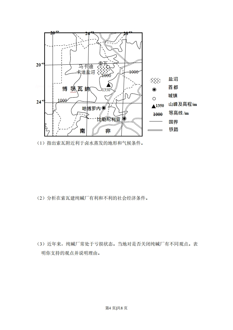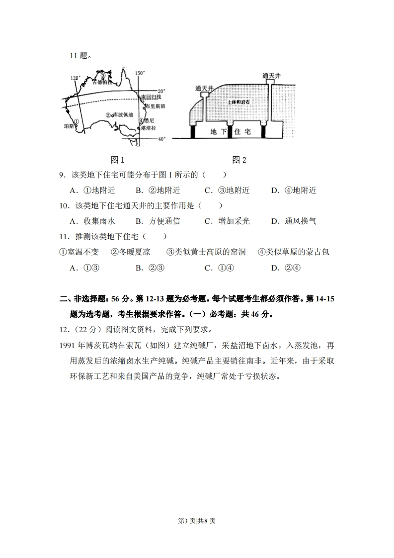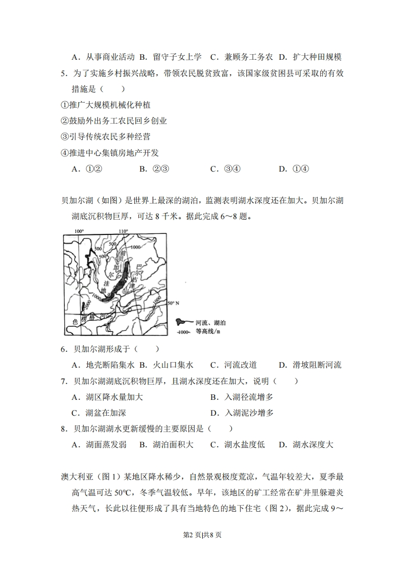 2018年全国统一高考地理试卷(新课标Ⅱ)一、选择题:本题共4小题,每小题8分,共44分。在每小题给出的四个选项中,只有一项是符合题目要求的。油纸伞是我国非物质文化遗产,采用传统方法、全手工制作,油纸伞以竹为骨,以纸或丝绸为面,刷桐油以增强韧性并防水,但长期置于干燥环境中易变脆、开裂。近年来,油纸伞走俏国际市场。据此完成1~2题。1.与现代钢骨布面伞相比,油纸伞走俏国际市场依赖的主要优势是()A.携带方便B.适用地广C.文化蕴涵D.经久耐用2.下列地区中,宜作为油纸伞重点推销市场的是()A.欧洲西部B.中亚C.中东D.撒哈拉以南非洲大别山区某国家级贫困县农民可分为跨村种田大户农民、种植自家承包地农民、本地务工务农兼业农民和常年外出务工农民等类型。该县以当地优势资源为基础的加工企业在县城活力较弱,但在中心集镇活力较强,图示意该县居民点的等级结构。据此完成3~5题。⊙县城中心集镇。村主要公路次要公路3.与县城相比,中心集镇以当地优势资源为基础的加工企业活力较强的主要原因是()A,基础设施较完善B.更接近消费市场C.资金供应较充裕D.更易招募劳动力4.面向某类型农民的需求,有专家建议在该县推进“村--中心集镇双栖”居住模式。这种模式旨在方便该类型农民()第1页供8页A.从事商业活动B.留守子女上学C.兼顾务工务农D.扩大种田规模5,为了实施乡村振兴战略,带领农民脱贫致富,该国家级贫困县可采取的有效措施是()①推广大规模机械化种植②鼓励外出务工农民回乡创业③引导传统农民多种经营④推进中心集镇房地产开发A.①②B.②③C.③④D.①④贝加尔湖(如图)是世界上最深的湖泊,监测表明湖水深度还在加大。贝加尔湖湖底沉积物巨厚,可达8千米。据此完成6~8题。100河流、湖泊1000等高线/m6.贝加尔湖形成于()A.地壳断陷集水B.火山口集水C.河流改道D.滑坡阻断河流7.贝加尔湖湖底沉积物巨厚,且湖水深度还在加大,说明()A.湖区降水量加大B.入湖径流增多C.湖盆在加深D.入湖泥沙增多8.贝加尔湖湖水更新缓慢的主要原因是()A.湖面蒸发弱B.湖泊面积大C.湖水盐度低D.湖水深度大澳大利亚(图1)某地区降水稀少,自然景观极度荒凉,气温年较差大,夏季最高气温可达50℃,冬季气温较低。早年,该地区的矿工经常在矿井里躲避炎热天气,长此以往便形成了具有当地特色的地下住宅(图2),据此完成9~第2页供8页