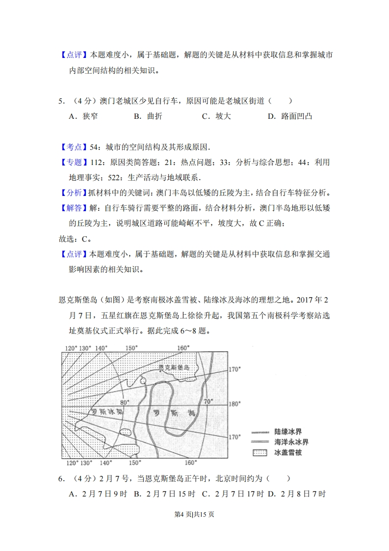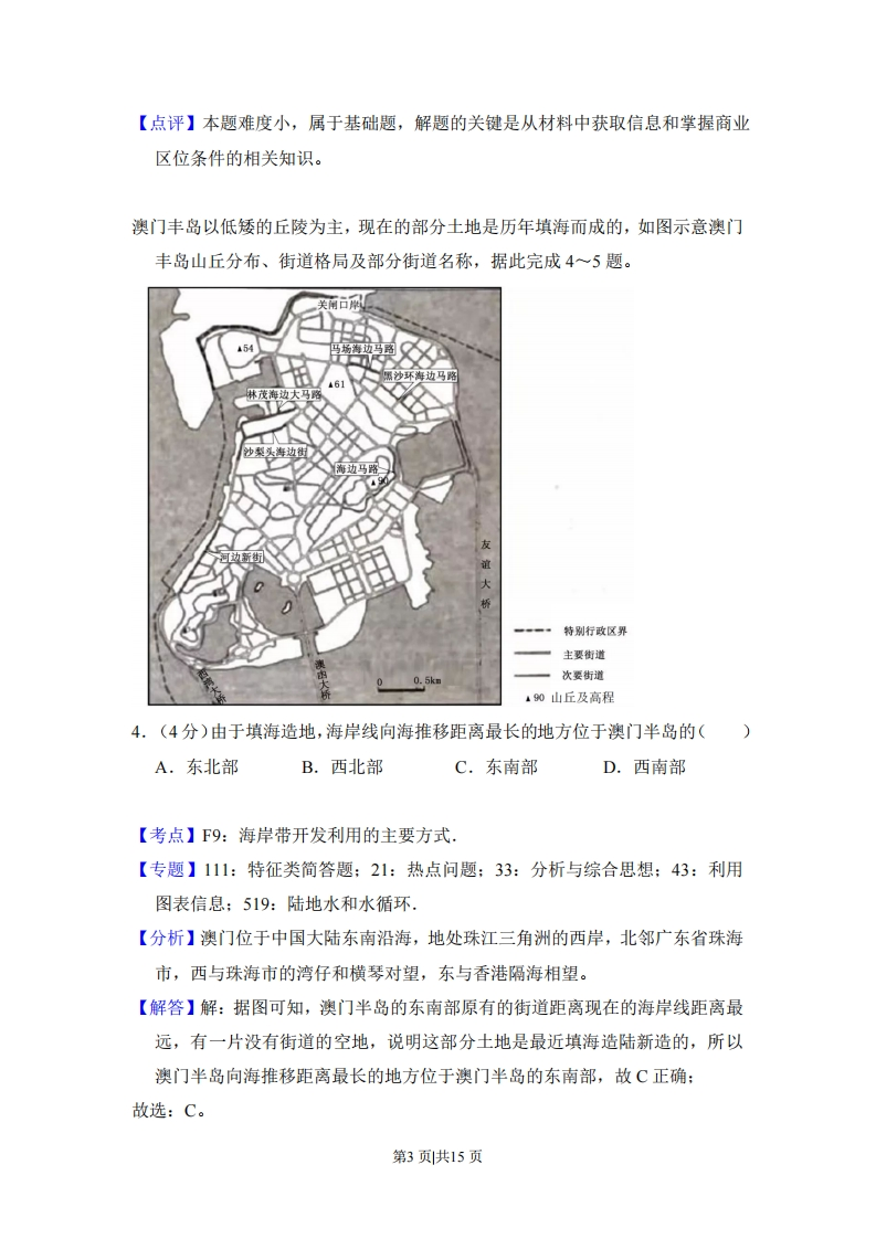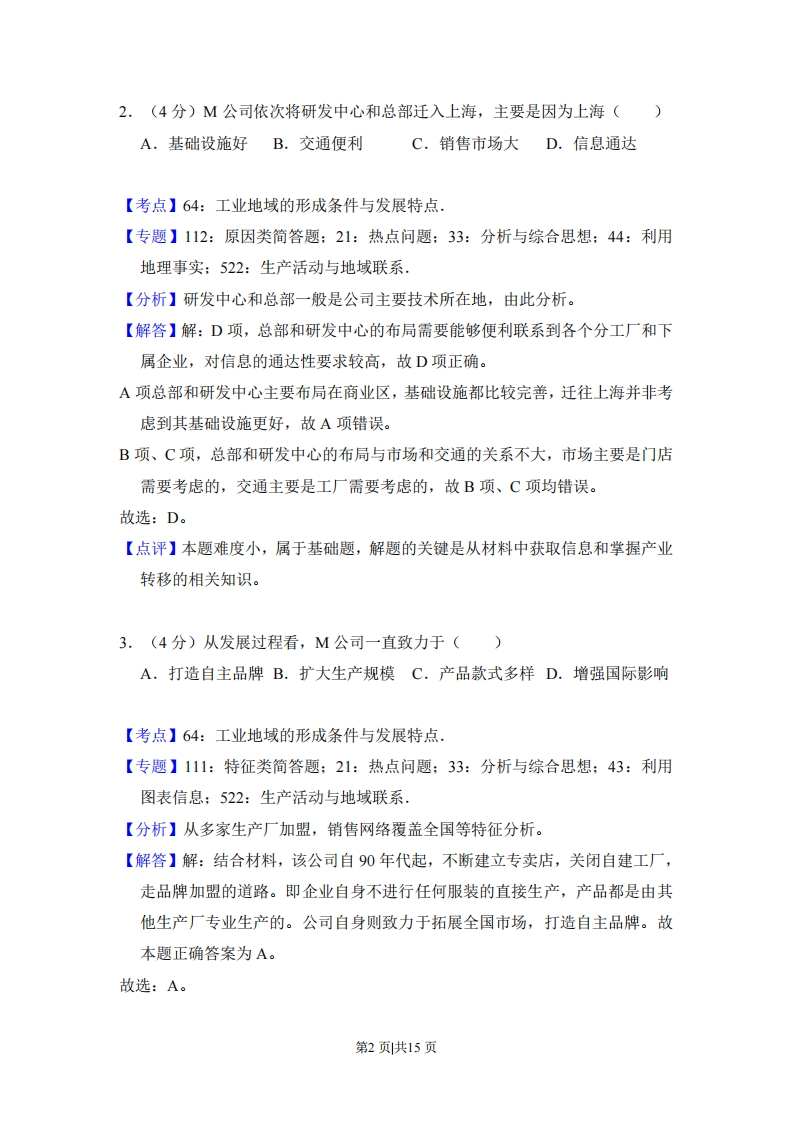 2018年全国统一高考地理试卷(新课标Ⅱ)事考答来与试想解析一、选择题:本题11小题,每题4分,满44分。在每小题给出的四个选项中,只有一项是符合题目要求的.1994年,我国M公司(服装企业)在浙江温州成立,发展过程如图所示。据此完成1~3题。关闭自有生产厂总部由温州迁入上海在浙江温州建厂●●●1994199519961997199819992005200620072008年弄餐券产墨店研发中心由温州销售网络覆盖全国迁入上海1.(4分)1996年,M公司关闭自有生产厂,主要是为了(A,提高附加值B.降低人工成本C.缩小规模D.加强合作【考点】64:工业地域的形成条件与发展特点.【专题】112:原因类简答题:21:热点问题:33:分析与综合思想:44:利用地理事实:522:生产活动与地域联系,【分析】工业一般希望用最低的生产成本,获得最高的利润,由此分析。【解答】解:读图可知,M公司在1994年建服装厂,在1995年有多家生产工厂加盟,并开设第一家专卖店后,M公司在1996年关闭了自建工厂。M公司退出生产环节后,致力于不断扩大销售网络与研发,提高产品附加值。故本题正确答案为A。故选:A。【点评】本题难度小,属于基础题,解题的关键是从材料中获取信息和掌握工业区位因素的相关知识。第1页共15页2.(4分)M公司依次将研发中心和总部迁入上海,主要是因为上海()A.基础设施好B.交通便利C.销售市场大D.信息通达【考点】64:工业地域的形成条件与发展特点.【专题】112:原因类简答题:21:热点问题:33:分析与综合思想:44:利用地理事实:522:生产活动与地域联系【分析】研发中心和总部一般是公司主要技术所在地,由此分析。【解答】解:D项,总部和研发中心的布局需要能够便利联系到各个分工厂和下属企业,对信息的通达性要求较高,故D项正确。A项总部和研发中心主要布局在商业区,基础设施都比较完善,迁往上海并非考虑到其基础设施更好,故A项错误。B项、C项,总部和研发中心的布局与市场和交通的关系不大,市场主要是门店需要考虑的,交通主要是工厂需要考虑的,故B项、C项均错误。故选:D。【点评】本题难度小,属于基础题,解题的关键是从材料中获取信息和掌握产业转移的相关知识。3.(4分)从发展过程看,M公司一直致力于()A.打造自主品牌B.扩大生产规模C.产品款式多样D.增强国际影响【考点】64:工业地域的形成条件与发展特点.【专题】111:特征类简答题:21:热点问题:33:分析与综合思想:43:利用图表信息:522:生产活动与地域联系,【分析】从多家生产厂加盟,销售网络覆盖全国等特征分析。【解答】解:结合材料,该公司自90年代起,不断建立专卖店,关闭自建工厂,走品牌加盟的道路。即企业自身不进行任何服装的直接生产,产品都是由其他生产厂专业生产的。公司自身则致力于拓展全国市场,打造自主品牌。故本题正确答案为A。故选:A。第2页共15页