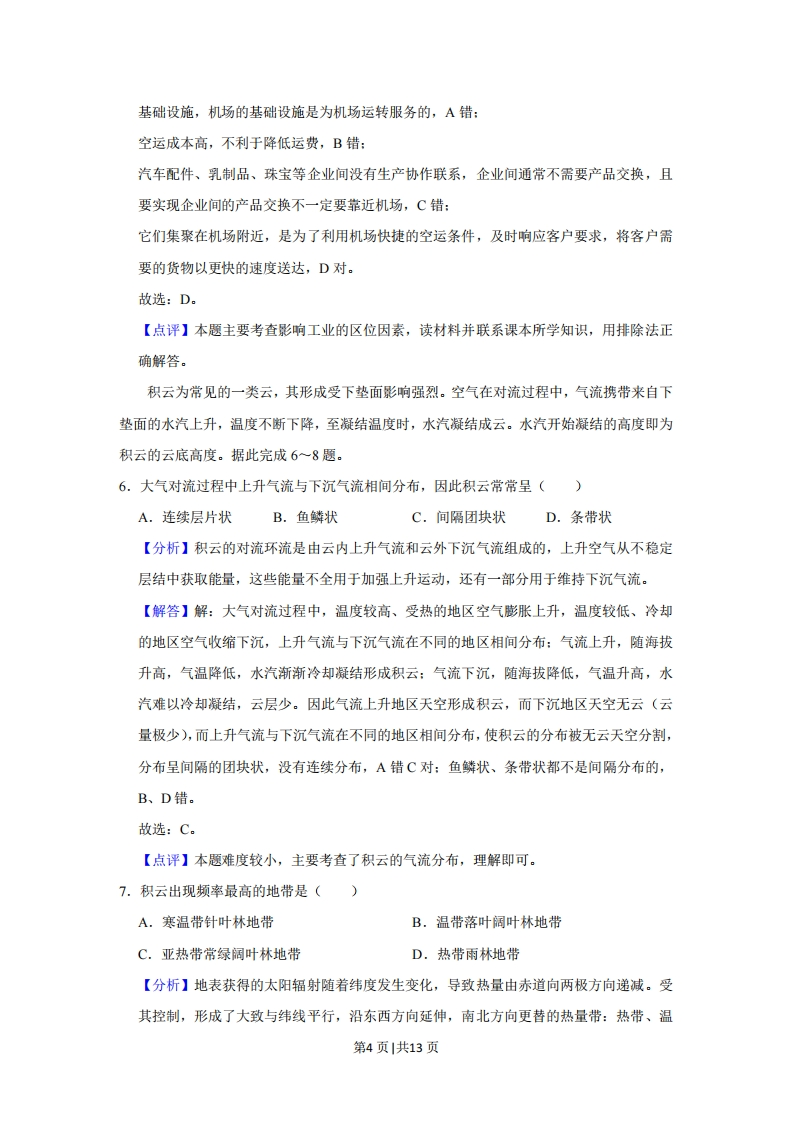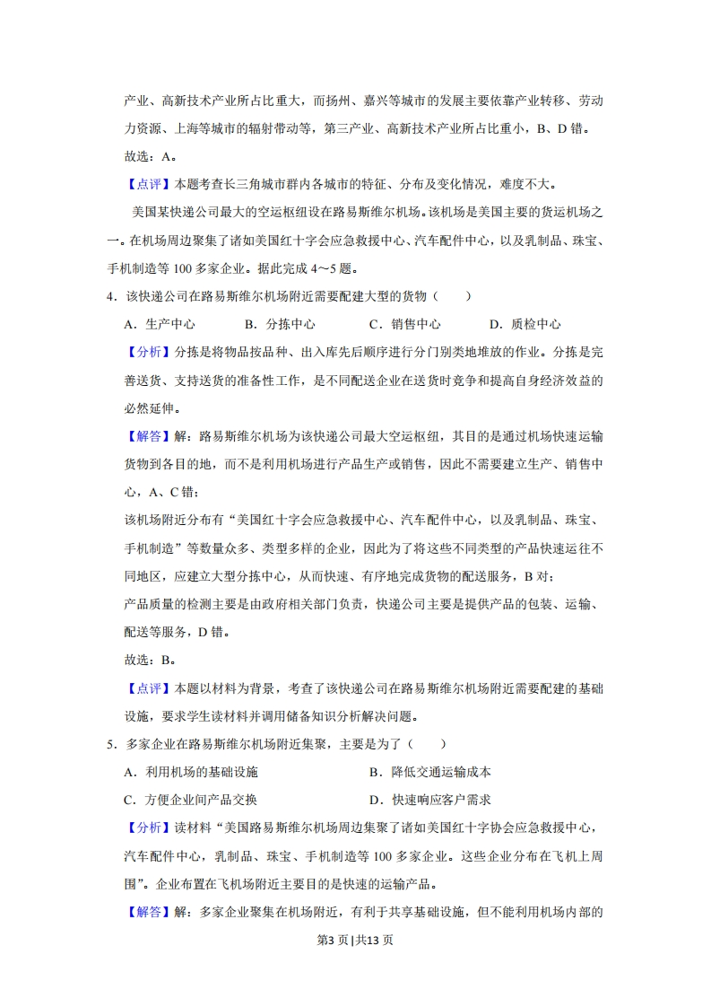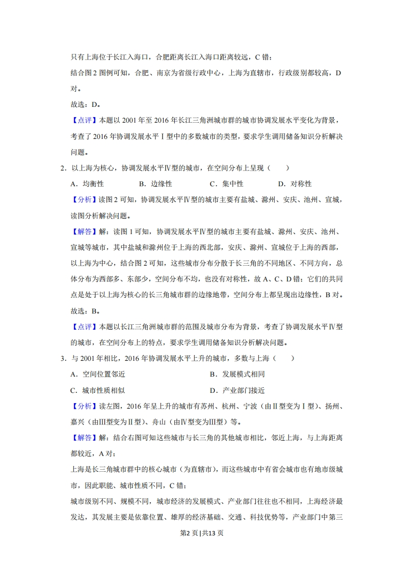 2019年全国统一高考地理试卷(新课标Ⅱ)◆考答案与试题解析一、选释题:本题共4小题,每小题12分,共44分.在每小题给出的四个选项中,只有一项是符合题目要求的,在城镇化进程中,城市人口、土地利用和产业需要协调发展。根据协调发展水平,将长江三角洲城市群的城市由高到低分为I、Ⅱ、Ⅲ、V四个等级类型。图1为2001年至2016年长江三角洲城市群的城市协调发展水平变化,图2示意长江三角洲城市群的范围及城市分布。据此完成1~3题。I型Ⅱ型上海、南京无锡、镇江合肥芜湖、绍兴苏州、杭州、宁波常州马鞍山、铜陵安扬州、嘉兴舟山杭州绍头秦州、南通、盐城、滁州、湖州、金华、台州安庆、池州、宣城。省级行政中心,。地级市行政中心Ⅲ型IV型一城市群范围·城市的协调发展水平变化方向图1图21.2016年协调发展水平I型中的多数城市()A.海港规模大B.沿长江分布C.集聚长江口D.行政等级较高【分析】读材料可知,在城镇化进程中,城市人口、土地利用和产业需要协调发展。根据协调发展水平,将长江三角洲城市群的城市由高到低分为I、Ⅱ、Ⅲ、V四个等级类型。【解答】解:读图1可知,2016年协调发展水平I型城市为上海、南京、合肥(注意常州2001年属于I型,但2016年己经下降为Ⅱ型):读图2,三个城市只有上海临海且海港规模大,南京、合肥没有临海也没有海港,A错:上海、南京沿长江分布,但合肥没有沿江,B错:第1页|共13页只有上海位于长江入海口,合肥距离长江入海口距离较远,C错:结合图2图例可知,合肥、南京为省级行政中心,上海为直辖市,行政级别都较高,D对。故选:D。【点评】本题以2001年至2016年长江三角洲城市群的城市协调发展水平变化为背景,考查了2016年协调发展水平I型中的多数城市的类型,要求学生调用储备知识分析解决问题。2.以上海为核心,协调发展水平V型的城市,在空间分布上呈现()A.均衡性B.边缘性C.集中性D.对称性【分析】读图2可知,协调发展水平W型的城市主要有盐城、滁州、安庆、池州、宣城,读图分析解决问题。【解答】解:读图1可知,协调发展水平V型的城市主要有盐城、滁州、安庆、池州、宣城等城市,其中盐城和滁州位于上海的西北部,安庆、滁州、宣城位于上海的西部,以上海为中心,结合图2可知,这些城市分布分散于长三角的不同地区、不同方向,总体分布为西部多、东部少,空间分布不均,也没有对称性,故A、C、D错:它们的共同点是处于以上海为核心的长三角城市群的边缘地带,空间分布上都呈现出边缘性,B对。故选:B。【点评】本题以长江三角洲城市群的范围及城市分布为背景,考查了协调发展水平V型的城市,在空间分布上的特点,要求学生调用储备知识分析解决问题。3.与2001年相比,2016年协调发展水平上升的城市,多数与上海()A,空间位置邻近B.发展模式相同C.城市性质相似D.产业部门接近【分析】读左图,2016年呈上升的城市有苏州、杭州、宁波(由Ⅱ型变为I型)、扬州、嘉兴(由Ⅲ型变为Ⅱ型)、舟山(由V型变为ⅢI型)等。【解答】解:结合右图可知这些城市与长三角的其他城市相比,邻近上海,与上海距离都较近,A对:上海是长三角城市群中的核心城市(为直辖市),而这些城市中有省会城市也有地市级城市,因此职能、城市性质不同,C错:城市级别不同、规模不同,城市经济的发展模式、产业部门往往也不相同,上海经济最发达,其发展主要是依靠位置、雄厚的经济基础、交通、科技优势等,产业部门中第三第2页1共13页