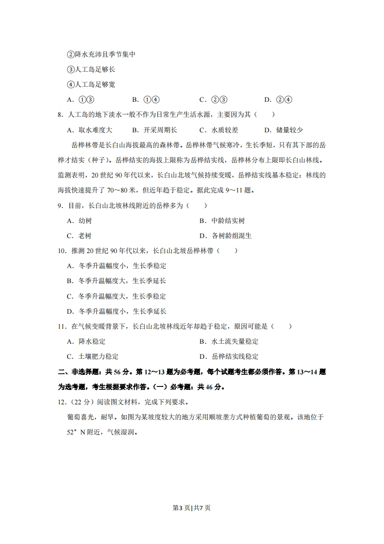 2020年全国统一高考地理试卷(新课标I)一、选挥题:本题共4小题,共44分。在每小题给出的四个选项中,只有一项是符合题目要求的。治沟造地是陕西省延安市对黄土高原的丘陵沟壑区,在传统打坝淤地的基础上,集耕地营造、坝系修复、生态建设和新农村发展为一体的“田水路林村”综合整治模式,实现了乡村生产、生活、生态协调发展(如图)。据此完成1一3题。支渠排水灌溉调整农业结构生产的道覆土造地集约高效土地整治复垦空废宅基地破面退耕还林生活生态宜居适度山清水秀易地移民搬迁防洪坝系建设健全公共服务1.与传统的打坝淤地工程相比,治沟造地更加关注()A.增加耕地面积B.防治水土流失C.改善人居环境D.提高作物产量2.治沟造地对当地生产条件的改善主要体现在()A.优化农业结构B.方便田间耕作C.健全公共服务D.提高耕地肥力3.推测开展治沟造地的地方()①居住用地紧张②生态环境脆弱③坡耕地比例大④农业生产精耕细作A.①③B.①④C.②③D.②④为获得冬季防风、夏季通风的效果,我国东北平原的某城市对一居住区进行了相应的建筑布局规划,规划建筑物为高层(7层以上)和多层(7层或以下)。如图示意在该居住区内规划的两个居住片区、道路、出入口及当地盛行风向。据此完成4~6题。第1页共7页N出人口I区道路I区出入口4.下列建筑布局中,适合居住片区Ⅱ的是(昌居号官目①并列排布②横向错列排布国自由排布④纵向错列排布A.①B.②C.③D.④5.相对居住片区Ⅱ,居住片区I的建筑布局宜()(①建筑密度大②建筑密度小③以高层建筑为主④以多层建筑为主A.①③B.①④C.②③D.②④6.该居住区出入口的设计主要是为了避开()A.春季盛行风B.夏季盛行风C.秋季盛行风D.冬季盛行风利用大型挖泥船将海底岩石搅碎,并将碎石和泥沙一起吹填造地,成为在海中建设人工岛的主要方式。如图示意人工岛地下淡水分布。据此完成7~8题。地下咸水区海洋地下淡水区淡/咸水界限7.参照如图,在造岛物质满足水渗透的前提下,人工岛形成并保持相对稳定的地下淡水区的条件是(①降水充沛且季节分配均匀第2页共7页