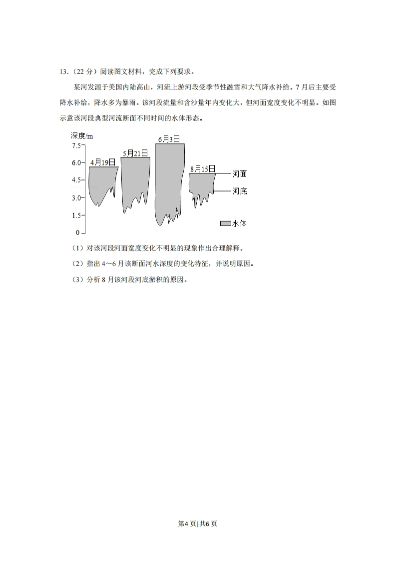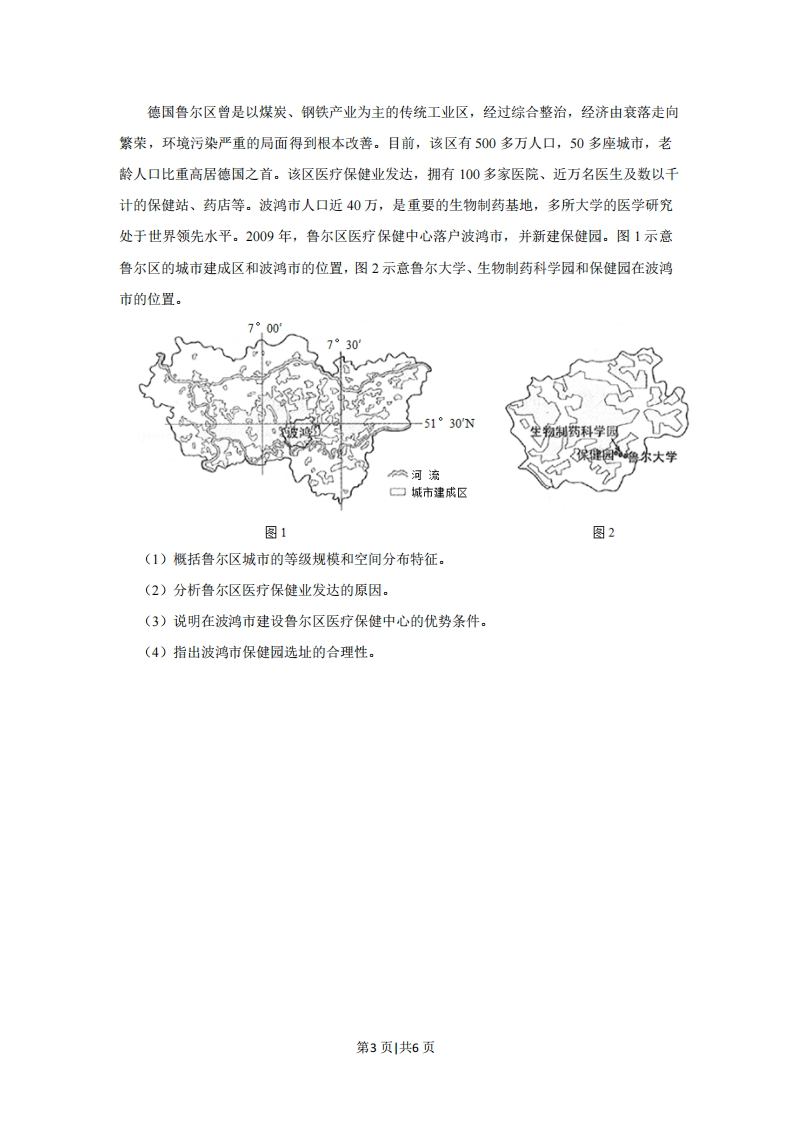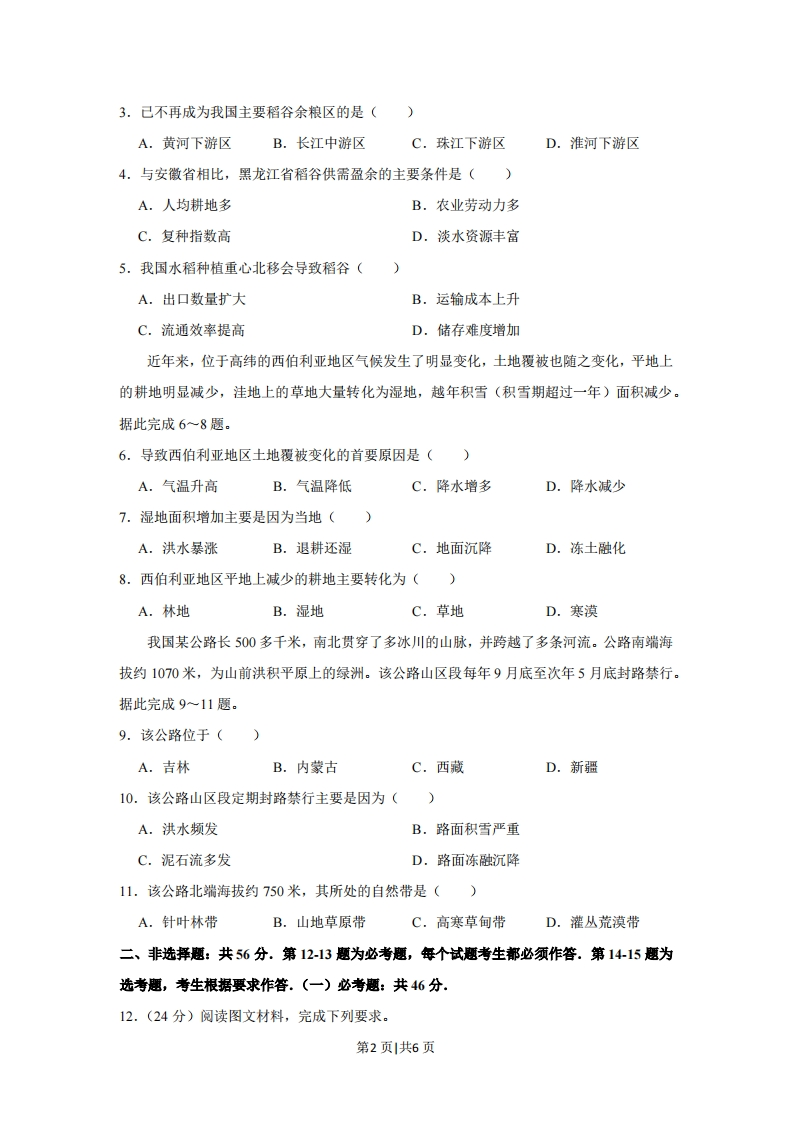 2019年全国统一高考地理试卷(新课标Ⅲ)一、选挥题:本题共4小题,每小题8分,共44分,在每小题给出的四个选项中,只有一项是符合题目要求的我国人口众多,生活垃圾产生量巨大,迫切需要对垃圾进行无害化、资源化处理。近些年,某企业开发了厨余垃圾自动处理系统,并在全国很多城市推广。如图示意该厨余垃圾自动处理系统的主要工艺流程。据此完成1~2题。180kg沼气发电150kW·h工业油脂废渣生产沼气80m有机渣杂物分拣提取生物油脂20kg厨余垃圾1t1.厨余垃圾是图示自动处理系统中的()A.废料B.原料C.能源D.产品2.符合图示自动处理系统局部工艺流程的是()A.废渣→生产沼气→沼气发电B.工业油脂→提取生物油脂→有机渣C.有机渣→生产沼气→废渣D.生产沼气→有机渣→提取生物油脂稻谷是重要的粮食种类,粮食的充分供给和区域平衡是保障粮食安全的重要任务。如图反映2014年我国不同省份的稻谷供需关系。据此完成3~5题。稻谷供需结余/万t艦弱00~150150-300☐300-1849注:港澳台数据暂缺第1页共6页3.已不再成为我国主要稻谷余粮区的是()A.黄河下游区B.长江中游区C.珠江下游区D.淮河下游区4.与安徽省相比,黑龙江省稻谷供需盈余的主要条件是()A.人均耕地多B.农业劳动力多C.复种指数高D.淡水资源丰富5.我国水稻种植重心北移会导致稻谷()A.出口数量扩大B.运输成本上升C.流通效率提高D.储存难度增加近年来,位于高纬的西伯利亚地区气候发生了明显变化,土地覆被也随之变化,平地上的耕地明显减少,洼地上的草地大量转化为湿地,越年积雪(积雪期超过一年)面积减少。据此完成6~8题。6.导致西伯利亚地区土地覆被变化的首要原因是()A.气温升高B.气温降低C.降水增多D.降水减少7.湿地面积增加主要是因为当地(A.洪水暴涨B.退耕还湿C.地面沉降D.冻土融化8.西伯利亚地区平地上减少的耕地主要转化为()A.林地B.湿地C.草地D.寒漠我国某公路长500多千米,南北贯穿了多冰川的山脉,并跨越了多条河流。公路南端海拔约1070米,为山前洪积平原上的绿洲。该公路山区段每年9月底至次年5月底封路禁行。据此完成9~11题。9.该公路位于()A.吉林B.内蒙古C.西藏D.新疆10.该公路山区段定期封路禁行主要是因为()A.洪水频发B.路面积雪严重C.泥石流多发D.路面冻融沉降11.该公路北端海拔约750米,其所处的自然带是()A.针叶林带B.山地草原带C.高寒草甸带D.灌丛荒漠带二、非选择题:共56分.第12-13题为必考题,每个试题考生都必须作答.第1415题为选考题,考生根据要求作答。(一)必考题:共46分。12.(24分)阅读图文材料,完成下列要求。第2页共6页