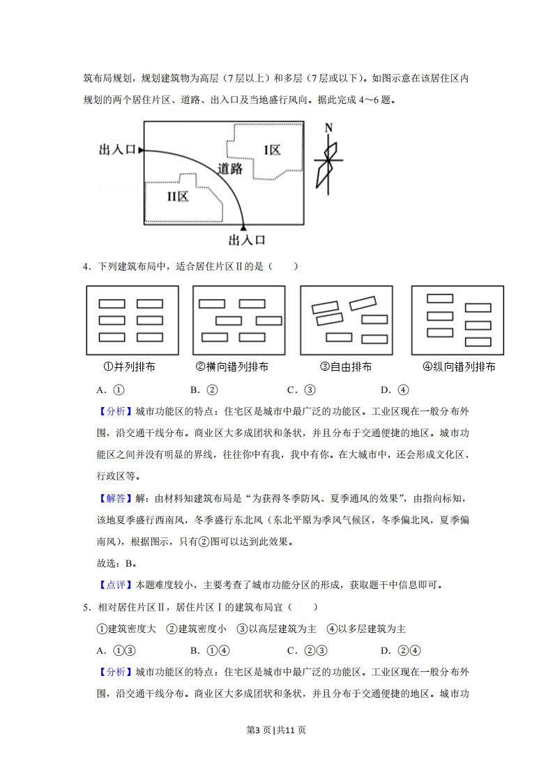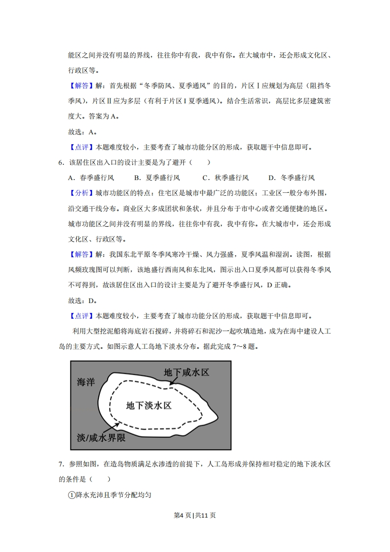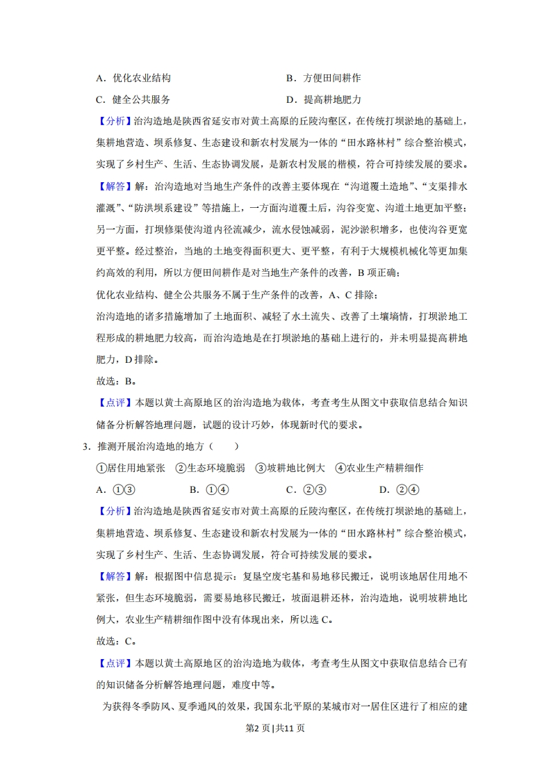2020年全国统一高考地理试卷(新课标I)◆考答案与试题解析一、选择题:本题共4小题,共44分。在每小题给出的四个选项中,只有一项是符合题目要求的。治沟造地是陕西省延安市对黄土高原的丘陵沟壑区,在传统打坝淤地的基础上,集耕地营造、坝系修复、生态建设和新农村发展为一体的“田水路林村”综合整治模式,实现了乡村生产、生活、生态协调发展(如图)。据此完成1~3题。支渠排水灌溉调整农业结构生产沟道覆土造地集约高效土地整治复垦空废宅基地←破面退耕还树生活生态宜居适度山清水秀易地移民搬迁防洪坝系建设健全公共服务1.与传统的打坝淤地工程相比,治沟造地更加关注()A.增加耕地面积B.防治水土流失C.改善人居环境D.提高作物产量【分析】读图可知,治沟造地对流域内水土资源进行合理调配和优化利用,治沟、打坝、整滩,注重生产、生活、生态这三方面。【解答】解:读图可见,与以往单纯的打坝淤地相比,既有综合的拦洪拦沙生态效益,又能够实现快速造田,可以让群众在短期内受益,因此更注重当地人居环境的改善,C对。故选:C。【点评】本题属于基础题,考查的内容是水土流失的知识点,需要结合图中治理的方法进行综合分析判断。2.治沟造地对当地生产条件的改善主要体现在()第1页1共11页A,优化农业结构B.方便田间耕作C.健全公共服务D.提高耕地肥力【分析】治沟造地是陕西省延安市对黄土高原的丘陵沟壑区,在传统打坝淤地的基础上,集耕地营造、坝系修复、生态建设和新农村发展为一体的“田水路林村”综合整治模式,实现了乡村生产、生活、生态协调发展,是新农村发展的楷模,符合可持续发展的要求。【解答】解:治沟造地对当地生产条件的改善主要体现在“沟道覆土造地”、“支渠排水灌溉”、“防洪坝系建设”等措施上,一方面沟道覆土后,沟谷变宽、沟道土地更加平整:另一方面,打坝修渠使沟道内径流减少,流水侵蚀减弱,泥沙淤积增多,也使沟谷更宽更平整。经过整治,当地的土地变得面积更大、更平整,有利于大规模机械化等更加集约高效的利用,所以方便田间耕作是对当地生产条件的改善,B项正确:优化农业结构、健全公共服务不属于生产条件的改善,A、C排除:治沟造地的诸多措施增加了土地面积、减轻了水土流失、改善了土壤墒情,打坝淤地工程形成的耕地肥力较高,而治沟造地是在打坝淤地的基础上进行的,并未明显提高耕地肥力,D排除。故选:B。【点评】本题以黄土高原地区的治沟造地为载体,考查考生从图文中获取信息结合知识储备分析解答地理问题,试题的设计巧妙,体现新时代的要求。3.推测开展治沟造地的地方()①居住用地紧张②生态环境脆弱③坡耕地比例大④农业生产精耕细作A.①③B.①④C.②③D.②④【分析】治沟造地是陕西省延安市对黄土高原的丘陵沟壑区,在传统打坝淤地的基础上,集耕地营造、坝系修复、生态建设和新农村发展为一体的“田水路林村”综合整治模式,实现了乡村生产、生活、生态协调发展,符合可持续发展的要求。【解答】解:根据图中信总提示:复垦空废宅基和易地移民搬迁,说明该地居住用地不紧张,但生态环境脆弱,需要易地移民搬迁,坡面退耕还林,治沟造地,说明坡耕地比例大,农业生产精耕细作图中没有体现出来,所以选C。故选:C。【点评】本题以黄土高原地区的治沟造地为载体,考查考生从图文中获取信息结合己有的知识储备分析解答地理问题,难度中等。为获得冬季防风、夏季通风的效果,我国东北平原的某城市对一居住区进行了相应的建第2页1共11页