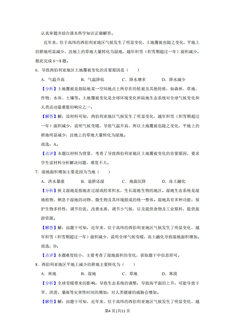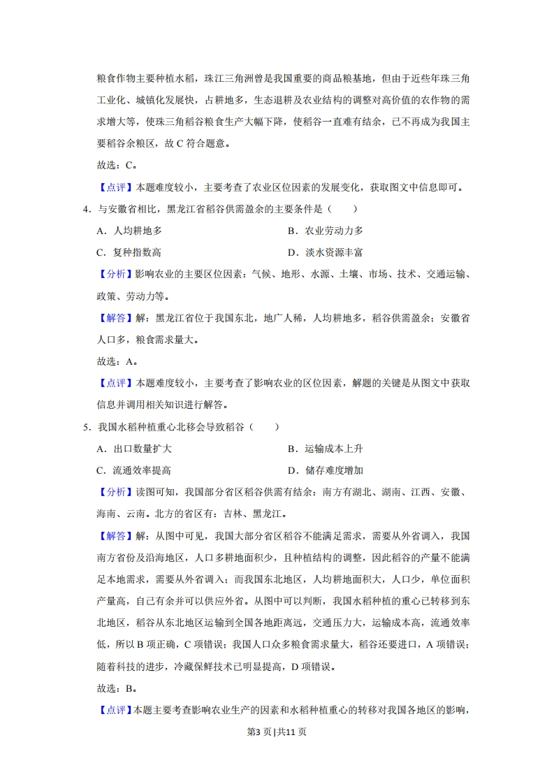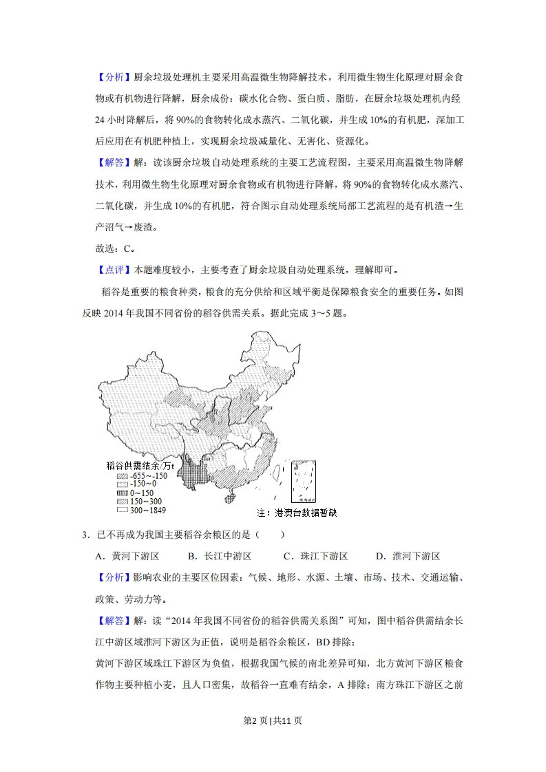 2019年全国统一高考地理试卷(新课标Ⅲ)◆考答案与试题解析一、选择题:本题共4小题,年小题8分,共44分。在每小题给出的四个选项中,只有一项是符合题目要求的。我国人口众多,生活垃圾产生量巨大,迫切需要对垃圾进行无害化、资源化处理。近些年,某企业开发了厨余垃圾自动处理系统,并在全国很多城市推广。如图示意该厨余垃圾自动处理系统的主要工艺流程。据此完成1~2题。180kg沼气发电150W·h工业油脂废渣生产沼气80m有机渣杂物分抹提取生物油脂20kg厨余垃圾1t1.厨余垃圾是图示自动处理系统中的(A.废料B.原料C.能源D.产品【分析】厨余垃圾处理机主要采用高温微生物降解技术,利用微生物生化原理对厨余食物或有机物进行降解,厨余成份:碳水化合物、蛋白质、脂肪,在厨余垃圾处理机内经24小时降解后,将90%的食物转化成水蒸汽、二氧化碳,并生成10%的有机肥,深加工后应用在有机肥种植上,实现厨余垃圾减量化、无害化、资源化。【解答】解:读该厨余垃圾自动处理系统的主要工艺流程图,厨余垃圾自动处理系统中厨余垃圾是作为无害化、资源化处理的对象,是处理系统中最初阶段的输入物,即原料。故选:B。【点评】本题难度较小,主要考查了厨余垃圾自动处理系统,理解即可。2.符合图示自动处理系统局部工艺流程的是()A.废渣→生产沼气→沼气发电B.工业油脂→提取生物油脂→有机渣C.有机渣→生产沼气→废渣D.生产沼气→有机渣→提取生物油脂第1页1共11页【分析】厨余垃圾处理机主要采用高温微生物降解技术,利用微生物生化原理对厨余食物或有机物进行降解,厨余成份:碳水化合物、蛋白质、脂肪,在厨余垃圾处理机内经24小时降解后,将90%的食物转化成水蒸汽、二氧化碳,并生成10%的有机肥,深加工后应用在有机肥种植上,实现厨余垃圾减量化、无害化、资源化。【解答】解:读该厨余垃圾自动处理系统的主要工艺流程图,主要采用高温微生物降解技术,利用微生物生化原理对厨余食物或有机物进行降解,将90%的食物转化成水蒸汽、二氧化碳,并生成10%的有机肥,符合图示自动处理系统局部工艺流程的是有机渣→生产沼气→废渣。故选:C。【点评】本题难度较小,主要考查了厨余垃圾自动处理系统,理解即可。稻谷是重要的粮食种类,粮食的充分供给和区域平衡是保障粮食安全的重要任务。如图反映2014年我国不同省份的稻谷供需关系。据此完成3~5题。稻谷供需结余/万tw☑-655-1503-15000150150-300▣300-1849注:港澳台数据暂缺3.已不再成为我国主要稻谷余粮区的是()A.黄河下游区B.长江中游区C.珠江下游区D.淮河下游☒【分析】影响农业的主要区位因素:气候、地形、水源、土壤、市场、技术、交通运输、政策、劳动力等。【解答】解:读“2014年我国不同省份的稻谷供需关系图”可知,图中稻谷供需结余长江中游区域淮河下游区为正值,说明是稻谷余粮区,BD排除:黄河下游区域珠江下游区为负值,根据我国气候的南北差异可知,北方黄河下游区粮食作物主要种植小麦,且人口密集,故稻谷一直难有结余,A排除:南方珠江下游区之前第2页|共11页