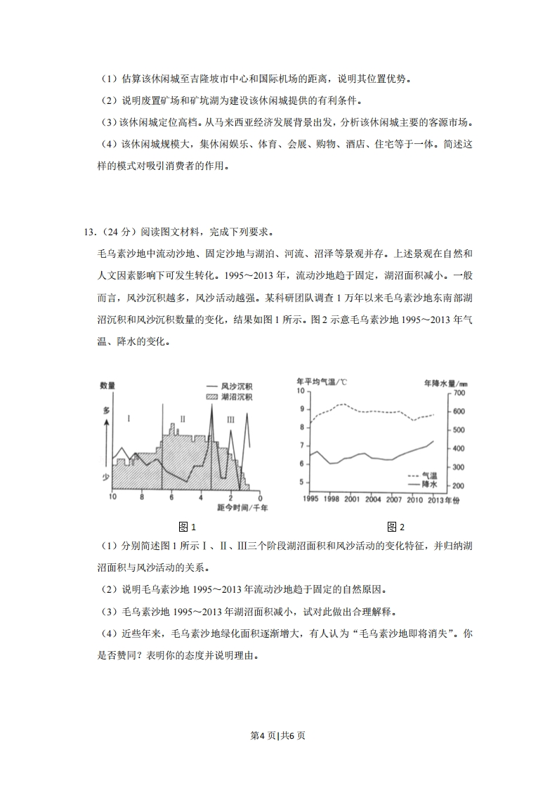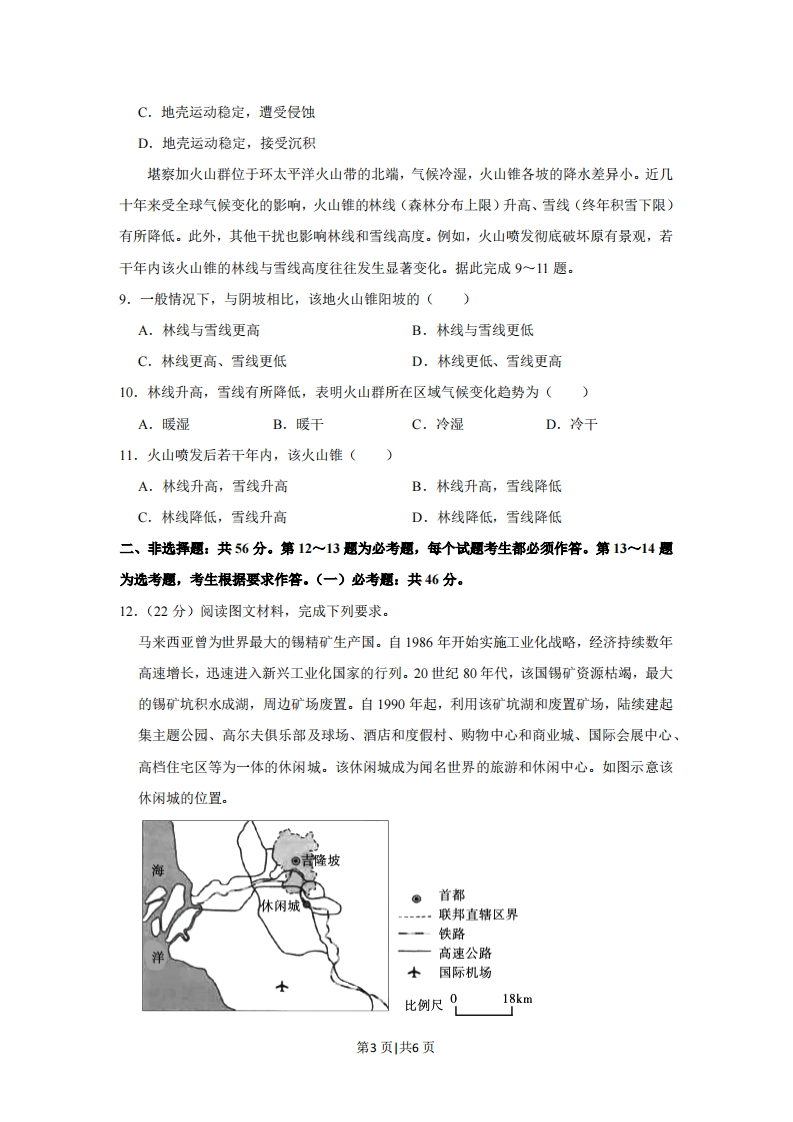 2020年全国统一高考地理试卷(新课标Ⅲ)一、选挥题:本题共4小题,共44分。在每小题给出的四个选项中,只有一项是符合题目要求的。自20世纪90年代,在经济全球化浪潮下,一些国家之间签订自由贸易协定,降低甚至取消彼此间部分商品的贸易关税,促进商品的自由贸易。如图示意汽车企业在己签订自由贸易协定的甲、乙两国的产业布局调整。据此完成1一3题。甲国乙国零部件生产厂家2原有组装厂△组装厂市场1.汽车企业将组装厂由甲国转移至乙国的主要目的是(A.创新技术B.拓展市场C.扩大规模D.降低成本2.该产业布局模式宜发生在邻国之间,主要原因是邻国之间()A.消费习惯相近B.经济发展水平相近C.运输费用较低D.研发成本差异较小3.该产业布局调整导致甲国汽车的(A.进口量增多B.出口量增多C.销售量增多D.生产量增多户籍人口与常住人口的差值可以表示当地人口常年(半年以上)外出的数量。如图显示2010年我国西部某市50岁以下各年龄组女性人数。调查表明,该市妇女生育峰值在21~29岁。据此完成46题。第1页共6页人数/万人25201510常住人口-户籍人口15-19岁25-29岁-24岁-44岁-39岁30-34岁45-49岁4.以下时间段中,该市人口出生率最高的为()A.2001~2005年B.1991~1995年C.19811985年D.1971~1975年5.造成该市20~24岁年龄组人数明显偏多的原因可能是,该组人口出生期间()A,生育政策放宽B.经济发展提速C.育龄妇女较多D.生育观念转变6.推测2010~2030年该市人口发展的变化是()A.人口出生率逐渐提高B.人口增长较为缓慢C.2025年迎来生育高峰D.人口总量逐渐减少如图示意某地质剖面,其中①指断层。据此完成7~8题。☑断层可砂砾石层口玄武岩田灰岩E回页岩四粉砂岩7.①②③④中最先形成的是(A.①B.②C.③D.④8.砂砾石层的下界为相对平坦而广阔的面。该面形成时期,所在区域可能(A.地壳持续抬升,遭受侵蚀B.地壳持续下降,接受沉积第2页共6页