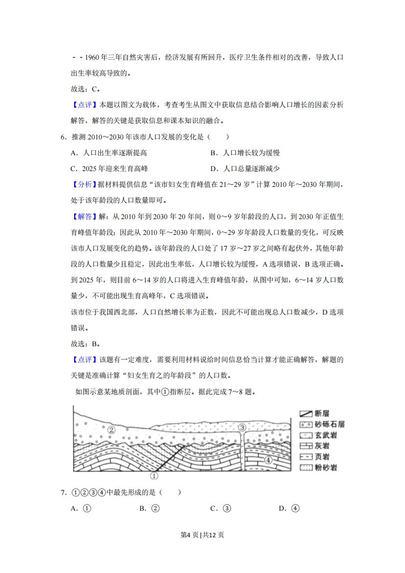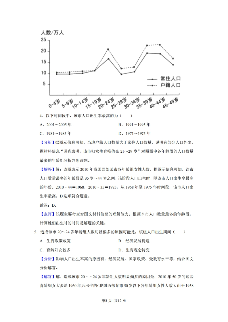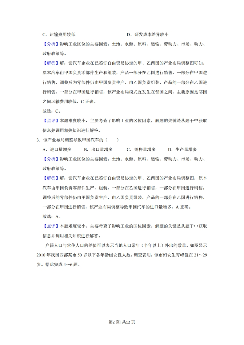 2020年全国统一高考地理试卷(新课标Ⅲ)◆考答案与试题解析一、选择题:本题共4小题,共44分。在每小题给出的四个选项中,只有一项是符合题目要求的。自20世纪90年代,在经济全球化浪潮下,一些国家之间签订自由贸易协定,降低甚至取消彼此间部分商品的贸易关税,促进商品的自由贸易。如图示意汽车企业在己签订自由贸易协定的甲、乙两国的产业布局调整。据此完成1~3题。甲国乙国O零部件生产厂家2原有组装厂△组装厂市场1.汽车企业将组装厂由甲国转移至乙国的主要目的是(A.创新技术B.拓展市场C.扩大规模D.降低成本【分析】影响产业转移的因素:①劳动力因素:由于处于不断变化中,因此具有数量充足、高素质且价格低廉的劳动力资源的国家或地区,往往成为产业转移的目的地。②内部交易成本因素,③市场因素,④其他因素:国际经济形势的变化、国家政策的调整、土地规模和价格、环境污染。【解答】解:结合材料可知,汽车组装厂不是技术指向型的,A错误:组装厂在甲国布局的时候,汽车市场分布在甲国和乙国,说明没有拓展市场,B错误:材料中没有体现组装厂的规模,C错误:将汽车组装厂转移到乙国,是因为乙国生产成本低,可以降低生产成本,D正确。故选:D。【点评】该题目难度中等,解答此题,关键在于读图,要求学生较强材料阅读和分析能力,能从材料中较快的获得有用的地理信息。2.该产业布局模式宜发生在邻国之间,主要原因是邻国之间()A.消费习惯相近B.经济发展水平相近第1页1共12页C.运输费用较低D.研发成本差异较小【分析】影响工业区位的主要因素:土地、水源、原料、运输、劳动力、市场、动力、政府政策等。【解答】解:读汽车企业在己签订自由贸易协定的甲、乙两国的产业布局调整图可知,原本汽车由甲国负责零部件生产和组装,产品一部分在乙国进行销售,一部分在甲国进行销售,调整后为零部件仍由甲国负责生产,由乙国负责组装,产品的一部分在乙国进行销售,一部分在甲国进行销售,该产业布局模式宜发生在邻国之间,主要原因是邻国之间运输费用较低,C正确。故选:C。【点评】本题难度较小,主要考查了影响工业的区位因素,解题的关键是从题干中获取信息并调用相关知识进行解答。3.该产业布局调整导致甲国汽车的()A,进口量增多B.出口量增多C.销售量增多D.生产量增多【分析】影响工业区位的主要因素:土地、水源、原料、运输、劳动力、市场、动力、政府政策等。【解答】解:读汽车企业在己签订自由贸易协定的甲、乙两国的产业布局调整图,原本汽车由甲国负责零部件生产、组装,一部分在乙国进行销售,一部分在甲国进行销售,调整后的零部件仍由甲国负责生产,由乙国负责组装,产品的一部分在乙国进行销售,一部分在甲国进行销售,该产业布局调整导致甲国汽车的进口量增多,A正确。故选:A【点评】本题难度较小,主要考查了影响工业的区位因素,解题的关键是从题干中获取信息并调用相关知识进行解答。户籍人口与常住人口的差值可以表示当地人口常年(半年以上)外出的数量。如图显示2010年我国西部某市50岁以下各年龄组女性人数。调查表明,该市妇女生育峰值在21~29岁。据此完成46题。第2页1共12页
