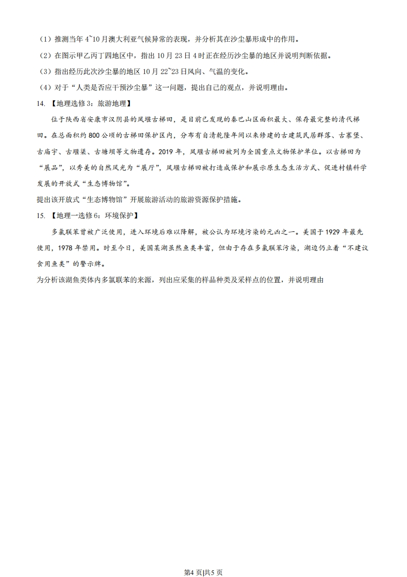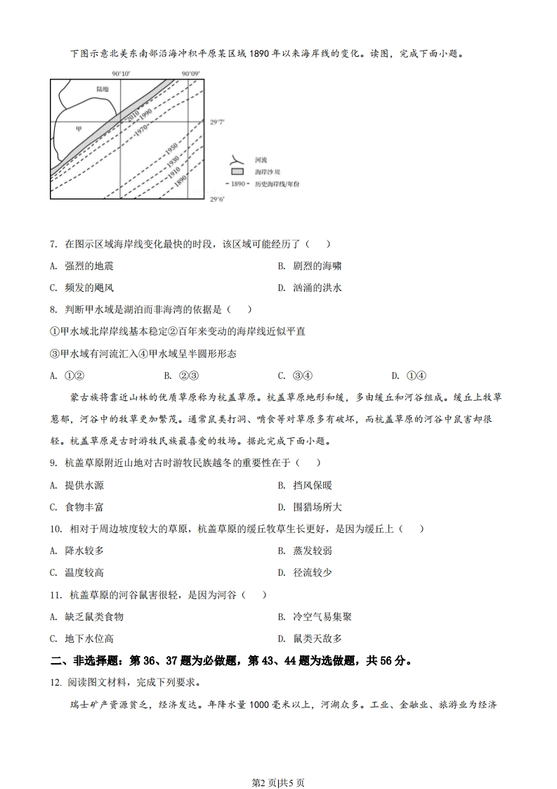 2022年普通高等学校招生全国统一考试(全国甲卷)地理一、选择题:本题共11小题,每小题4分,共44分。在每小题给出的四个选项中,只有一项是符合题目要求的。浙江S集团是一家研发和生产空调控制元件和零部件的企业,其生产的零部件占全球智能空调配件市场60%以上的份颜。至2017年,S集团除国内工厂外,还在美国、墨西哥、波兰等国家建有工厂。其国内工厂生产的产品除供应国内市场外,还满足出口需求。2018年,在国内工厂产能饱和、订单不断增长的情况下,S集团入驻越南某工业园,在买地自建厂房的同时,租用厂房开展生产。据此完成下面小题。1.影响S集团在美国、墨西哥、波兰等国家建厂的主要区位因素是()A.技术B.市场C原材料D.劳动力2.与国内建厂相比,S集团选择在越南建厂,可以()A降低生产成本B.增加产品产量C.提高产品质量D.方便原料供应3.推测入驻越南的S集团在自建厂房的同时租用厂房的主要目的是()A减少投资B.提升企业形象C.支持园区建设D.满足客户需求近年来,吉林、河南两省相继提出实施“秸秆变肉”工程和“秸秆变肉换奶”计划。一是重点推进秸秆饲料化进程(2021年吉林、河南秸秆产量分别为4000万吨和6550万吨):二是稳妥推进具有良好经济与生态意义的“粮改饲”工作,即在玉米产区规模化种植青贮玉米、甜高粱、首蓿等饲料作物,以满足肉牛等发展需求。据此完成下面小题。4.导致吉林、河南两省年秸秆产量差异的主要因素是()A.年降水量B.作物结构C.耕地质量D.作物熟制5.在玉米产区推广“粮改饲”的经济意义是()A提高秸秆产量B.增加秸秆种类C.调整农牧结构D.推动种植技术进步6.体现“粮改饲”生态意义的农事是()①作物轮作②土壤深翻③圈舍养殖④土地平整A.①③B.①④C.②③D.②④第1页供5页下图示意北美东南部沿海冲积平原某区域1890年以来海岸线的变化。读图,完成下面小题。90100009陆地297-1970---1950河道-1910“✉淘岸沙堤=1890一1890·历史海岸线/年份2967.在图示区域海岸线变化最快的时段,该区域可能经历了()A.强烈的地震B.剧烈的海啸C.频发的飓风D.汹涌的洪水8.判断甲水域是湖泊而非海湾的依据是()①甲水域北岸岸线基本稳定②百年来变动的海岸线近似平直③甲水域有河流汇入④甲水域呈半圆形形态A.①②B.②③C.③④D.①④蒙古族将靠近山林的优质草原称为杭盖草原。杭盖草原地形和缓,多由缓丘和河谷组成。缓丘上牧草葱郁,河谷中的牧草更加繁茂。通常鼠类打洞、啃食等对草原多有破坏,而杭盖草原的河谷中鼠害却很轻。杭盖草原是古时游牧民族最喜爱的牧场。据此完成下面小题。9.杭盖草原附近山地对古时游牧民族越冬的重要性在于()A.提供水源B.挡风保暖C.食物丰富D.围猎场所大10.相对于周边坡度较大的草原,杭盖草原的缓丘牧草生长更好,是因为缓丘上()A.降水较多B.蒸发较弱C.温度较高D.径流较少11.杭盖草原的河谷鼠害很轻,是因为河谷()A.缺乏鼠类食物B.冷空气易集聚C.地下水位高D.鼠类天敌多二、非选择题:第36、37题为必做题,第43、44题为选做题,共56分。12.阅读图文材料,完成下列要求。瑞士矿产资源贫乏,经济发达。年降水量1000毫米以上,河湖众多。工业、金融业、旅游业为经济第2页供5页