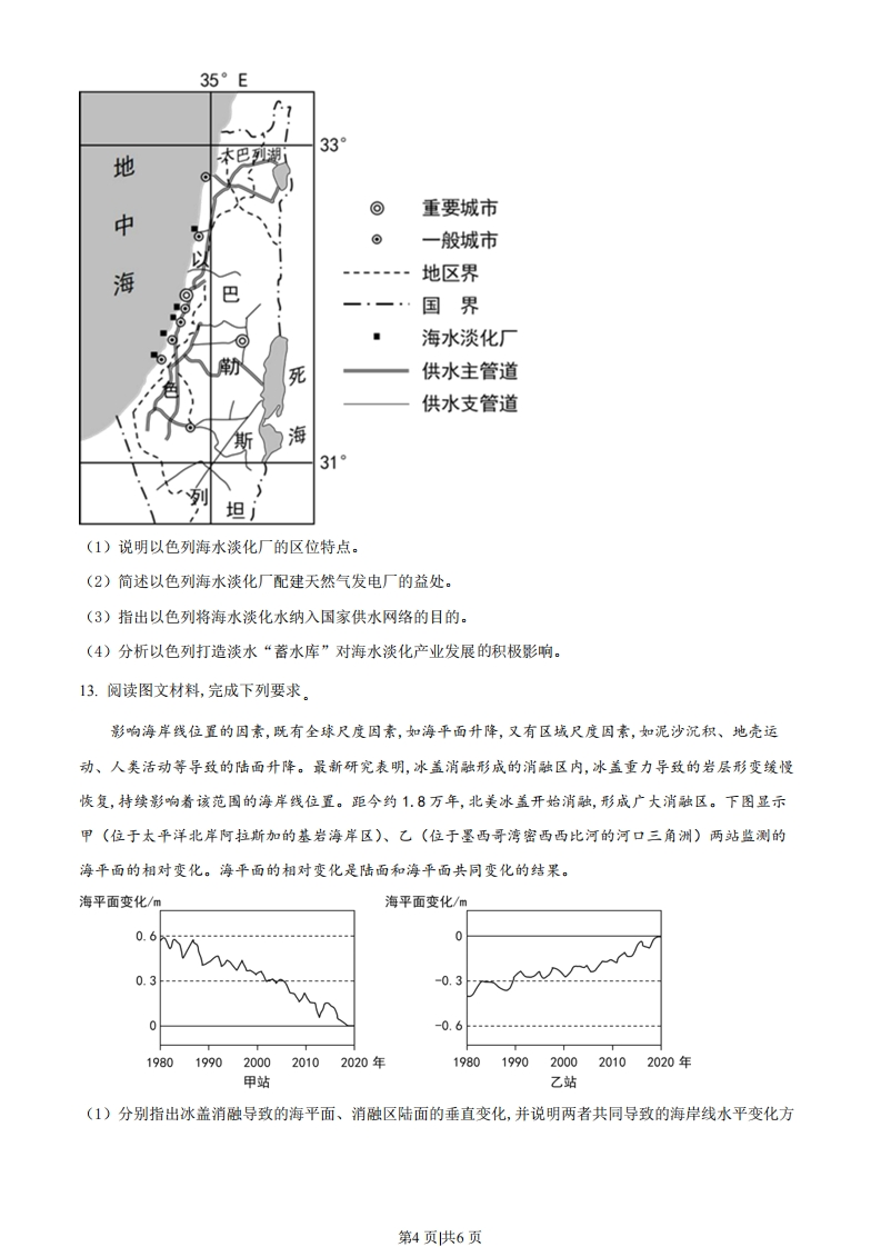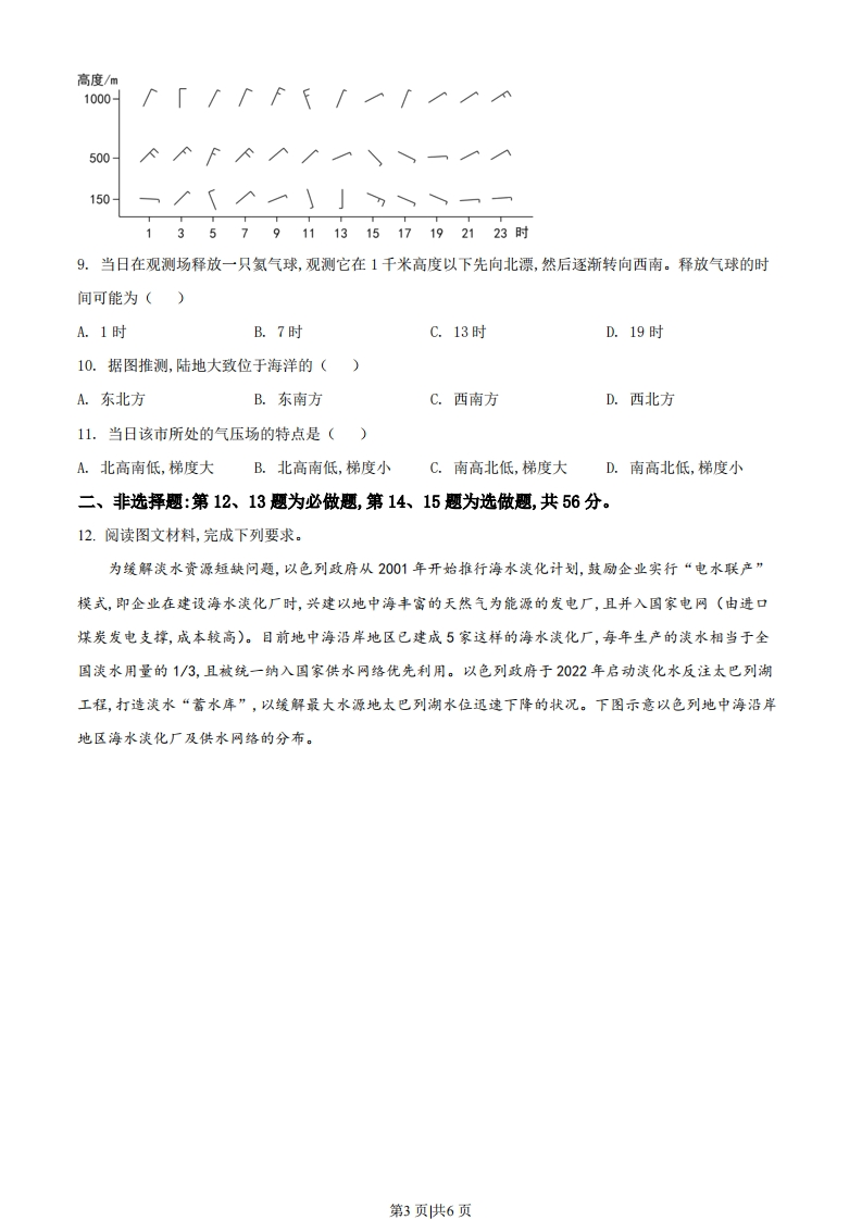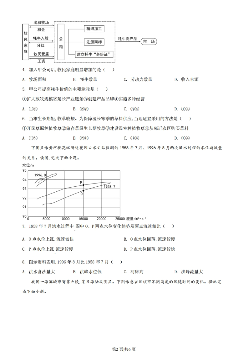 2022年普通高等学校招生全国统一考试(全国乙卷)地理一、选释题:本题共11小题,每小题4分,共44分。在每小题给出的四个选项中,只有一项是符合题目要求的。中心城区通常为城市中人口最密集的区域。下表数据显示上海、北京、广州、深圳四城市2010年中心城区人口比重及20102020年中心城区和中心城区以外地区人口数量的变化。据此完成下面小题。2010年中心城2010-2020年中心城2010-2020年中心城区以城市区人口比重/%区人口变化/万人外地区人口变化/万人上海30.3-30.25215.42北京59.7-72.8300.9广州39.7129.12468.46深圳34.0116.88596.731.2010~2020年四城市人口变化的共同特点是()A.总人口增加,中心城区人口比重下降B.总人口减少,中心城区人口比重上升C.总人口增加,中心城区人口比重上升D.总人口减少,中心城区人口比重下降2.与四城市人口变化共同特点类似的中国其他城市,一般具有()A.相似的空间形态B.趋同的主导产业C.一致的功能定位D.相近的等级规模3.根据四城市人口变化特点,城市规划应该引导()A.人口向中心城区再集聚B.人口在中心城区以外地区集聚C.中心城区核心功能疏解D.人口在中心城区以外地区均衡布局当雄是拉萨唯一的纯牧业县,牧民占比约90%,依托特色畜种牦牛,走产业扶贫之路。甲公司成立于2017年初,采取“公司十农户”的模式(下图),生产的有“身份证”的牦牛肉产品销往全国各地,广受消费者欢迎。据此完成下面小题。第1页供6页出租牧场精细加工举租金牦牛入股牦牛肉产品注册商标市场家分红司修牧民受雇建立牦牛“身份证”工资4.加入甲公司后,牧民家庭明显增加的是()A.牧场面积B.牦牛数量C.劳动力数量D.收入来源5.甲公司提高牦牛价值的主要途径是()①扩大放牧规模②延长产业链条③创建产品品牌④实施多种经营A.①②B.②③C.③④D.①④6.当雄生长期短,牧草较矮。为保障漫长寒季的草料供应,当地适宜采用的方法是()①开垦草原种植牧草②储存草原生长期牧草③建设温室种植牧草④从邻近农区购买草料A.①②B.②③C.③④D.①④下图显示黄河桃花峪附近花园口水文站监测的1958年7月、1996年8月两次洪水过程的水位与流量的关系。读图,完成下面小题。水位/m951996.894931958.792”900500010000150002000025000流量/m3.s17.1958年7月洪水过程中图中0、P两点水位变化趋势及两点流速相比()A.0点水位上涨,流速较快B.0点水位回落,流速较慢C.P点水位上涨流速较慢D.P点水位回落,流速较快8.图示资料表明,1996年8月比1958年7月()A.洪水含沙量大B.洪峰水位低C.河床高D.洪峰流量大我国一海滨城市背靠丘陵,莱日海陆风明显。下图示意当日该市不同高度的风随时间的变化。据此完成下面小题。第2页供6页