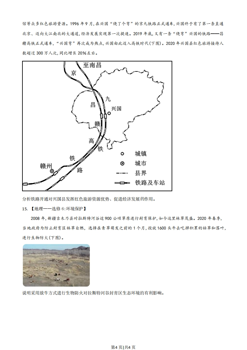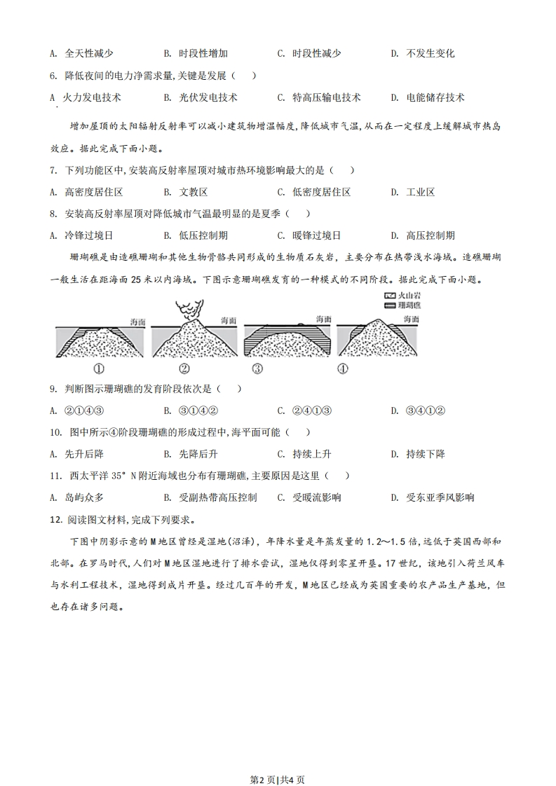 2021年普通高等学校招生全国统一考试(甲卷)地理试题医用注射剂瓶和用于加工它的玻璃管的生产过程对水、空气等环境条件要求严苛。世界最大的高端玻璃管生产企业德国某公司,通过对浙江丽水、四川成都、江苏无锡等地比较,最终选定在具有相关产业和生态环境优良的丽水某山间小镇建生产厂;2017年,从德国进口高端玻璃管制成医用注射剂瓶的生产厂投产;2020年,高端玻璃管生产厂投产。完成下面小题。1.该公司选择在中国建生产厂,主要是因为中国()A.原材料充足B.市场广阔C.技术先进D.劳动力价格低2.该公司最终选定在丽水建生产厂,看中的主要人文地理条件是()A.基础设施B.商业氛围C.科研实力D.配套产业3.丽水山间小镇的生态环境也是吸引该公司投资的重要条件。这说明与大城市相比,该公司在山间小镇建生产厂,可以()A.提高产品质量B.降低车间环境净化成本C.增加产品产量D.降低废弃物处理成本2011年日本福岛核泄漏事件之后,德国宣布逐步放弃核电而重点发展光伏发电。下图示意2014年某日德国电力总需求和电力净需求的变化(电力净需求量=电力总需求量一光伏发电量)。据此完成下面小题。电力需求量/GW电力总需求量807电力净需求量光伏发电量增加200%时60电力净需求量预测402006115182124格林尼治时间时-20-40J4.图中所示这一天所在的月份是()A.3月B.6月C.9月D.12月5.随着光伏发电量的增加,电力净需求量()第1页1共4页A.全天性减少B.时段性增加C.时段性减少D.不发生变化6.降低夜间的电力净需求量,关键是发展()A火力发电技术B.光伏发电技术C.特高压输电技术D.电能储存技术增加屋顶的太阳辐射反射率可以减小建筑物增温幅度,降低城市气温,从而在一定程度上缓解城市热岛效应。据此完成下面小题。7.下列功能区中,安装高反射率屋顶对城市热环境影响最大的是()A.高密度居住区B.文教区C.低密度居住☒D.工业区8.安装高反射率屋顶对降低城市气温最明显的是夏季()A.冷锋过境日B.低压控制期C.暖锋过境日D.高压控制期珊瑚礁是由造礁珊瑚和其他生物骨骼共同形成的生物质石灰岩,主要分布在热带浅水海域。造礁珊瑚一般生活在距海面25米以内海域。下图示意珊瑚礁发育的一种模式的不同阶段。据此完成下面小题。☑火山岩□用礁海面海面海面①③③9.判断图示珊瑚礁的发育阶段依次是()A.②①④③B.③①④②C.②④①③D.③④①②10.图中所示④阶段珊瑚礁的形成过程中,海平面可能()A.先升后降B.先降后升C.持续上升D.持续下降11.西太平洋35°N附近海域也分布有珊瑚礁,主要原因是这里()A.岛屿众多B.受副热带高压控制C.受暖流影响D.受东亚季风影响12.阅读图文材料,完成下列要求。下图中阴影示意的M地区曾经是湿地(沼泽),年降水量是年蒸发量的1.2~1.5倍,远低于英国西部和北部。在罗马时代,人们对M地区湿地进行了排水尝试,湿地仅得到零星开垦。17世纪,该地引入荷兰风车与水利工程技术,湿地得到成片开垦。经过几百年的开发,M地区已经成为英国重要的农产品生产基地,但也存在诸多问题。第2页1共4页