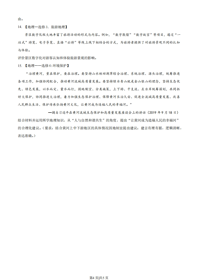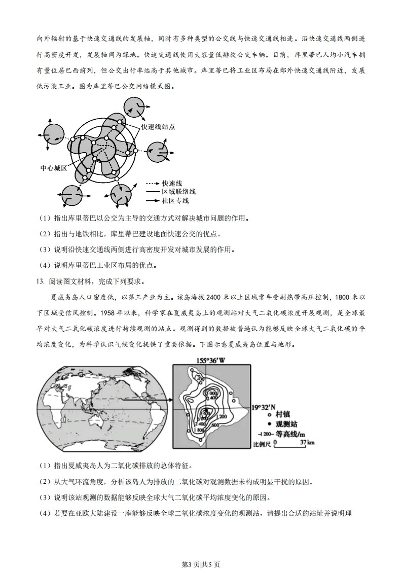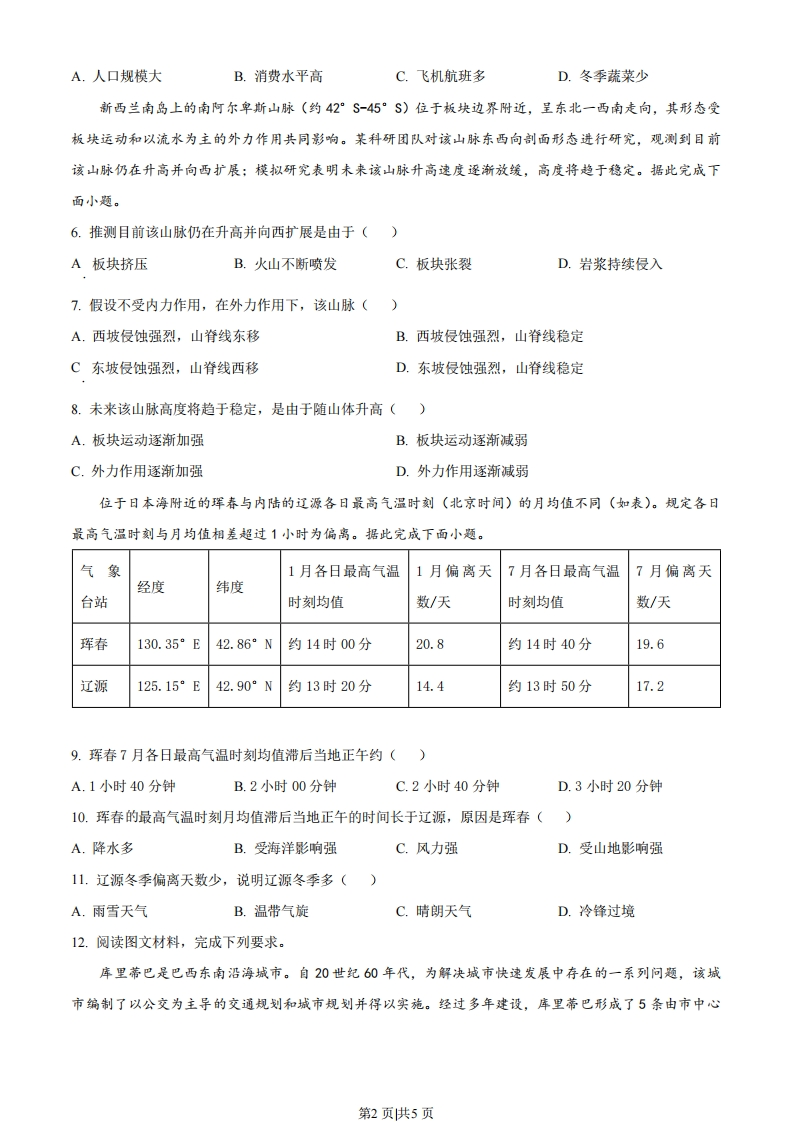 2023年全国高考乙卷地理试题2000年以后,世界打火机生产中心转移到湖南省邵东市。邵东市由原来几家生产作坊快速形成打火机全产业链布局,并相继成立打火机行业协会和打火机出口监管委员会。2009年,多家企业组建了一家集研发、组装、销售于一体的龙头企业。目前,邵东市每年生产的一次性打火机占世界同类打火机总产量的70%。据此完成下面小题1.邵东打火机全产业链布局快速形成的主要原因是()①打火机产业生产链短②打火机产业附加值低③当地有打火机创新技术④当地有打火机产业基础A.①③B.①④C.②③D.②④2.邵东打火机产业发展过程中龙头企业的主要作用是()A.控制各企业发展规模B.协调与外地生产联系C.监督产品质量与价格D.引领产品研发和营销3.除技术创新外,支撑邵东打火机产业长期发展的关键因素是()①快捷的对外交通②稳定的市场需求③有效的企业组织④较高的产品价格A.①②B.②③C.③④D.①④豌豆尖是冬季时令蔬莱。贵州龙里腕豆尖生产历史长、品质优,然而售价低,主要供应周边市场。2016年,龙里豌豆尖被认证为国家地理标志保护产品。近年来,通过与蔬莱经销商合作,利用快速冷链运输,龙里碗豆尖以较高价格畅销少数城市(如图)。据此完成下面小题北京上海贵阳龙里州深圳澳门香港一快速冷链运输4.如今龙里豌豆尖能够以较高价格畅销的关键是()①提高销售价格②扩大种植规模③拓展销售渠道④保持产品新鲜A①②B.②③C.③④D.①④5.龙里豌豆尖主要供应少数城市,是因为这些城市()第1页供5页A.人口规模大B.消费水平高C.飞机航班多D.冬季蔬菜少新西兰南岛上的南阿尔卑斯山脉(约42°$-45°S)位于板块边界附近,呈东北一西南走向,其形态受板块运动和以流水为主的外力作用共同影响。某科研团队对该山脉东西向剖面形态进行研究,观测到目前该山脉仍在升高并向西扩展:模拟研究表明未来该山脉升高速度逐渐放缓,高度将趋于稳定。据此完成下面小题。6.推测目前该山脉仍在升高并向西扩展是由于()A板块挤压B.火山不断喷发C.板块张裂D.岩浆持续侵入7.假设不受内力作用,在外力作用下,该山脉()A.西坡侵蚀强烈,山脊线东移B.西坡侵蚀强烈,山脊线稳定C东坡侵蚀强烈,山脊线西移D.东坡侵蚀强烈,山脊线稳定8.未来该山脉高度将趋于稳定,是由于随山体升高()A.板块运动逐渐加强B.板块运动逐渐减弱C.外力作用逐渐加强D.外力作用逐渐减弱位于日本海附近的珲春与内陆的辽源各日最高气温时刻(北京时间)的月均值不同(如表)。规定各日最高气温时刻与月均值相差超过1小时为偏离。据此完成下面小题。气象1月各日最高气温1月偏离天7月各日最高气温7月偏离天经度纬度台站时刻均值数/天时刻均值数/天珲春130.35°E42.86°N约14时00分20.8约14时40分19.6辽源125.15°E42.90°N约13时20分14.4约13时50分17.29.珲春7月各日最高气温时刻均值滞后当地正午约()A.1小时40分钟B.2小时00分钟C.2小时40分钟D.3小时20分钟10.珲春的最高气温时刻月均值滞后当地正午的时间长于辽源,原因是珲春()A.降水多B.受海洋影响强C.风力强D.受山地影响强11.辽源冬季偏离天数少,说明辽源冬季多()A.雨雪天气B.温带气旋C.睛朗天气D.冷锋过境12.阅读图文材料,完成下列要求。库里蒂巴是巴西东南沿海城市。自20世纪60年代,为解决城市快速发展中存在的一系列问题,该城市编制了以公交为主导的交通规划和城市规划并得以实施。经过多年建设,库里蒂巴形成了5条由市中心第2页供5页