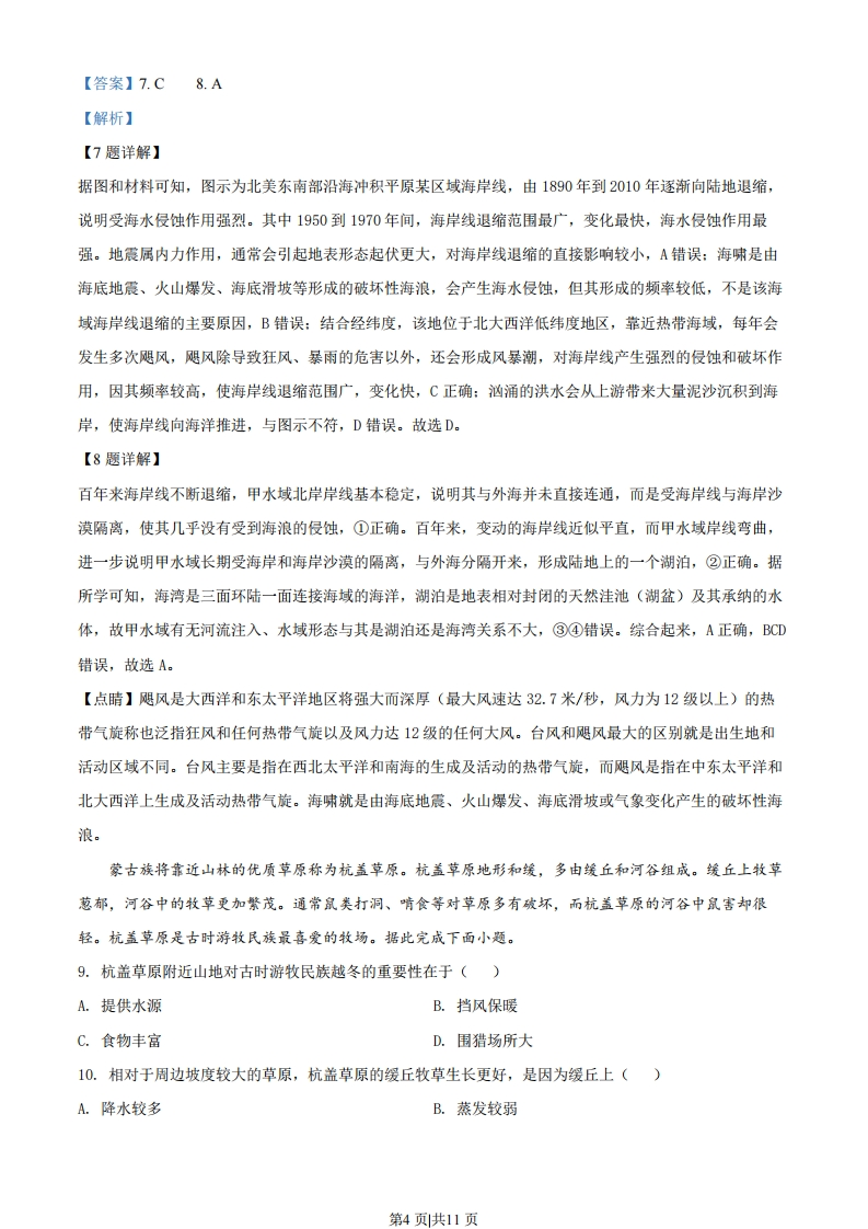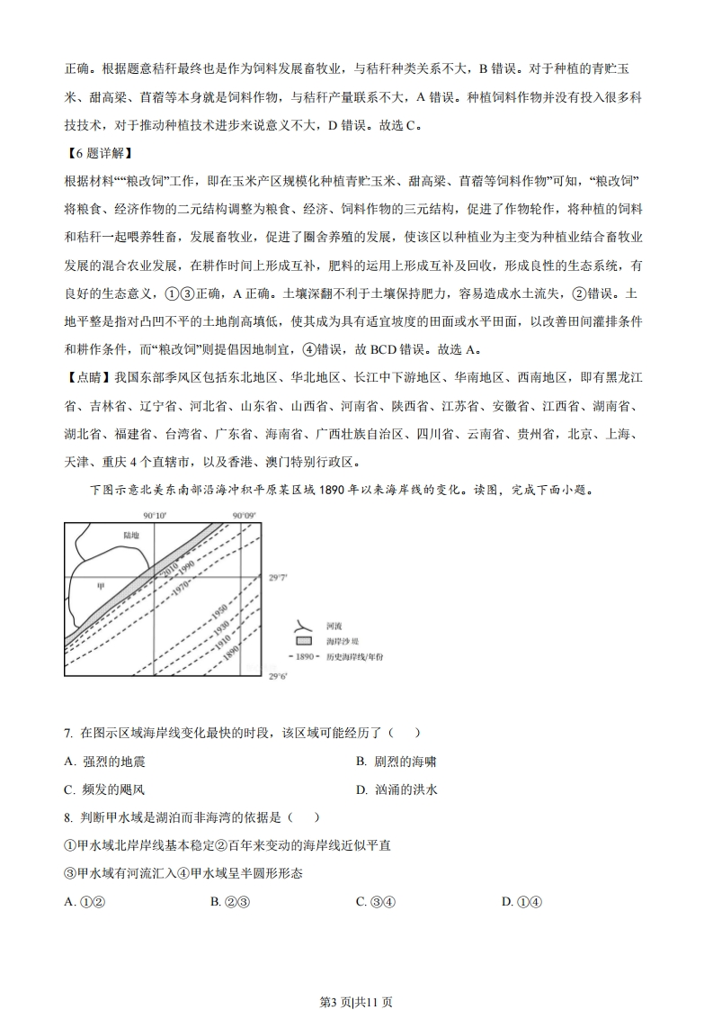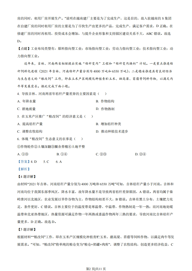 2022年普通高等学校招生全国统一考试(全国甲卷)地理一、选择题:本题共11小题,每小题4分,共44分。在每小题给出的四个选项中,只有一项是符合题目要求的。浙江S集团是一家研发和生产空调控制元件和零部件的企业,其生产的零部件占全球智能空调配件市场60%以上的份颜。至2017年,S集团除国内工厂外,还在美国、墨西哥、波兰等国家建有工厂。其国内工厂生产的产品除供应国内市场外,还满足出口需求。2018年,在国内工厂产能饱和、订单不断增长的情况下,S集团入驻越南某工业园,在买地自建厂房的同时,租用厂房开展生产。据此完成下面小题。1.影响S集团在美国、墨西哥、波兰等国家建厂的主要区位因素是()A.技术B.市场C.原材料D.劳动力2.与国内建厂相比,S集团选择在越南建厂,可以()A.降低生产成本B.增加产品产量C.提高产品质量D.方便原料供应3.推测入驻越南的S集团在自建厂房的同时租用厂房的主要目的是()A.减少投资B.提升企业形象C.支持园区建设D.满足客户需求【答案】1.B2.A3.D【解析】【1题详解】根据材料“至2017年,S集团除国内工厂外,还在美国、墨西哥、波兰等国家建有工厂。其国内工厂生产的产品除供应国内市场外,还满足出口需求。”说明其生产的产品市场需求大,在美国、墨西哥、波兰等国建厂的主要区位因素是市场,B正确。墨西哥与我国相比,没有明显的技术优势,而我国原材料和劳动力更具优势,故ACD错误,故选B。【2题详解】2.材料“2018年,在国内工厂产能饱和、订单不断增长的情况下,S集团入驻越南某工业园”说明在越南建厂主要是为了完成生产,这是目的,与国内建厂相比,在越南建厂并不能增加产品产量,B错误。而越南相对我国来说,经济相对落后,地价和劳动力价格等低廉,故与我国国内建厂相比,生产成本更低,A正确。CD错误。故选A。【3题详解】材料“2018年,在国内工厂产能饱和、订单不断增长的情况下,S集团入驻越南某工业园,在买地自建厂第1页共11页房的同时,租用厂房开展生产。”说明在越南建厂主要是为了完成生产,这是目的,故入驻越南的S集团在自建厂房的同时租用厂房的主要是为了尽快生产出更多的产品,完成生产,满足客户需求,D正确。在修建厂房的同时再租用,投资成本会增加,与提升企业形象和支持园区建设关系不大,ABC错误。故选D.【点睛】工业布局类型有:原料指向型工业:市场指向型工业:劳动力指向型工业:技术指向型工业:动力指向型工业。近年来,吉林、河南两省相继提出实施“秸秆变肉”工程和“秸秆变肉换奶”计划。一是重点推进秸杆饲料化进程(2021年吉林、河南秸杆产量分别为4000万吨和6550万吨):二是稳妥推进具有良好经济与生态意义的“粮改饲”工作,即在玉米产区规模化种植青贮玉米、甜高粱、首蓿等饲料作物,以满足肉牛等发展需求。据此完成下面小题。4.导致吉林、河南两省年秸秆产量差异的主要因素是()A.年降水量B.作物结构C.耕地质量D.作物熟制5.在玉米产区推广“粮改饲”的经济意义是()A.提高秸秆产量B.增加秸秆种类C.调整农牧结构D.推动种植技术进步6.体现“粮改饲”生态意义的农事是()①作物轮作②土壤深翻③圈舍养殖④土地平整A.①③B.①④C.②③D.②④【答案】4.D5.C6.A【解析】【4题详解】由材料“2021年吉林、河南秸秆产量分别为4000万吨和6550万吨”可知,吉林秸秆产量小于河南。吉林和河南均位于我国东部季风区,降水丰富,故年降水量不是导致两省秸秆差异原因,A错误。两省均属于秦岭淮河以北地区,农业发展以旱作谷物为主,作物结构相差不大,B错误。吉林有黑土分布,土壤肥力充足,条件更好,C错误。吉林主要位于的温度带是寒温带、中温带,作物熟制是一年一熟:而河南地处暖温带和北亚热带地区,热量资源可满足作物一年两熟或喜温作物两年三熟的要求,导致河南比吉林秸秆产量更多,D正确。故选D。【5题详解】根据材料“粮改饲”工作,即在玉米产区规模化种植青贮玉米、甜高梁、苜蓿等饲料作物,以满足肉牛等发展需求。”可知,“粮改饲将单纯的粮仓变为“粮仓+奶罐+肉库”,调整了农牧结构,创造更多经济收益,C第2页共11页