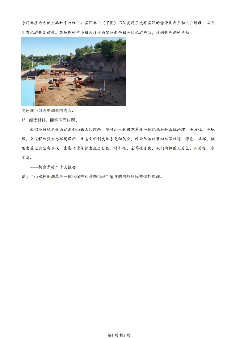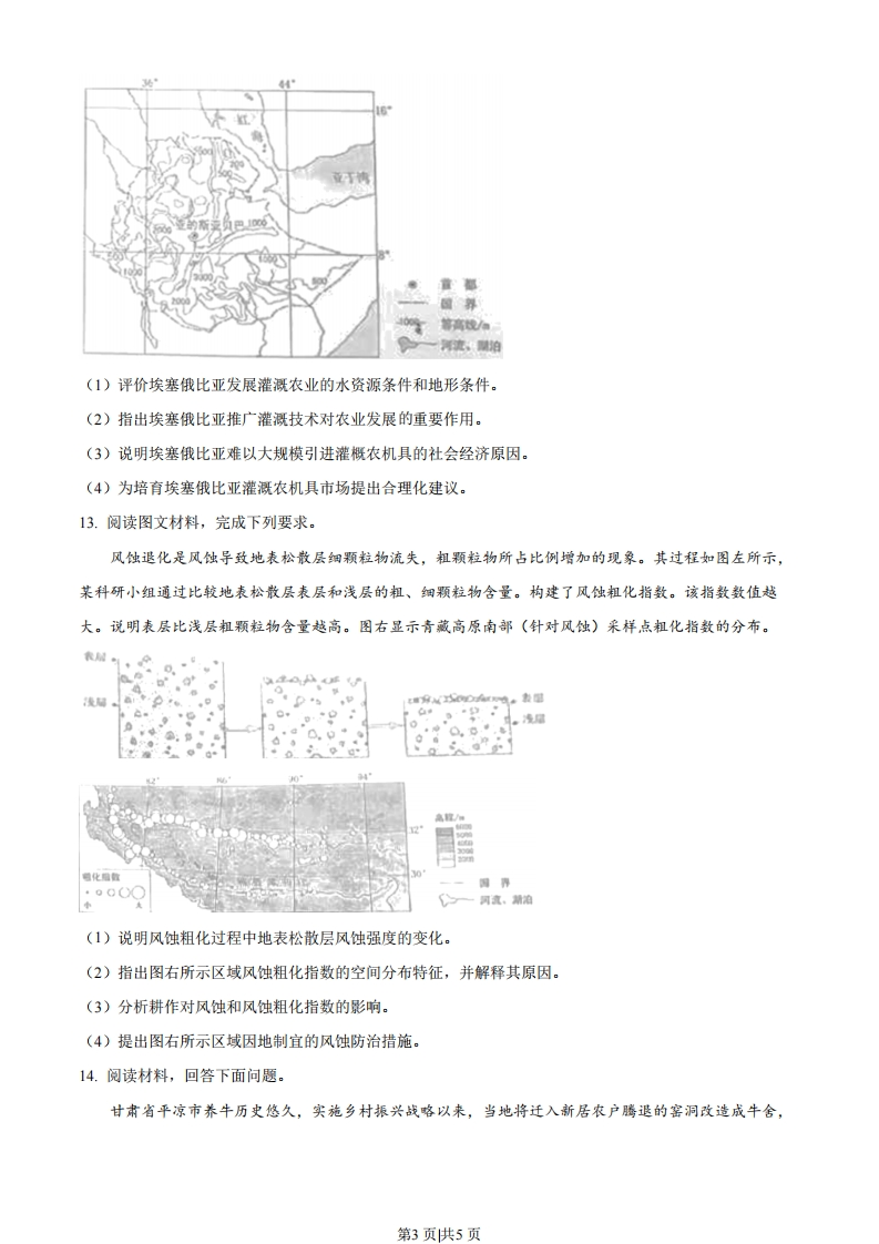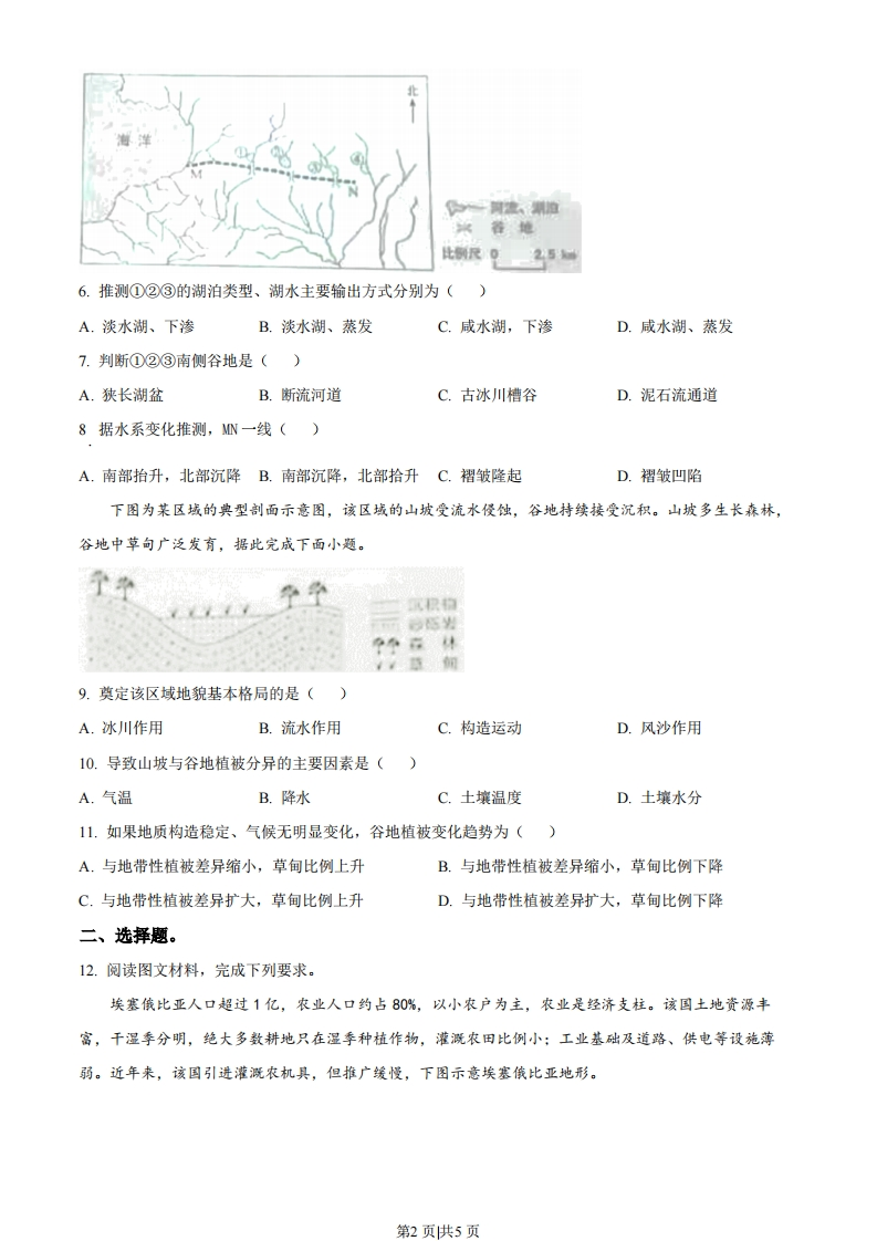 地理一、选择题。2005年前后,福建泉州开始购买国外优良而昂贵的胡萝卜种子,在沿海沙质土地进行大规模种植。产品主要出口东亚、东南亚国家,成为全国重要的胡萝卜出口基地。2020年,泉州与中国农业科学院合作培育的胡萝卜种子已接近国际先进水平,替代了进口种子,当地海关也助力胡萝卜出口基地发展,全程跟踪胡萝卜生产过程,并保障产品及时通关,据此完成下面小题。1.泉州成为全国重要胡萝卜出口基地的主要原因是()①胡萝卜精深加工能力强②拥有优良港口③胡萝卜品质优且产量大④铁路运输发达A.①②B.②③C.③④D.①④2.实现进口种子替代对泉州胡萝卜产业发展的重要作用是()A.明显提高胡萝卜产量B.明显提高胡萝卜质量C.增加胡萝卜出口国家D.增加胡萝卜种植收益3.泉州海关助力胡萝卜出口基地发展,重点关注胡萝卜的()①新鲜程度②出口关税③出口数量④食用安全A.①②B.②③C.③④D.①④技术进步对人口分布有重要作用,1790~1870年,随着蒸汽机等技术的应用,美国人口更加趋向技术进步,美国的用水来源结构随之变化,河流对人口分布的重要性相对减弱,据此完成下面小题。4.影响17901870年美国人口分布变化趋势的主要因素是()①工业②农业③内河运输④公路运输A①③B.①④C.②③D.②④5.1870年后,美国用水来源结构发生变化,主要表现为()A.河流水比例上升B.河流水用量减少C.地下水比例上升D.地下水用量最多下图显示地中海北岸某地水系分布,①②③④为湖泊,其中①②③分别与入湖河流构成独立水系。研究者在野外考察中发现,①②③南侧高地上均存在谷地,谷底卵石推积,研究表明该地曾发生过水系重组。据此完成下面小题。第1页供5页一调速、期遍6.推测①②③的湖泊类型、湖水主要输出方式分别为()A.淡水湖、下渗B.淡水湖、蒸发C.咸水湖,下渗D.咸水湖、蒸发7.判断①②③南侧谷地是(A.狭长湖盆B.断流河道C.古冰川槽谷D.泥石流通道8据水系变化推测,MN一线()A.南部抬升,北部沉降B.南部沉降,北部拾升C.褶皱隆起D.褶皱凹陷下图为某区域的典型剖面示意图,该区域的山坡受流水侵蚀,谷地持续接受沉积。山坡多生长森林,谷地中草甸广泛发育,据此完成下面小题。风积信)5岩学行精(草们9.奠定该区域地貌基本格局的是()A.冰川作用B.流水作用C.构造运动D.风沙作用10.导致山坡与谷地植被分异的主要因素是()A.气温B.降水C.土壤温度D.土壤水分11.如果地质构造稳定、气候无明显变化,谷地植被变化趋势为()A.与地带性植被差异缩小,草甸比例上升B.与地带性植被差异缩小,草甸比例下降C.与地带性植被差异扩大,草甸比例上升D.与地带性植被差异扩大,草甸比例下降二、选择题。12.阅读图文材料,完成下列要求。埃塞俄比亚人口超过1亿,农业人口约占80%,以小农户为主,农业是经济支柱。该国土地资源丰富,干湿季分明,绝大多数耕地只在湿季种植作物,灌溉农田比例小:工业基础及道路、供电等设施薄弱。近年来,该国引进灌溉农机具,但推广缓慢,下图示意埃塞俄比亚地形。第2页供5页
